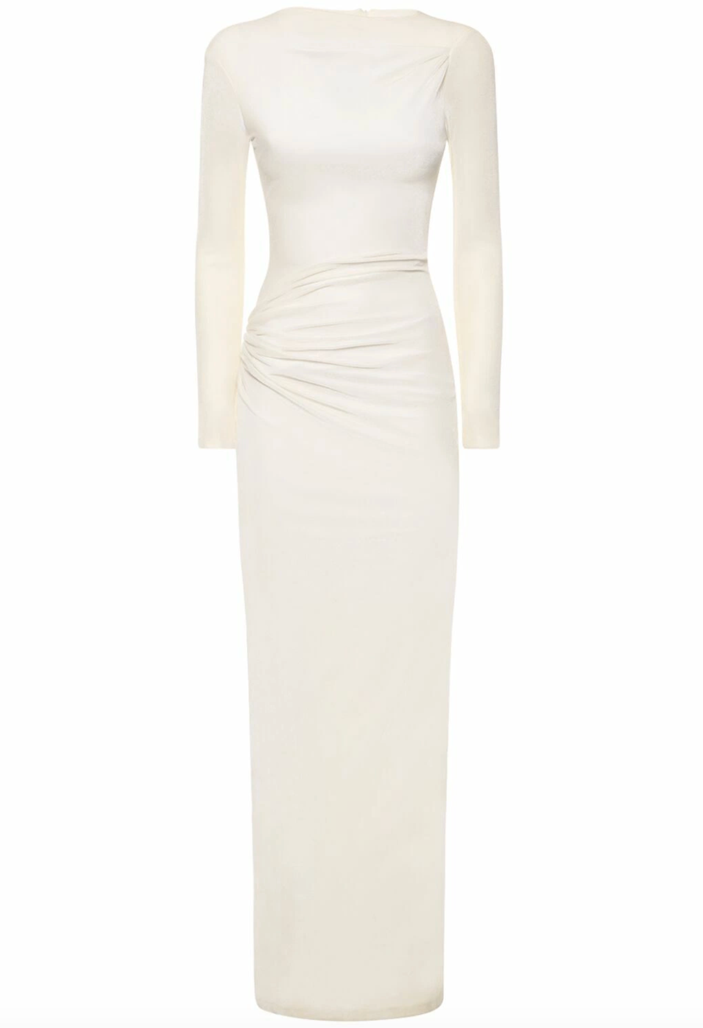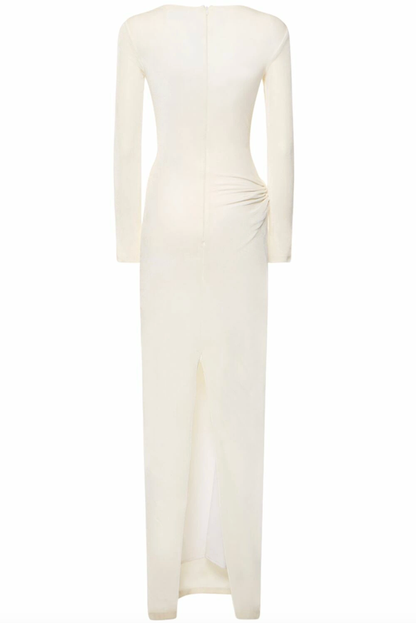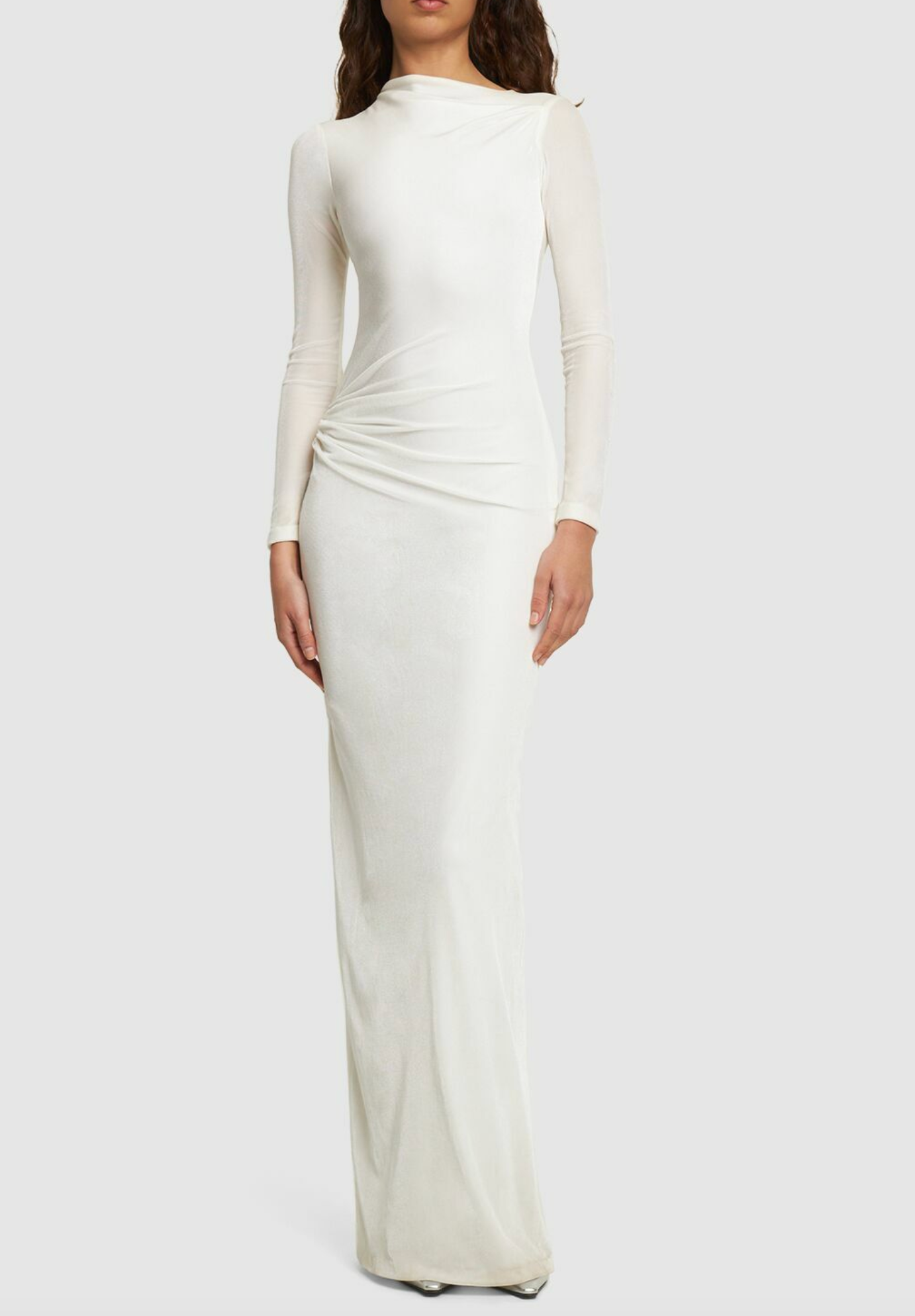 Design: This is a long-sleeved, floor-length gown featuring artful ruched and draped detailing across the hip to accentuate the silhouette. It includes a boat neck or high neckline and a back slit for ease of movement.