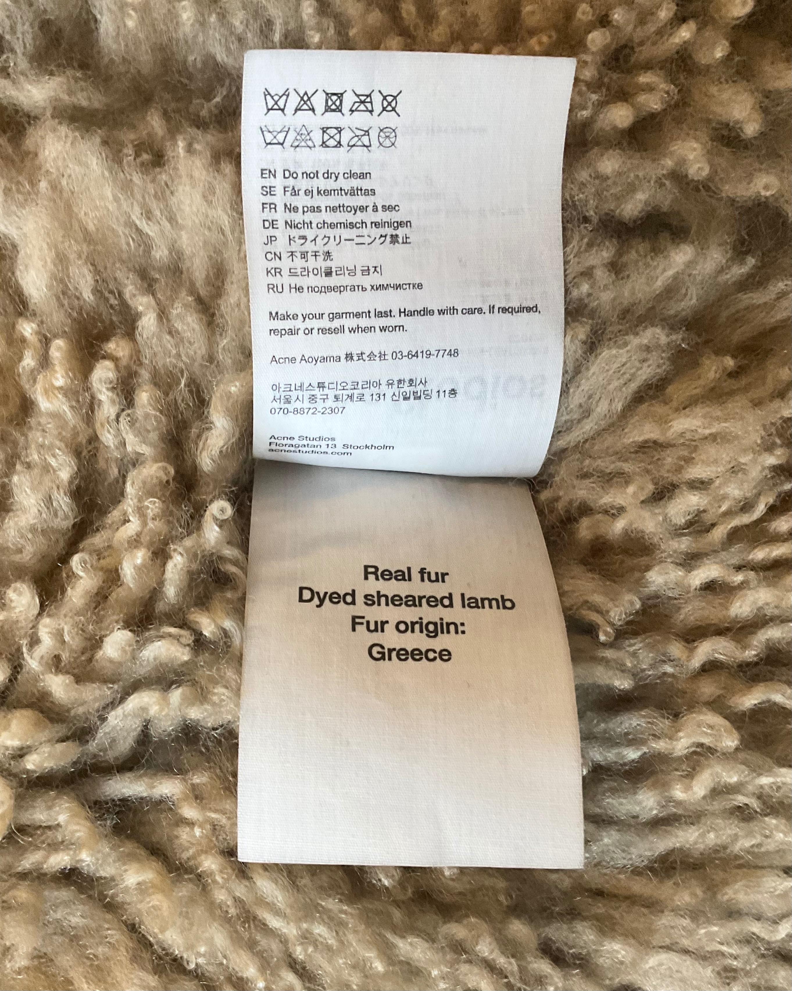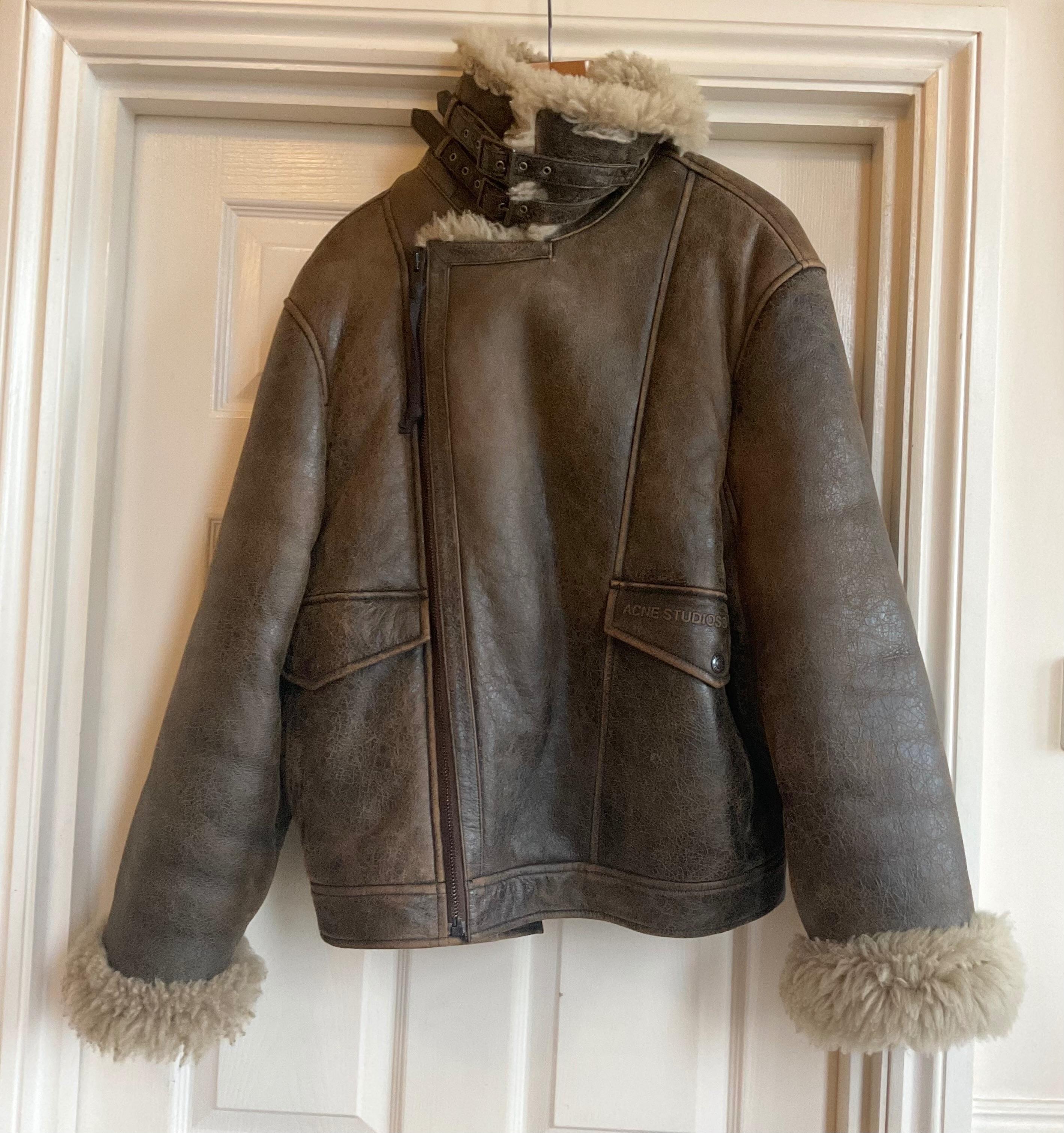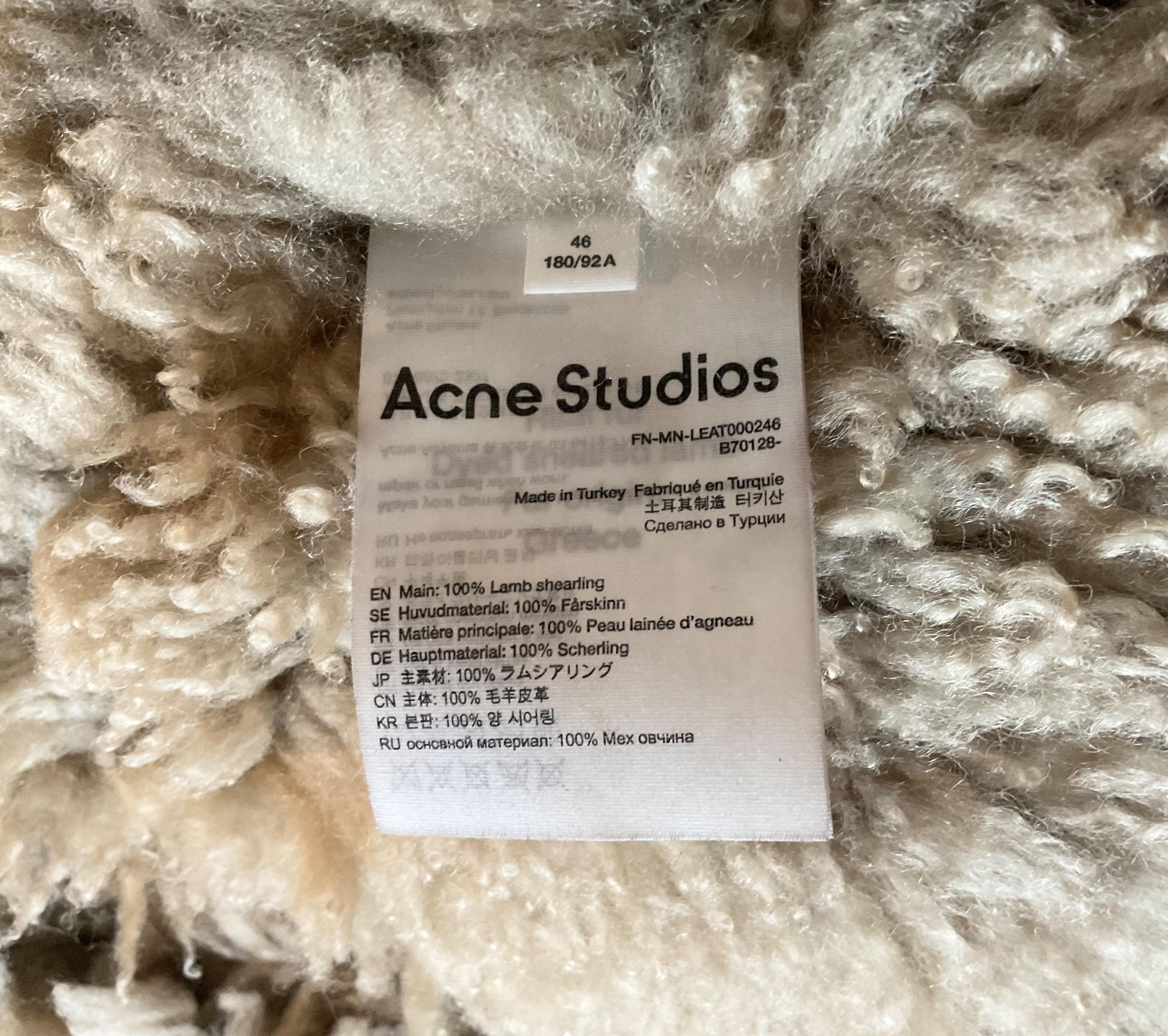 Acne Studios Lamb Shearling jacket. Recent Collection.Used leather effect. Size 46 would also fit woman Uk 12/14. Fits large and boxy this is so warm and comfortable.Purchased for £2600.00 from Liberty of London worn 3 times excellent condition. Pit to pit about 20”. Hem at bottom 20”. Shoulders 20/21”. Length 26” nape to hem. Thick fabric so a little smaller on the inside.Please message any questions, offers or ask for more measurements.