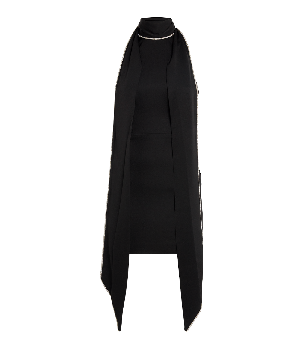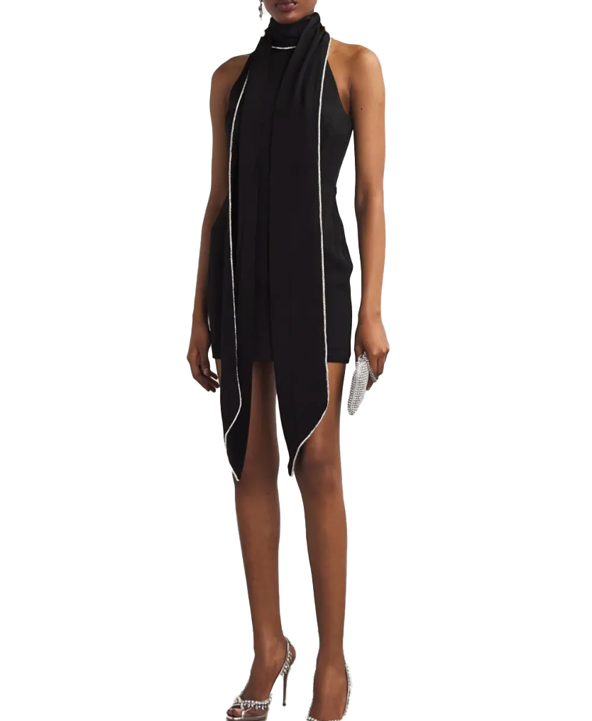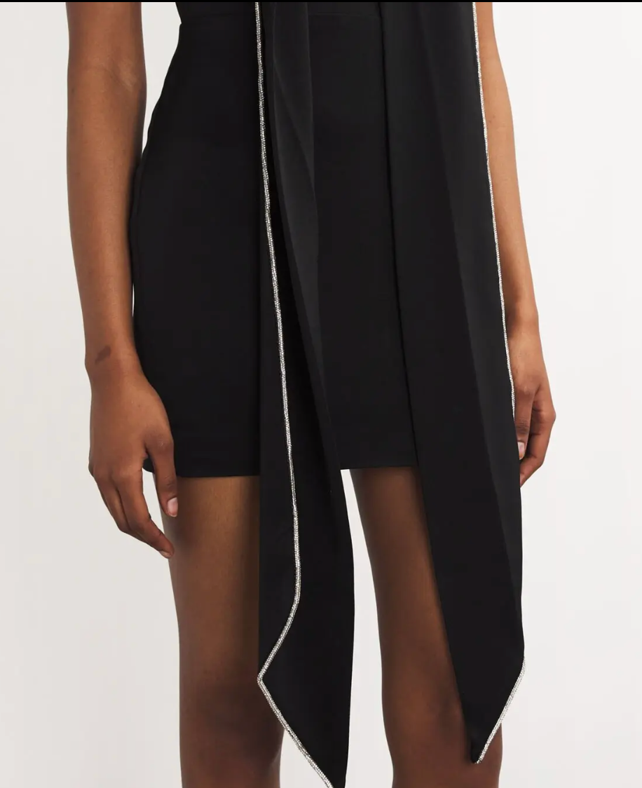 This mini dress from Alex Perry features a signature scarf detail, with long draping trims that can be left untied for a flowing effect or tied into bows and knots for an elegant aesthetic. The attached scarf is embellished with glittering crystals, which is a signature detail of the Australian label.