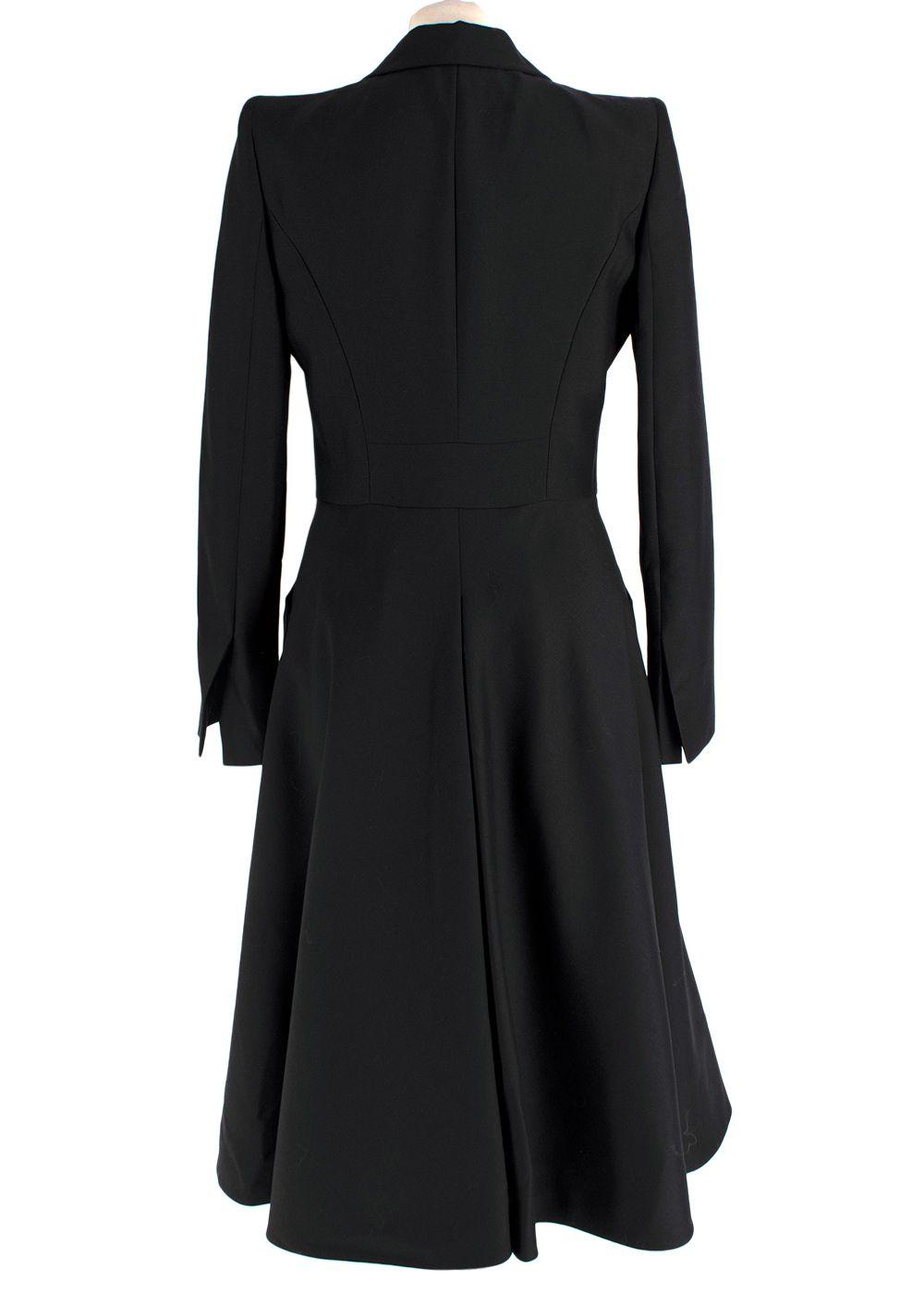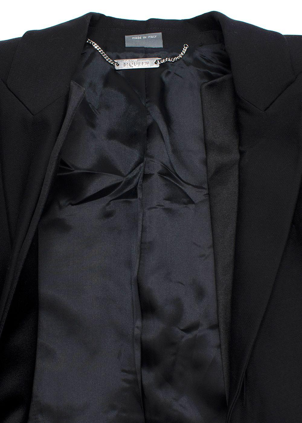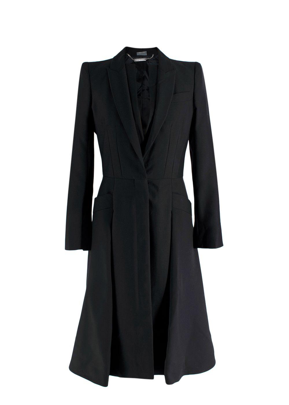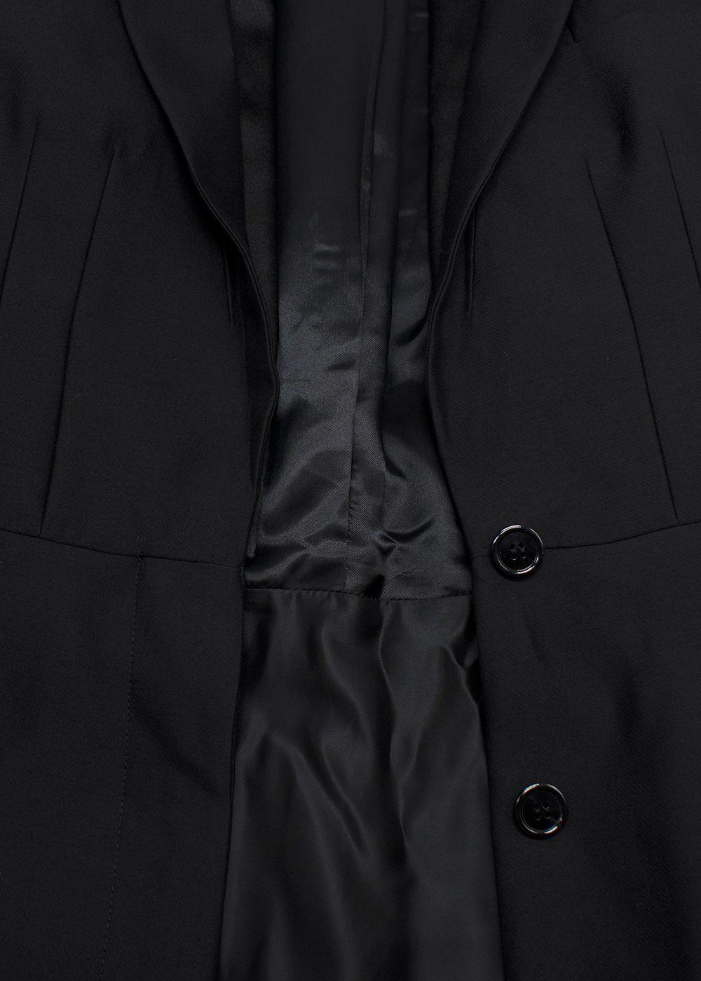 Details: Concealed front button fastening, peak lapels, and deep rear/side box pleats.