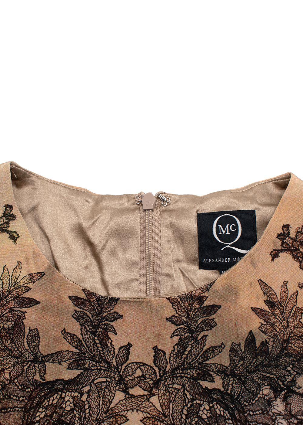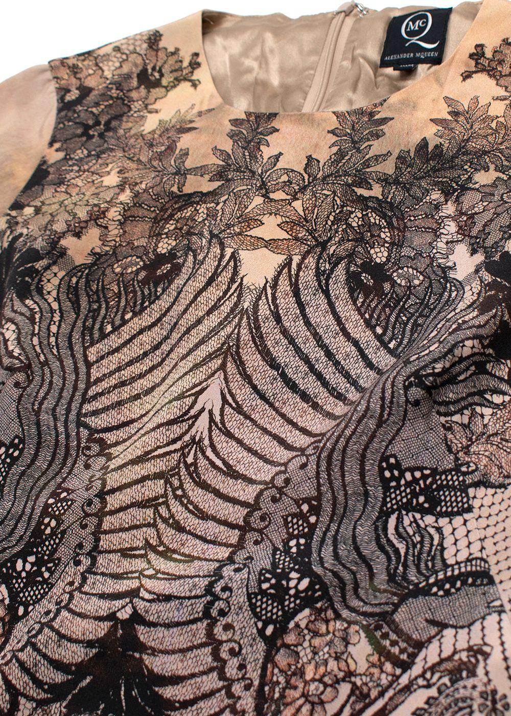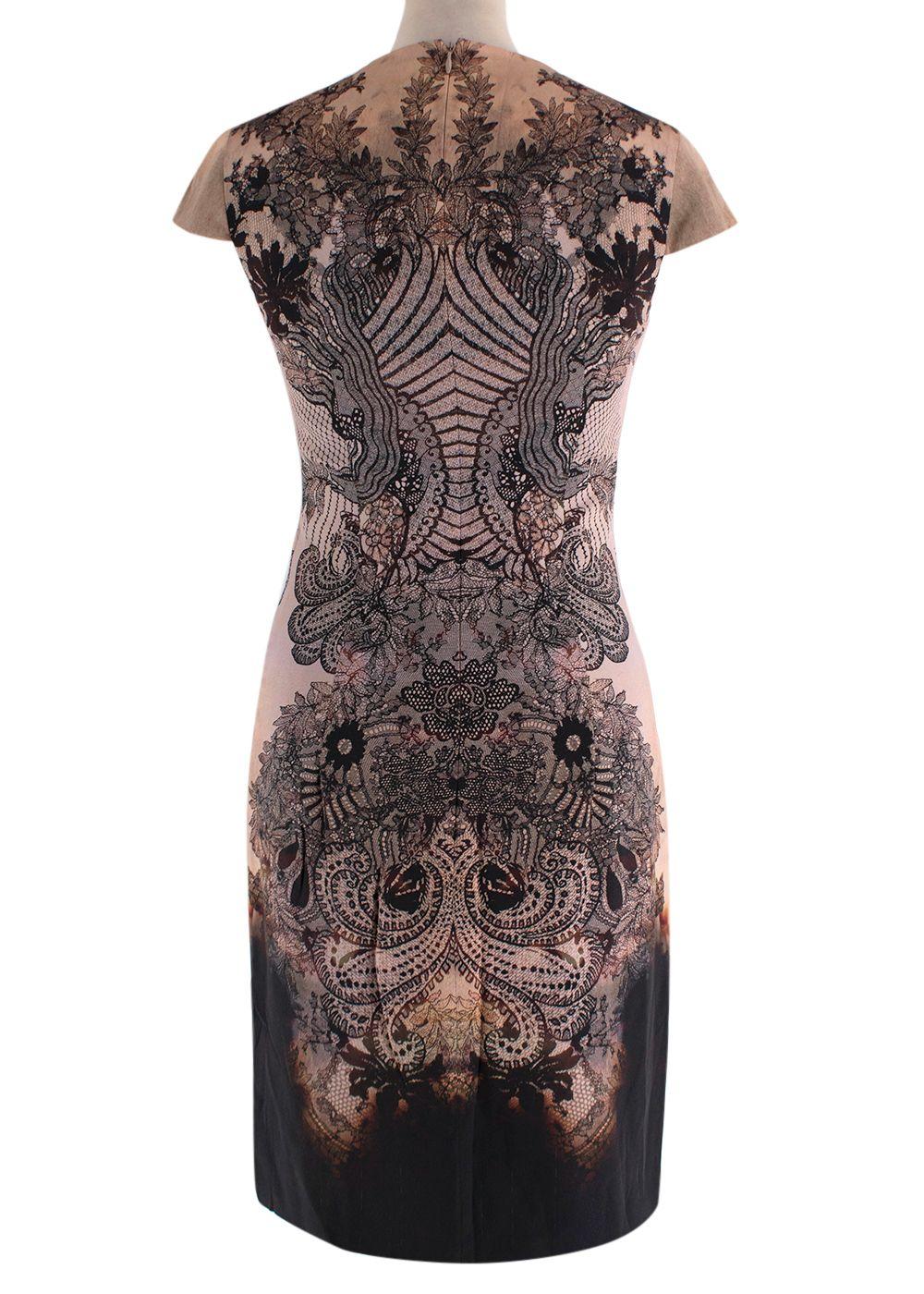 This is an Alexander McQueen McQ fitted sheath dress featuring an intricate black lace-effect botanical print over a warm beige/nude background. The piece has a cap-sleeve silhouette, a back zip closure, and a luxurious silk-blend lining. The pattern is highly detailed, with a symmetrical, almost tapestry-like design that gives the dress a dramatic, sculpted look.