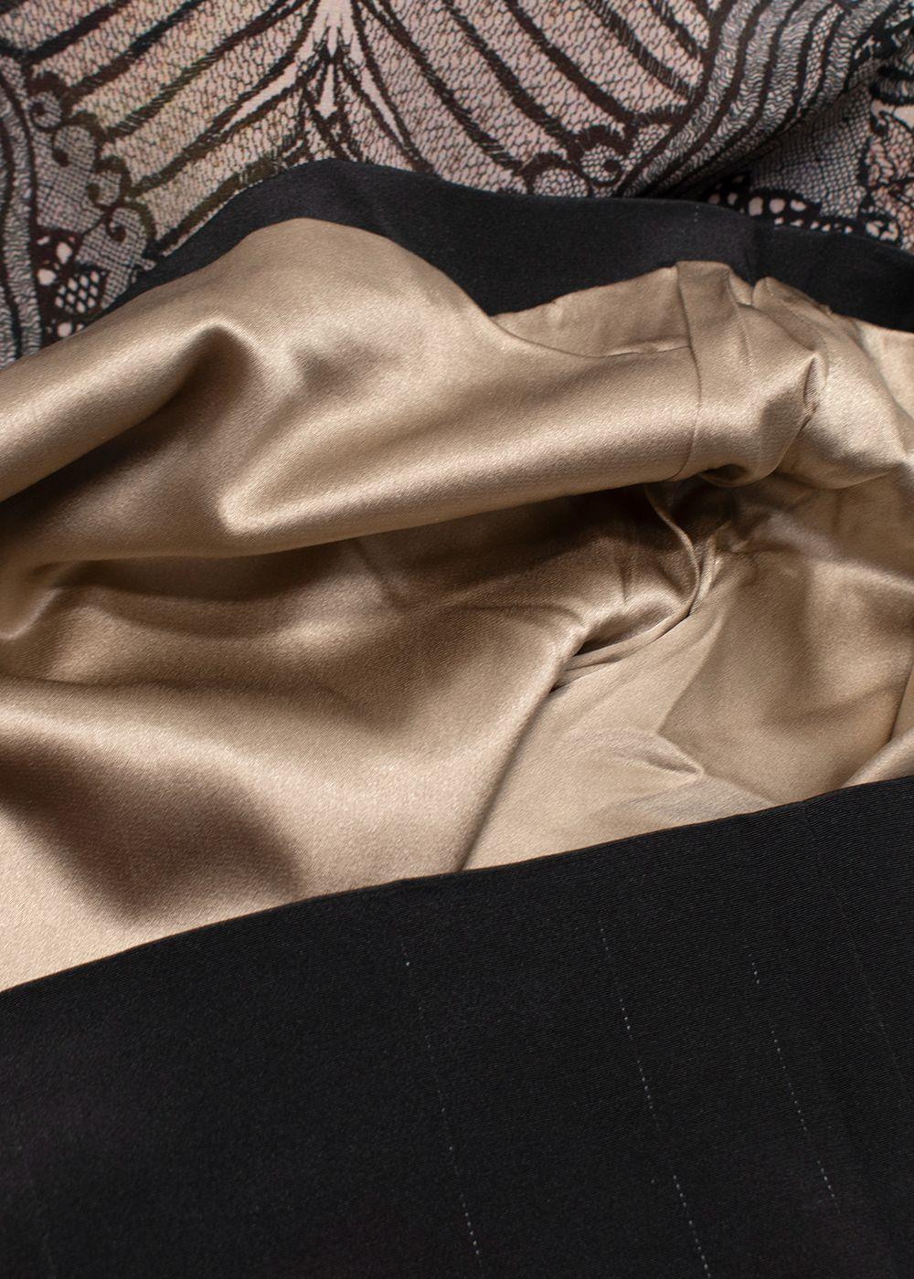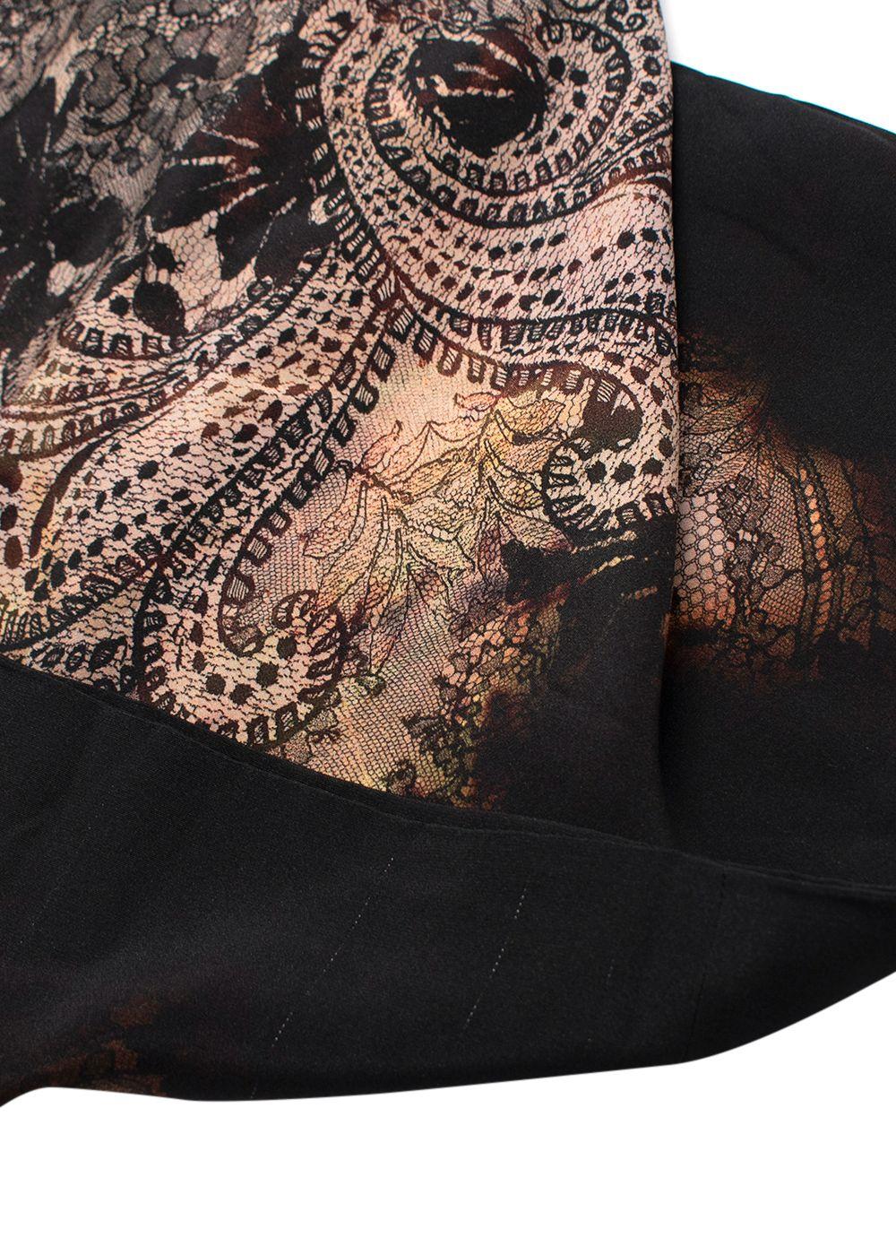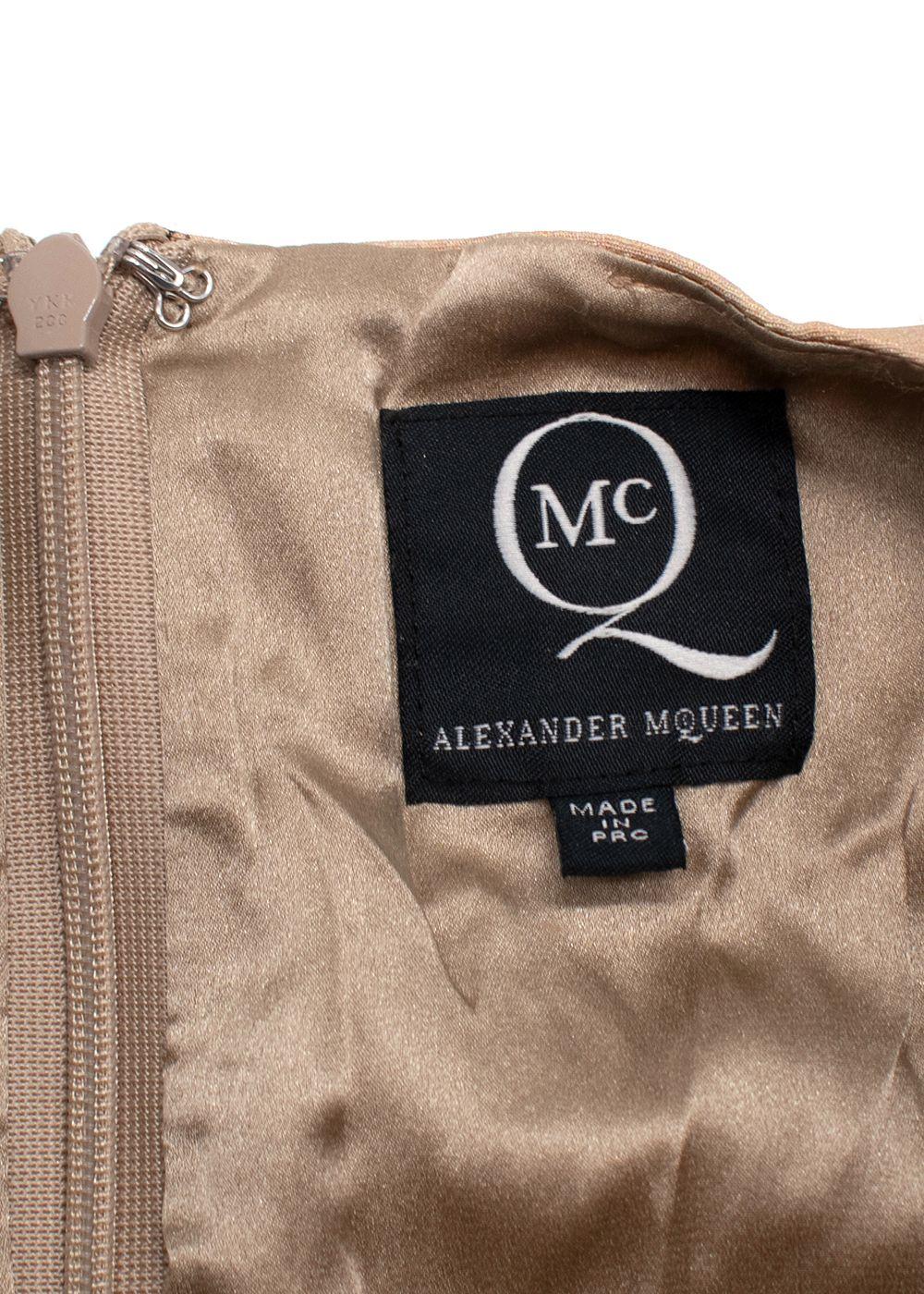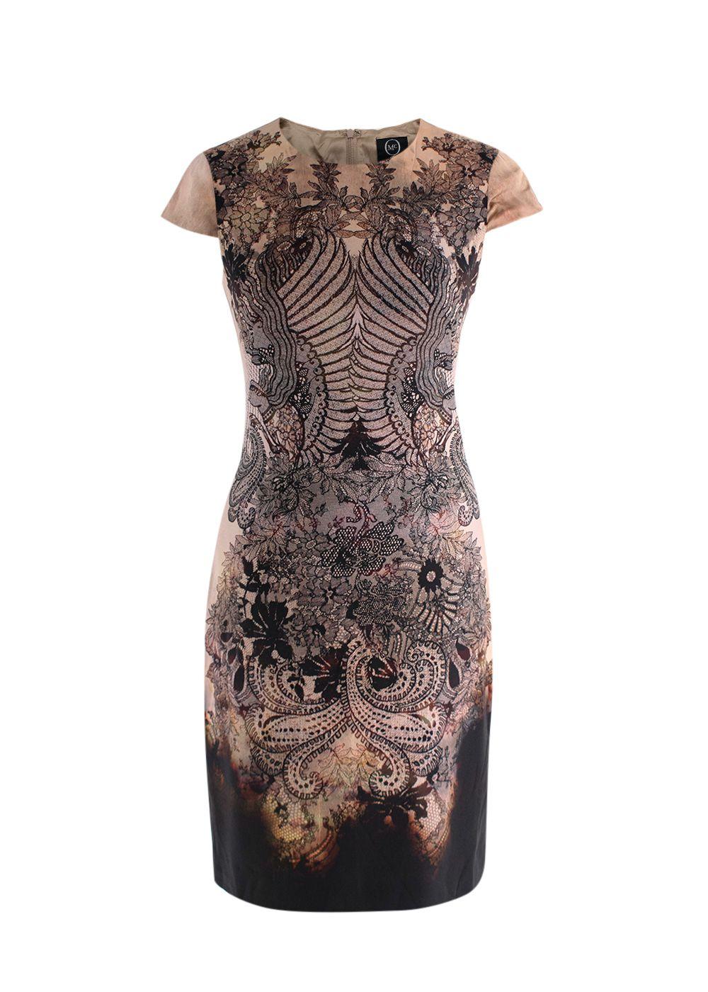This is an Alexander McQueen McQ fitted sheath dress featuring an intricate black lace-effect botanical print over a warm beige/nude background. The piece has a cap-sleeve silhouette, a back zip closure, and a luxurious silk-blend lining. The pattern is highly detailed, with a symmetrical, almost tapestry-like design that gives the dress a dramatic, sculpted look.