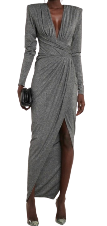 Turn heads in this glittery maxi dress from Alexandre Vauthier. Made from sparkling lurex jersey, the ruched style has padded shoulders, a deep V-neck, and elegant drapery.