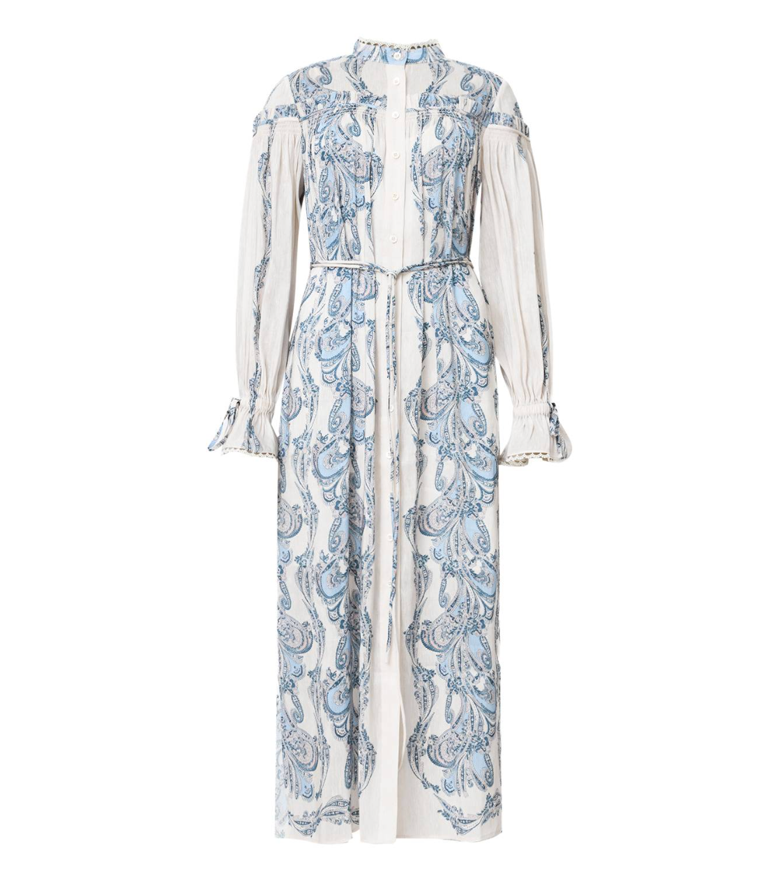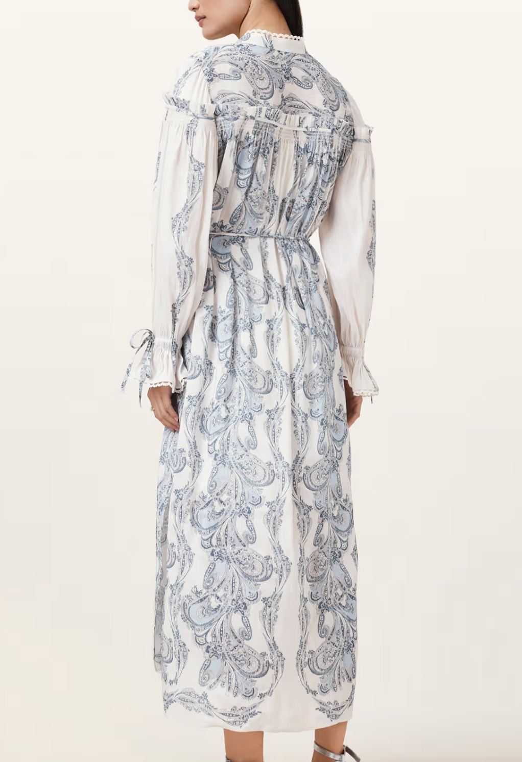 Looking for something easy to wear but pretty? You're looking for Delphine. Cut from a luxe silk and linen blend to a midi silhouette, it features a paisley print designed for this dress. Lace trims and elasticated, ruffle cuffs create feminine drama.