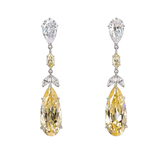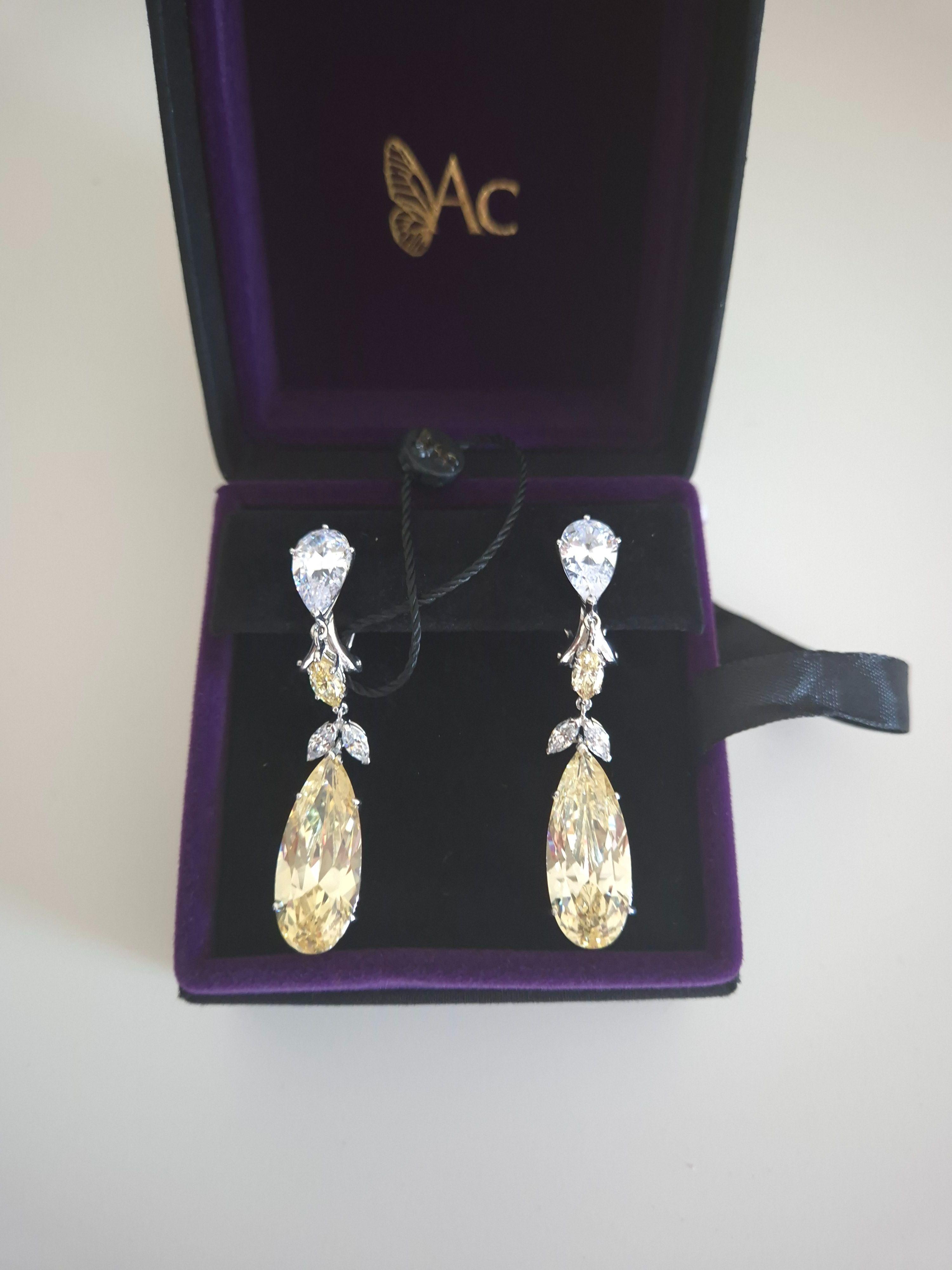 A classic pair of earrings in 18k white gold and rhodium vermeil , intricately hand-set with 2 pear-shaped laboratory-grown simulated canary diamonds of 16cts each, 2 pear shaped white diamonds of 3.5cts each, 4 marquise diamonds of 0.4cts each, and 2 marquise canary diamonds of 0.8cts each