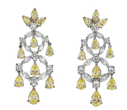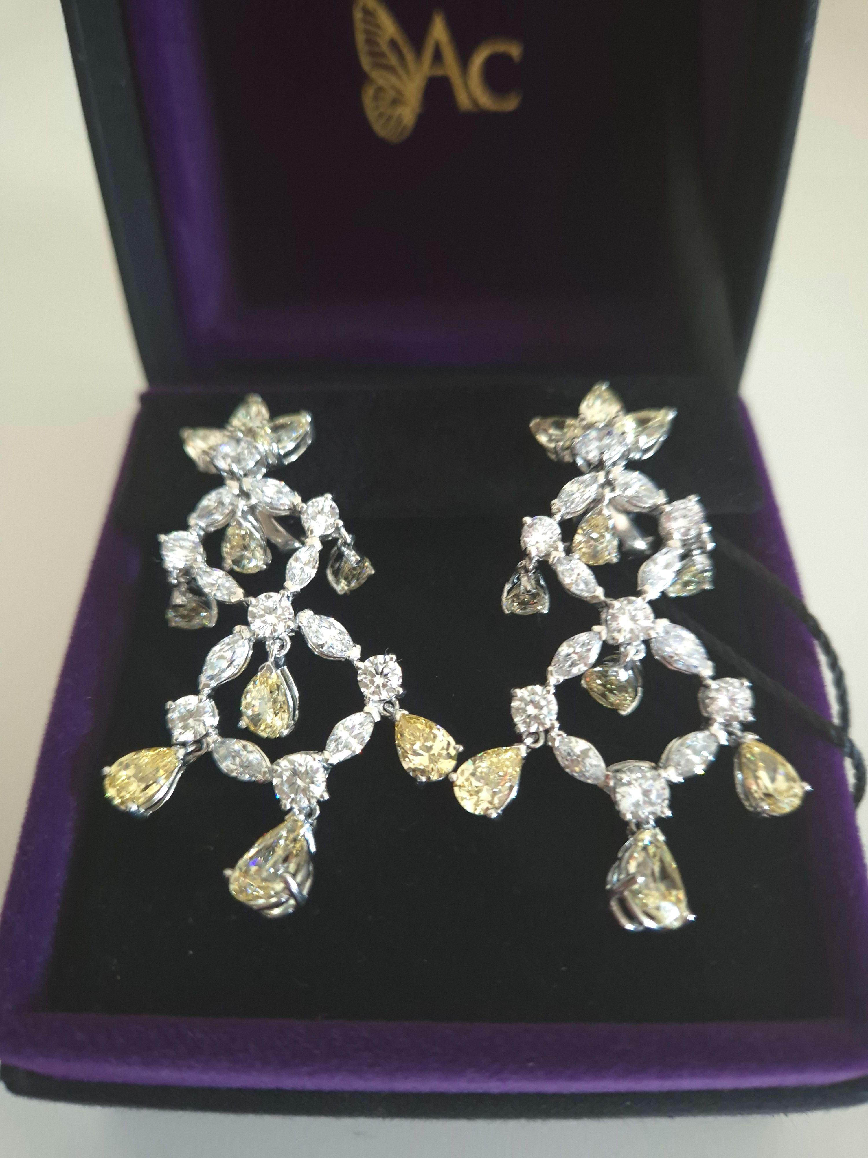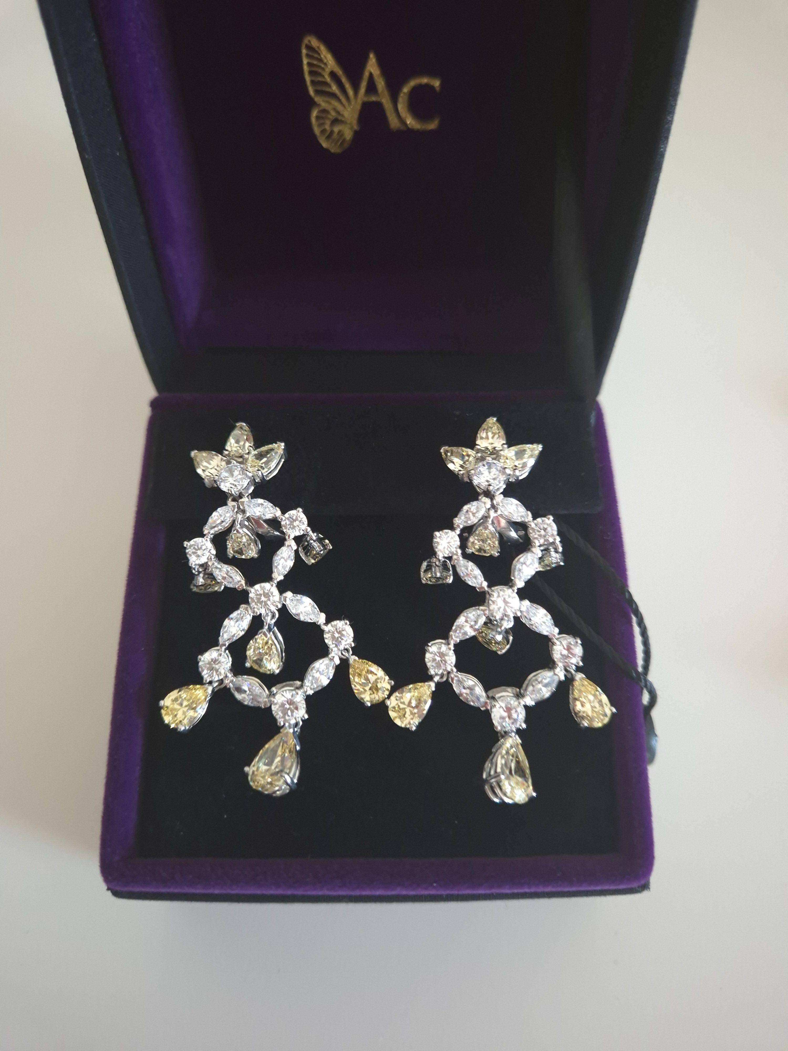 A stunning pair of cocktail earrings in 18k white gold and rhodium vermeil with 18k gold earring posts and omega backs, hand set with an array of laboratory-grown simulated pear, marquise and round brilliant-cut canary and white diamonds.