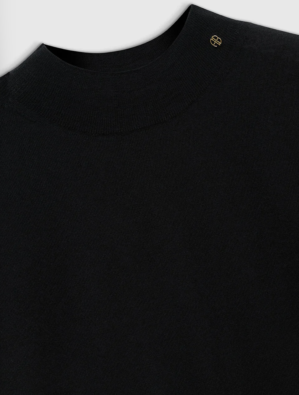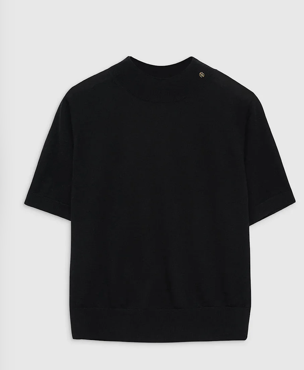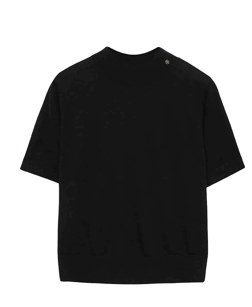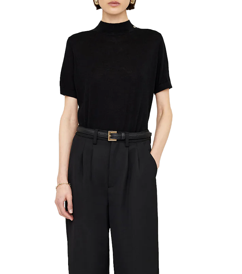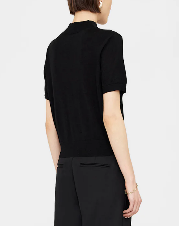 The Monique Sweater is crafted from a luxuriously lightweight wool-cashmere blend in an all-over jersey stitch with soft surface texture. It features contrast ribbed trim at its mock neckline, short sleeves, and hem for a relaxed yet fitted look. Finished with a small hand-tacked ANINE BING monogram charm.