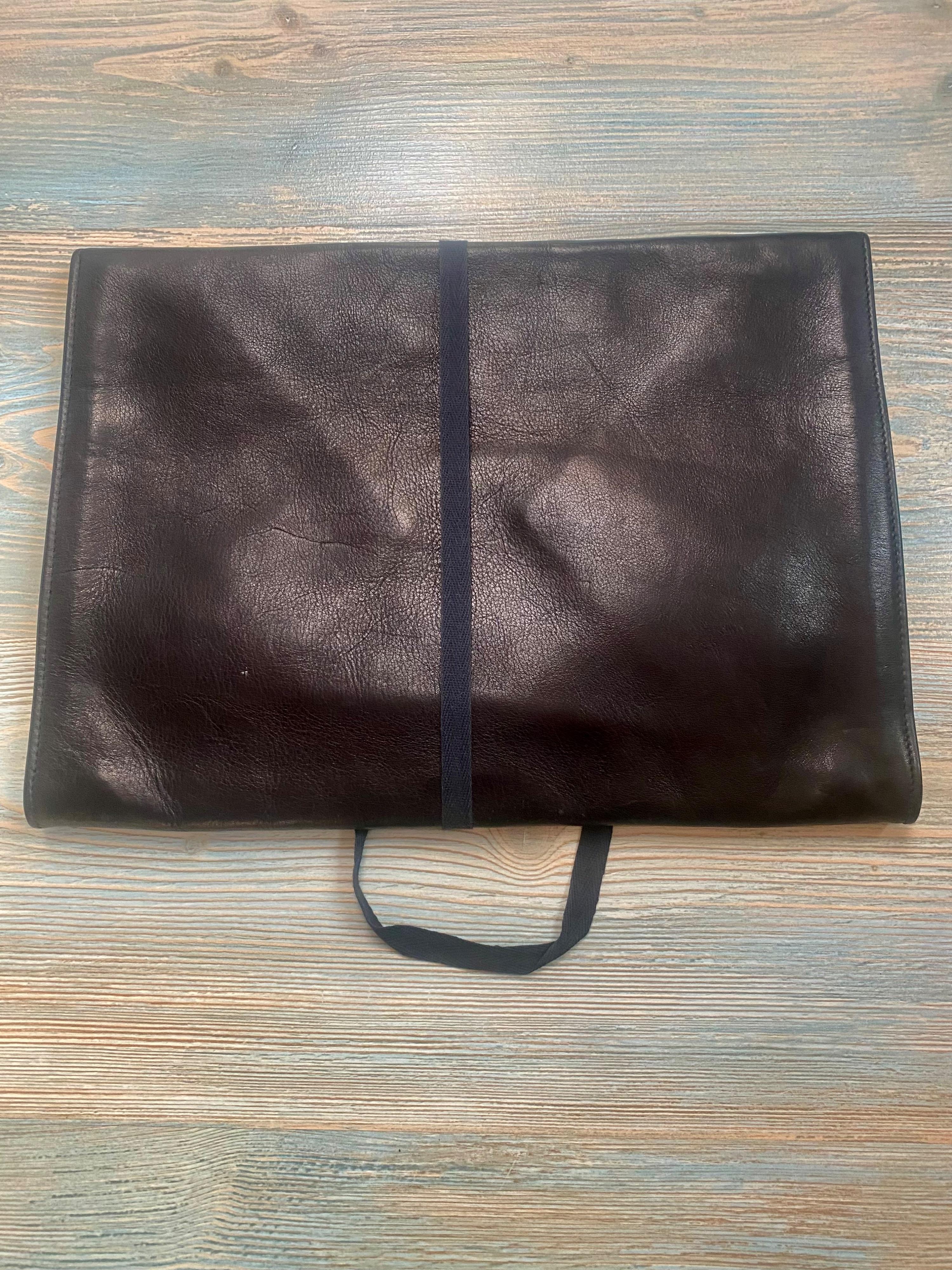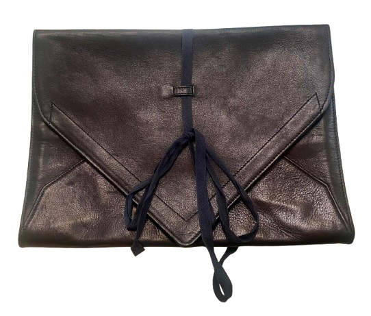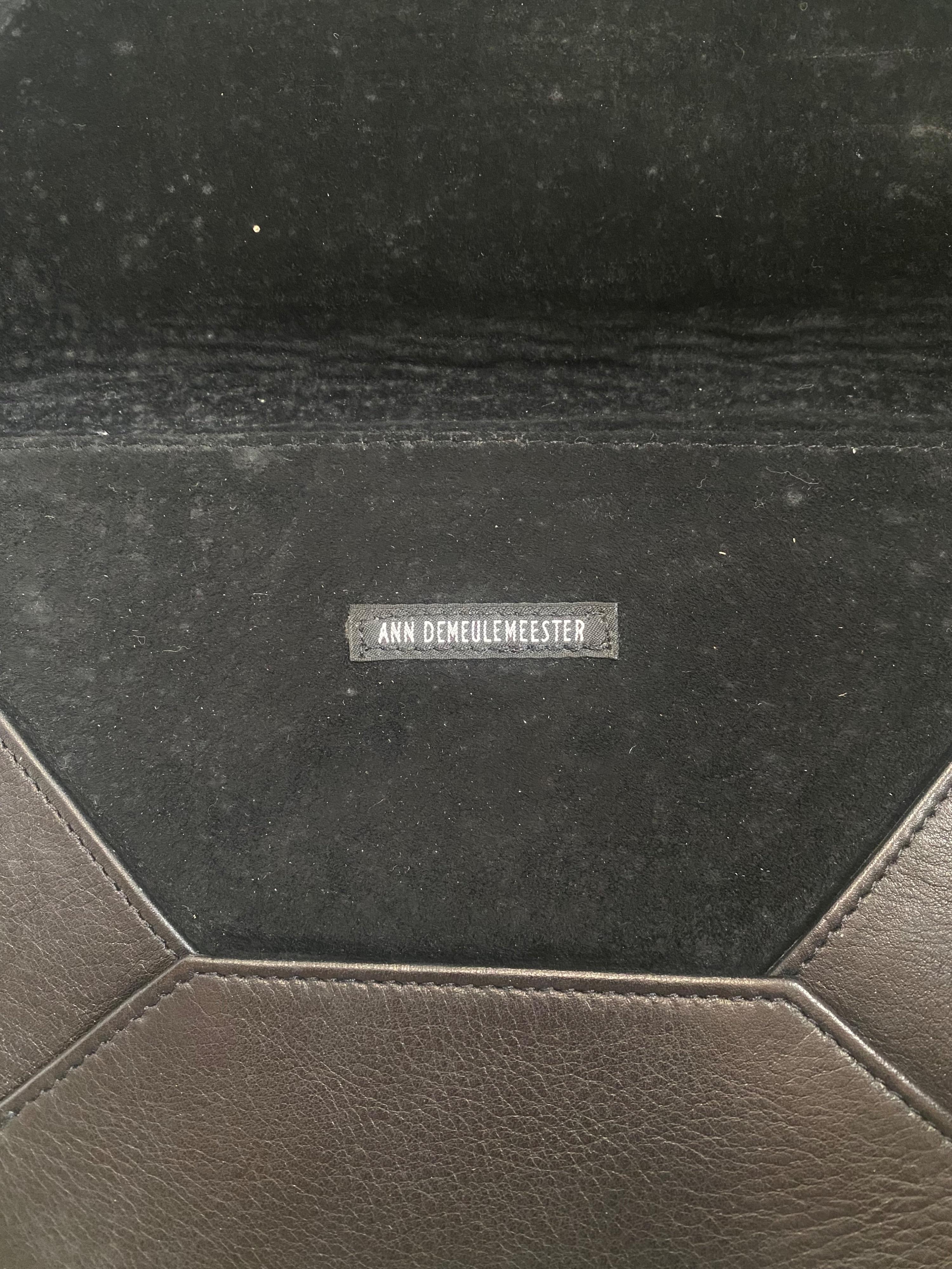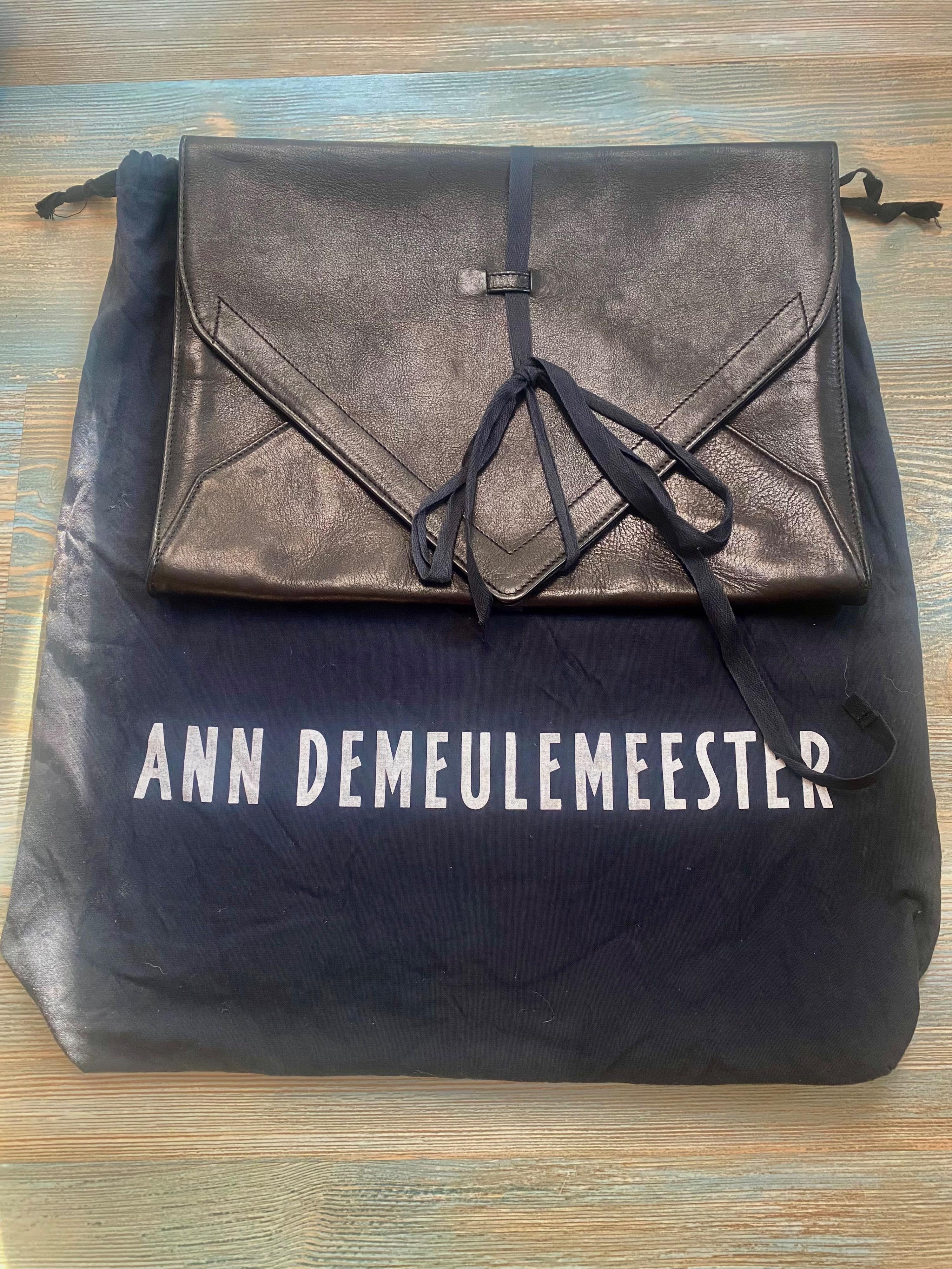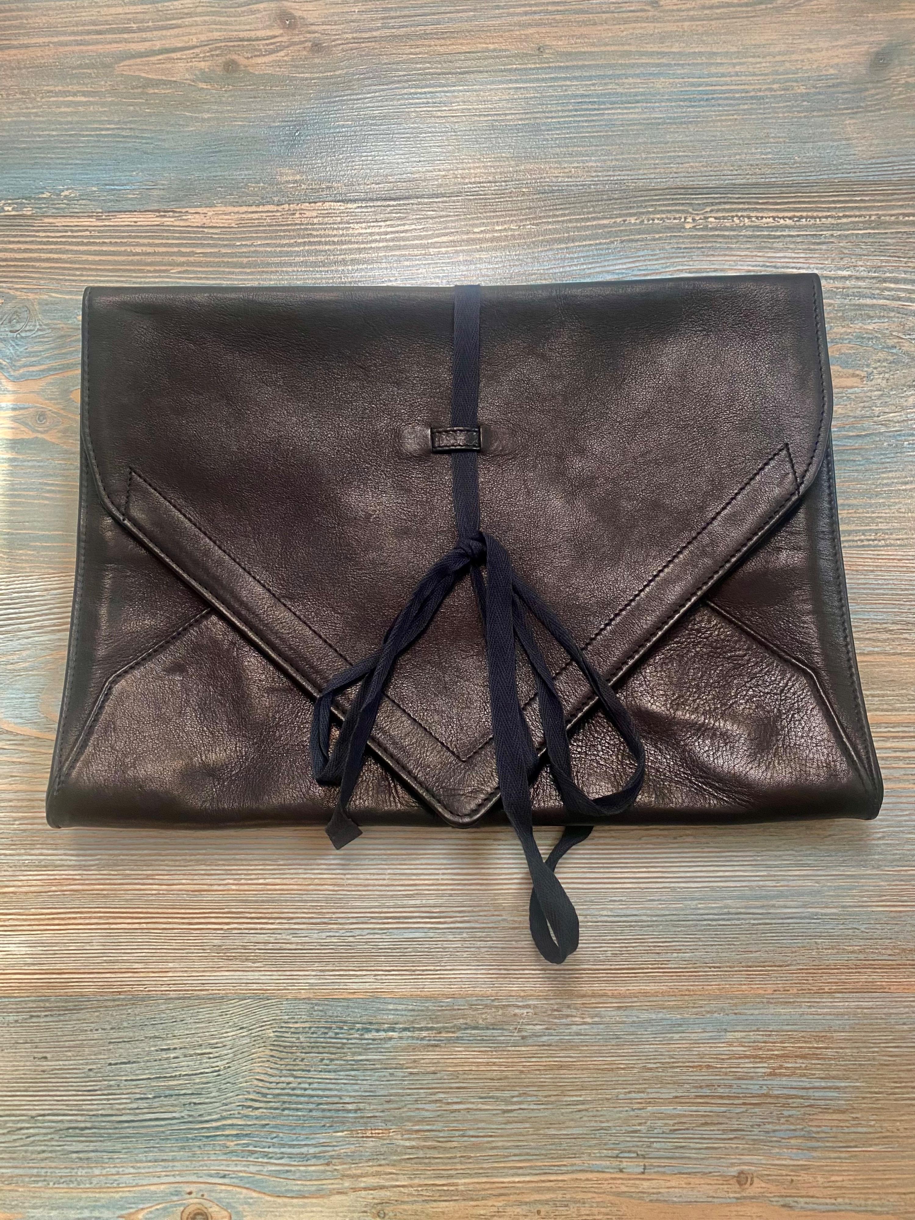Black leather envelope clutch bag from Ann Demeulemeester featuring a tie fastening and a foldover top. Fits an ipad & a smaller laptop.