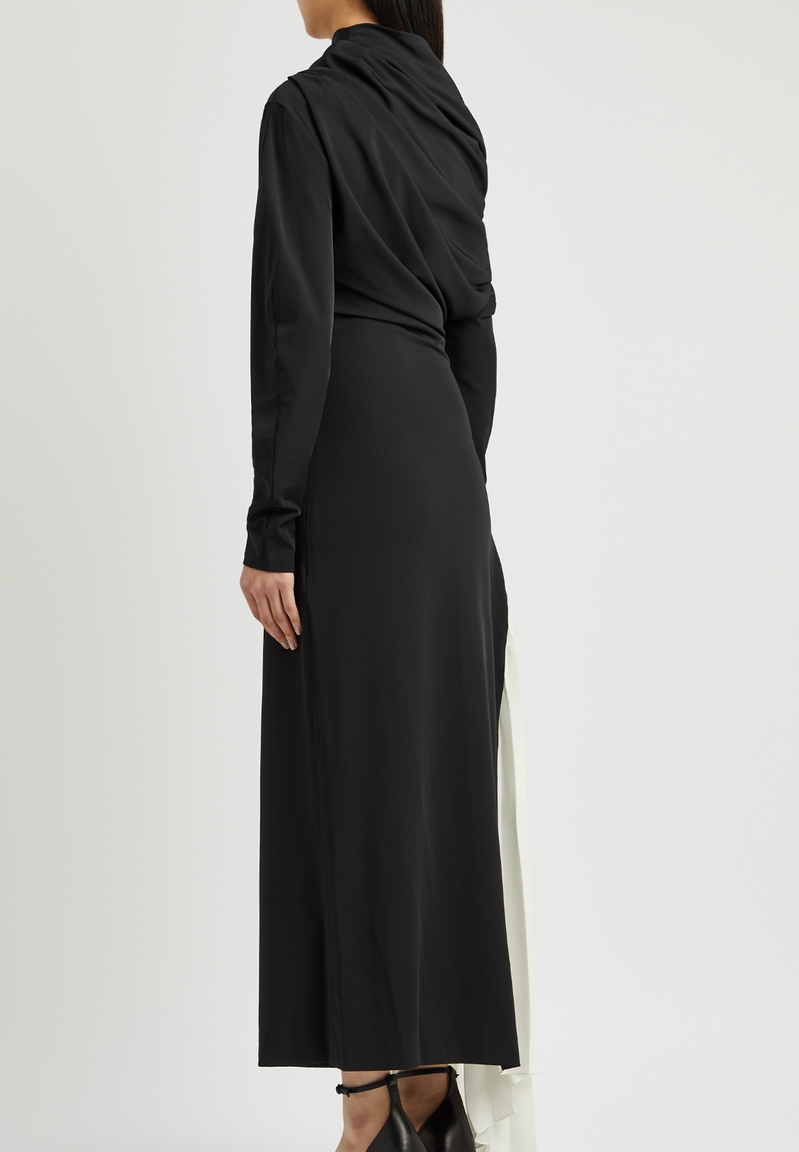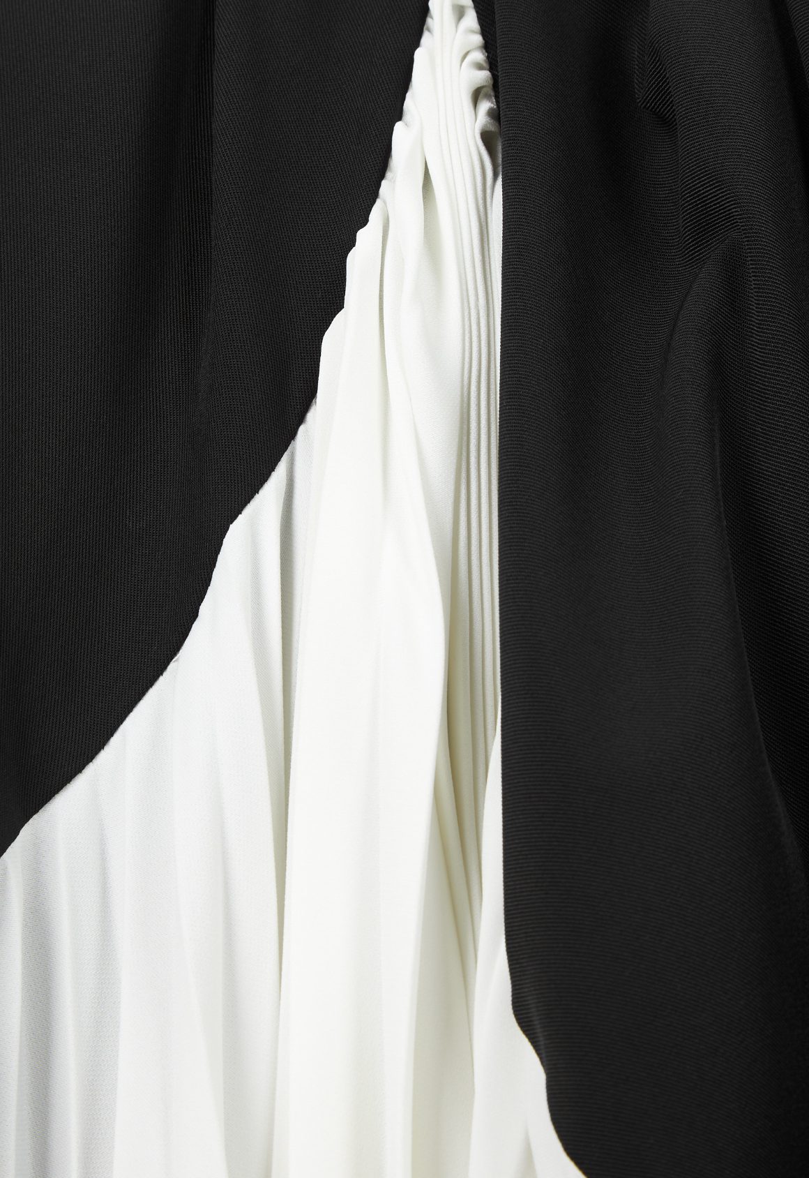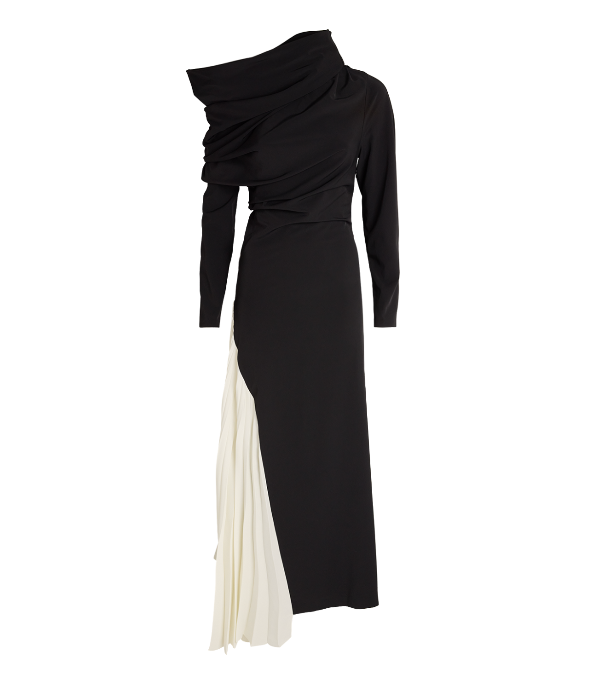 Draped off-the-shoulder neckline with gathered details, dropped shoulders, batwing sleeves, side split, contrasting draped plissé panel at side, asymmetric hem