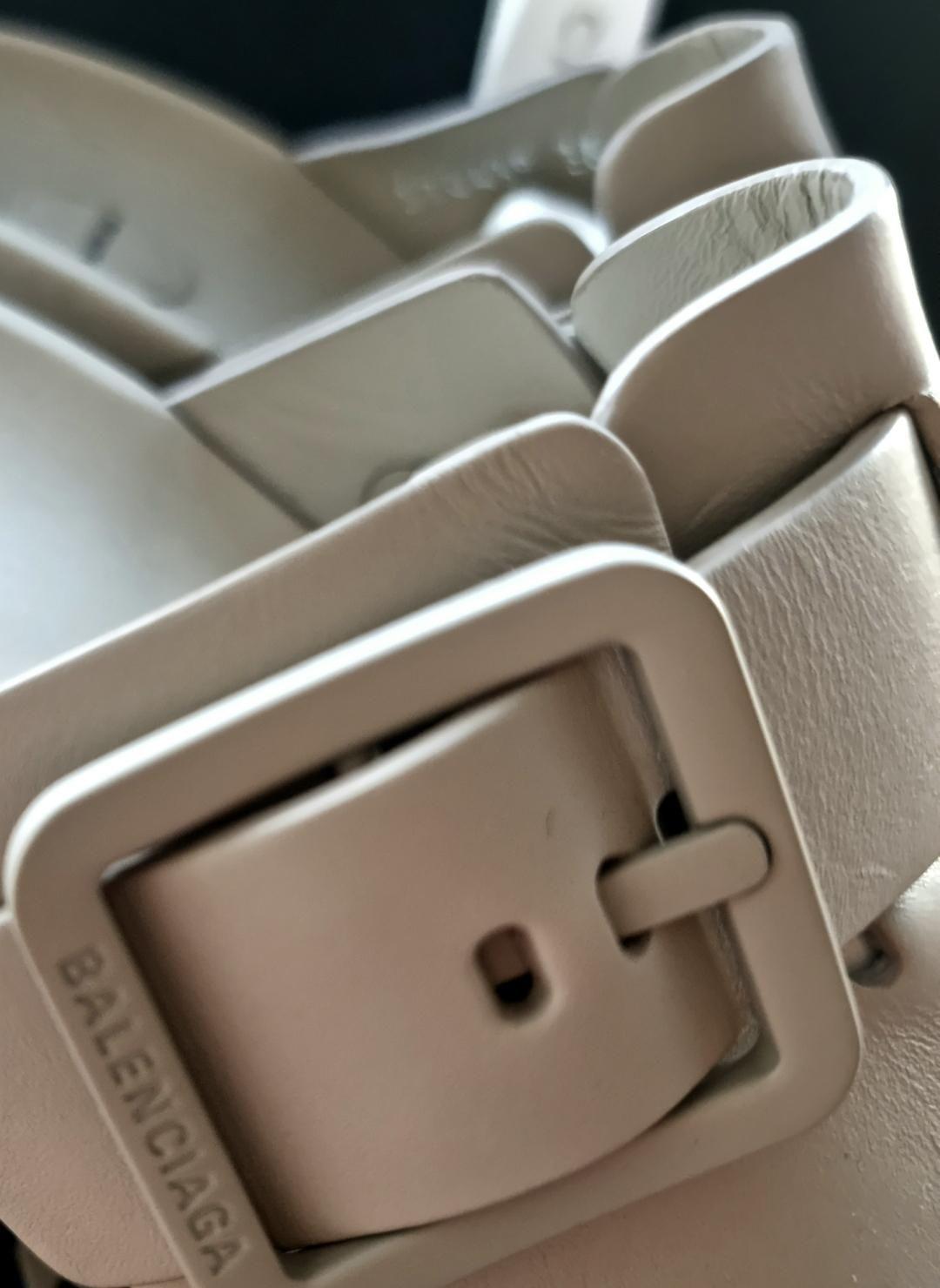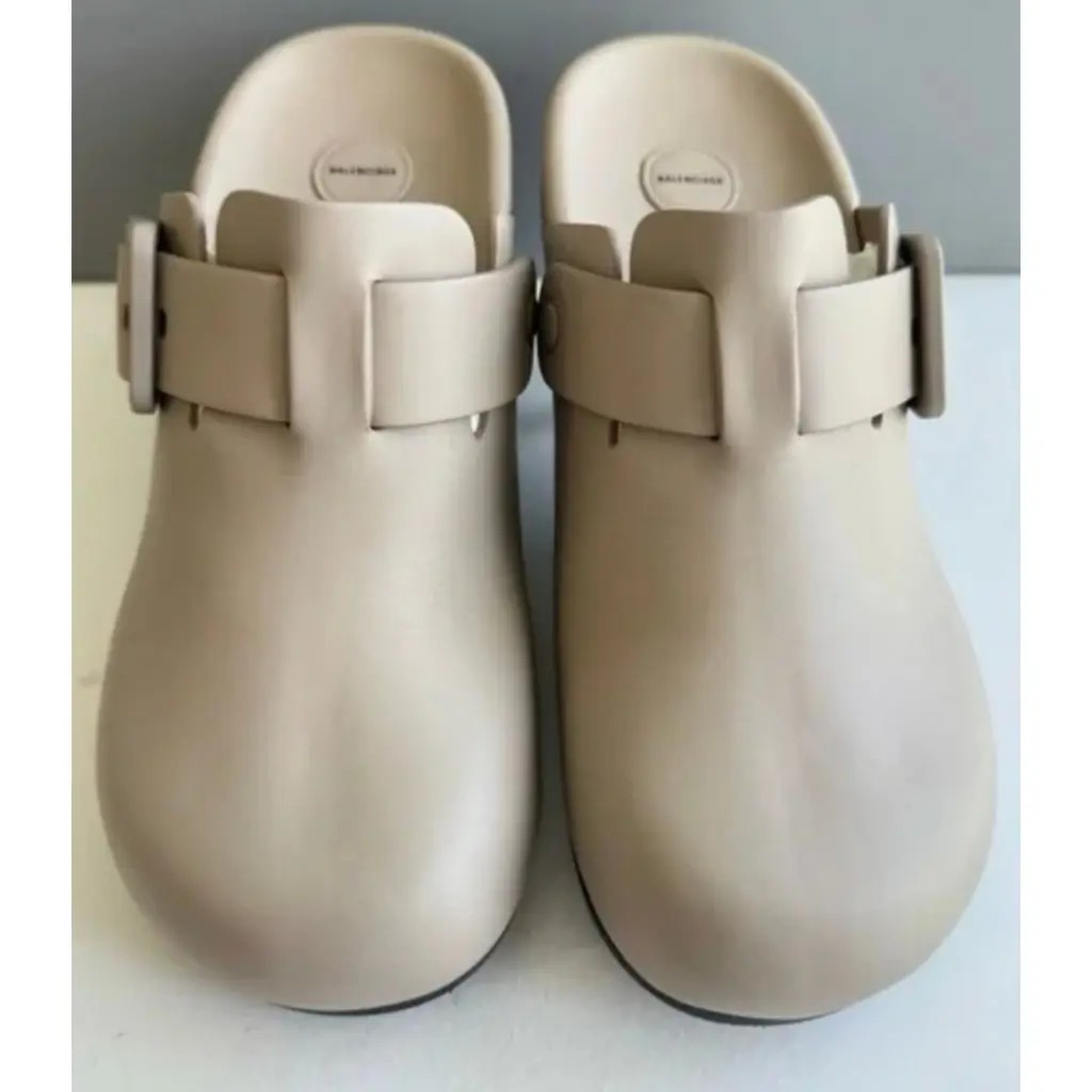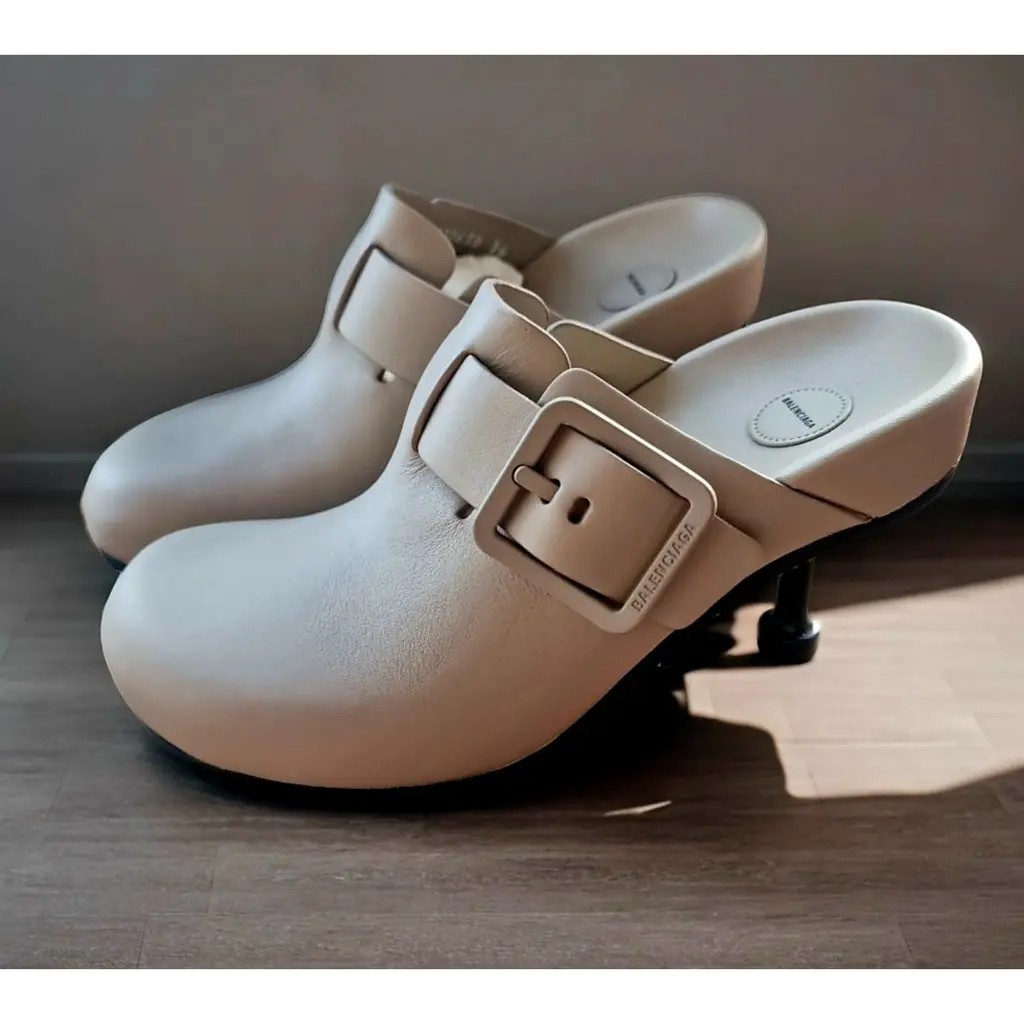 Mallorca mules from Balenciaga. The natural leather is both stylish and wearable, and the tonal buckle embellishments add a touch of drama. The round toe and slip-on style make them easy to wear, and the 80mm stiletto heel gives you a little extra height. Whether you're dressing up or dressing down, these mules are sure to become a go-to in your shoe collection.