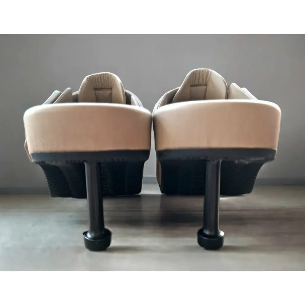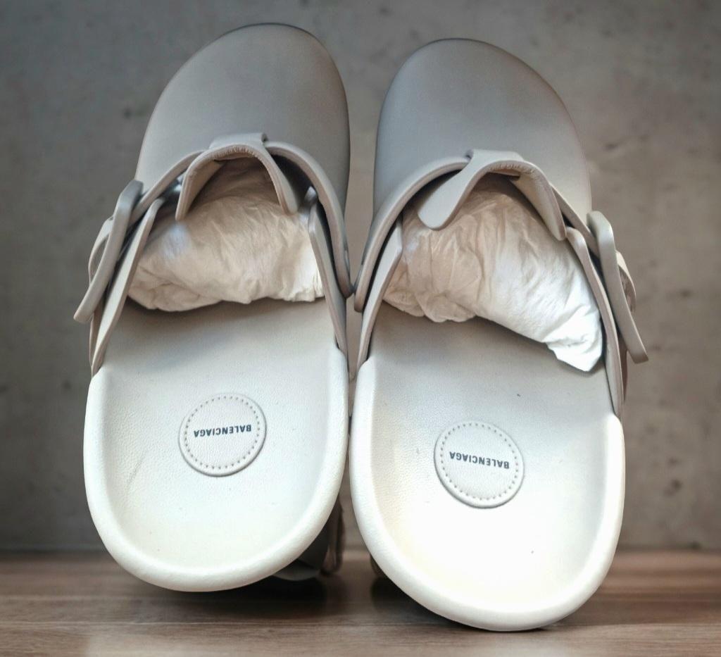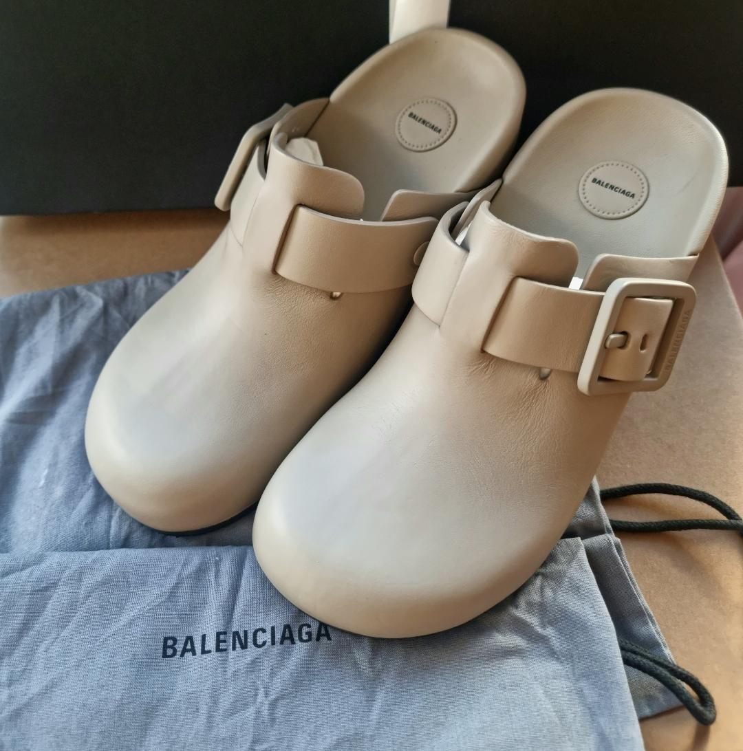 Mallorca mules from Balenciaga. The natural leather is both stylish and wearable, and the tonal buckle embellishments add a touch of drama. The round toe and slip-on style make them easy to wear, and the 80mm stiletto heel gives you a little extra height. Whether you're dressing up or dressing down, these mules are sure to become a go-to in your shoe collection.