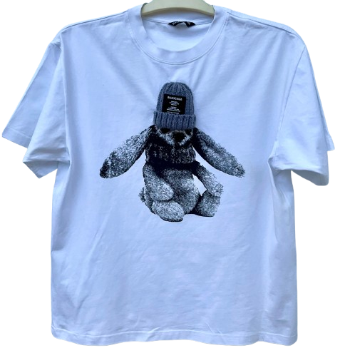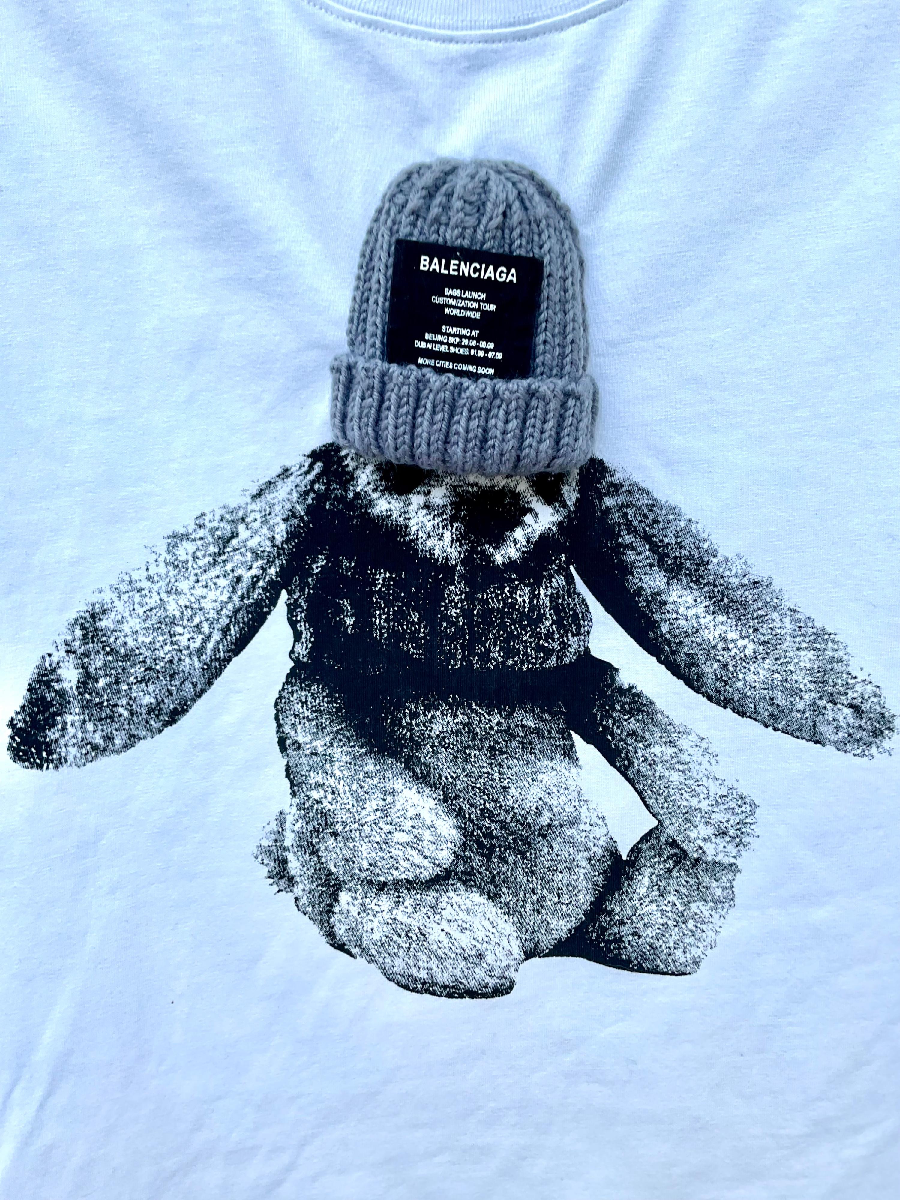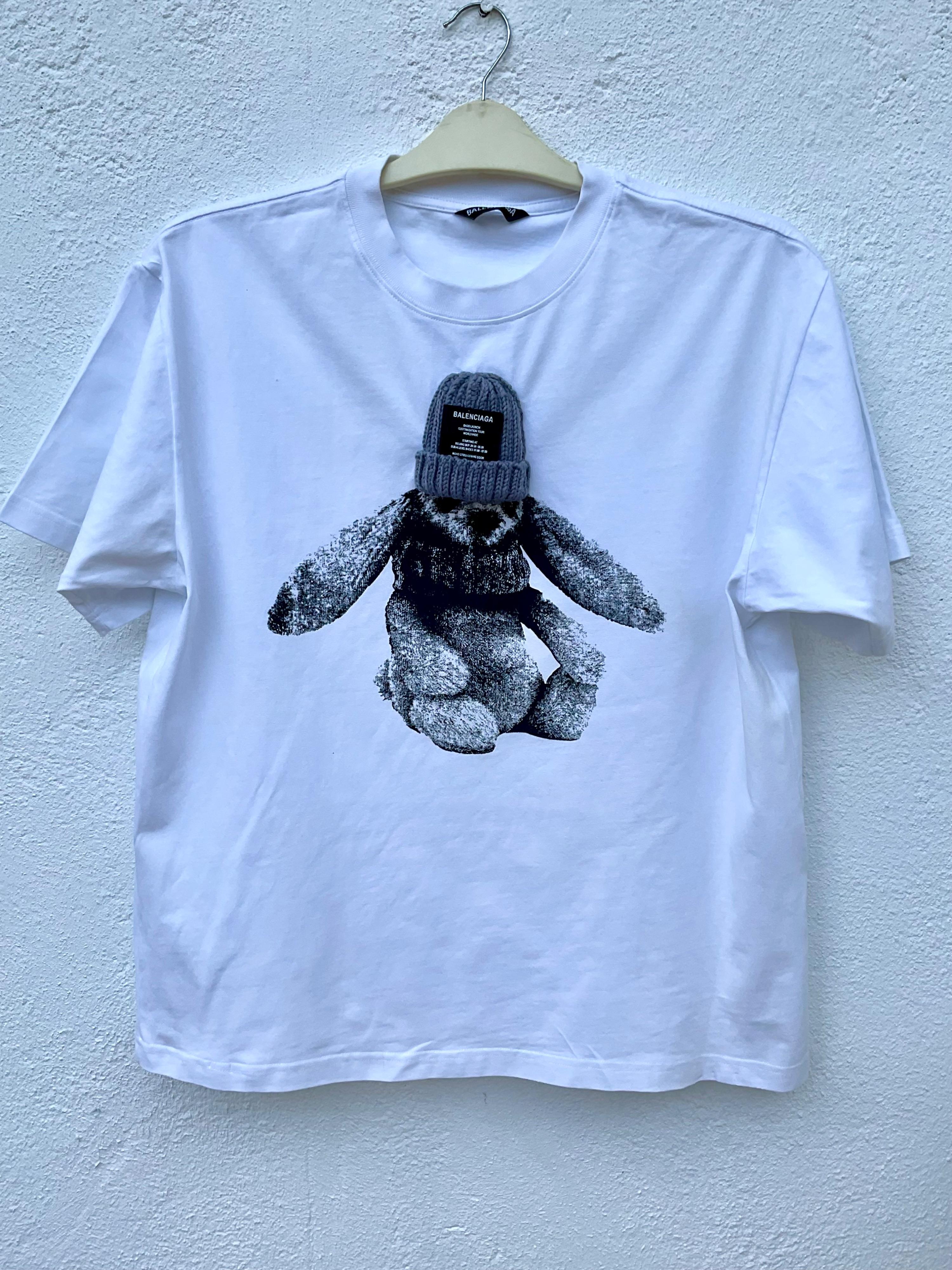 A Balenciaga 3D wool cap rabbit Kareba shirt in a size M.