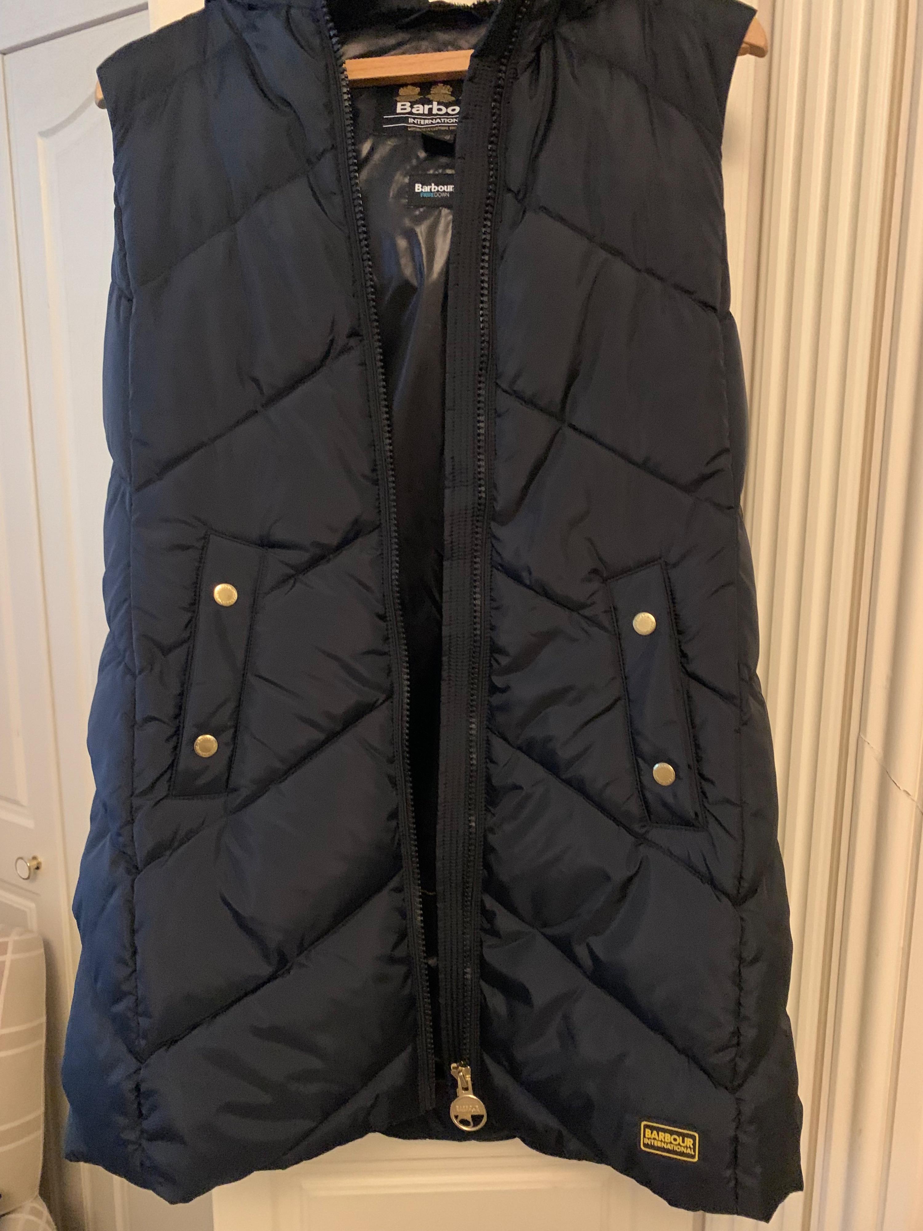 Long padded black gilet with hood gold zip etc