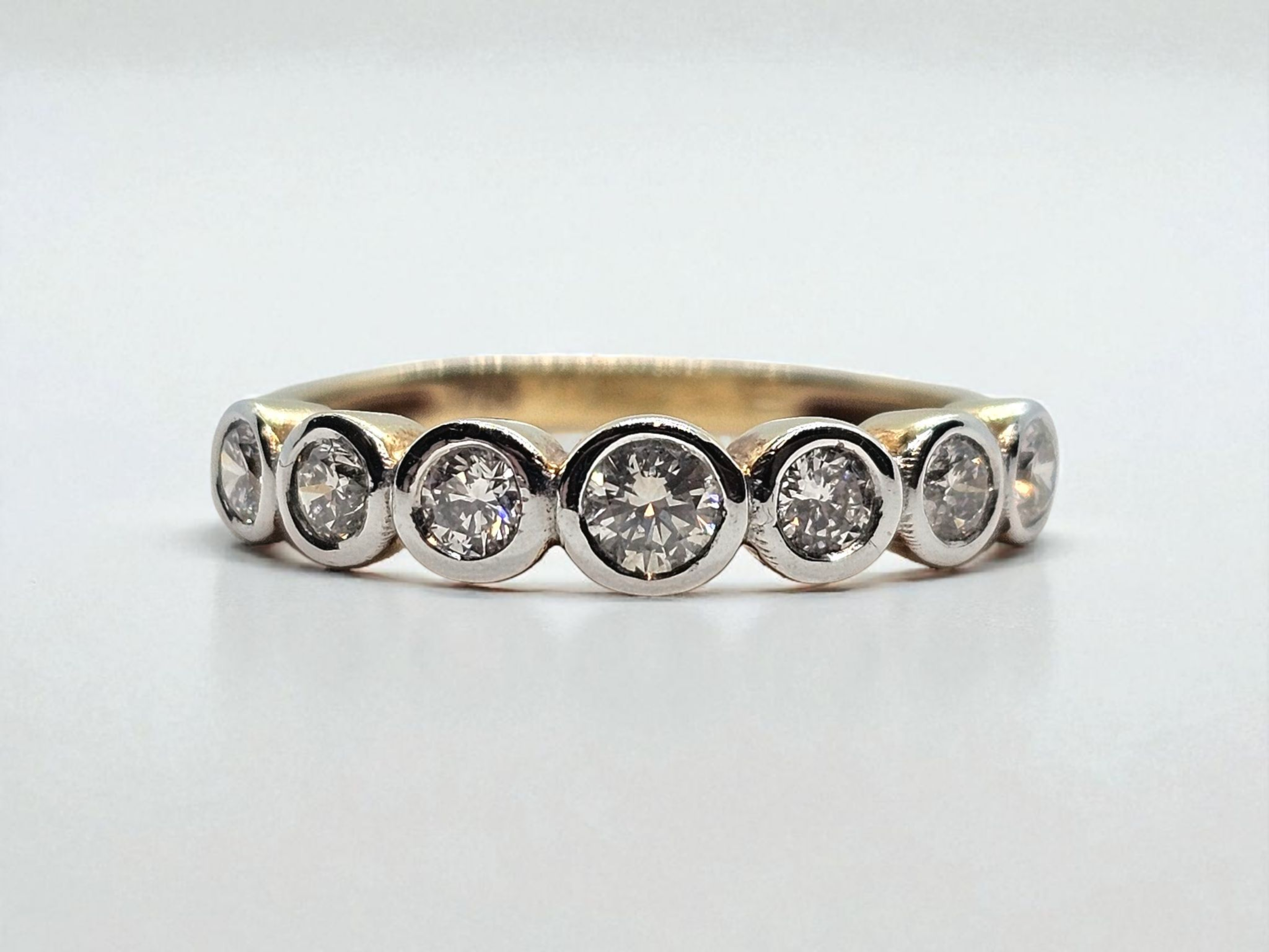 Featuring 7 graduated diamonds in a contrasting white gold over setting and yellow gold shank.