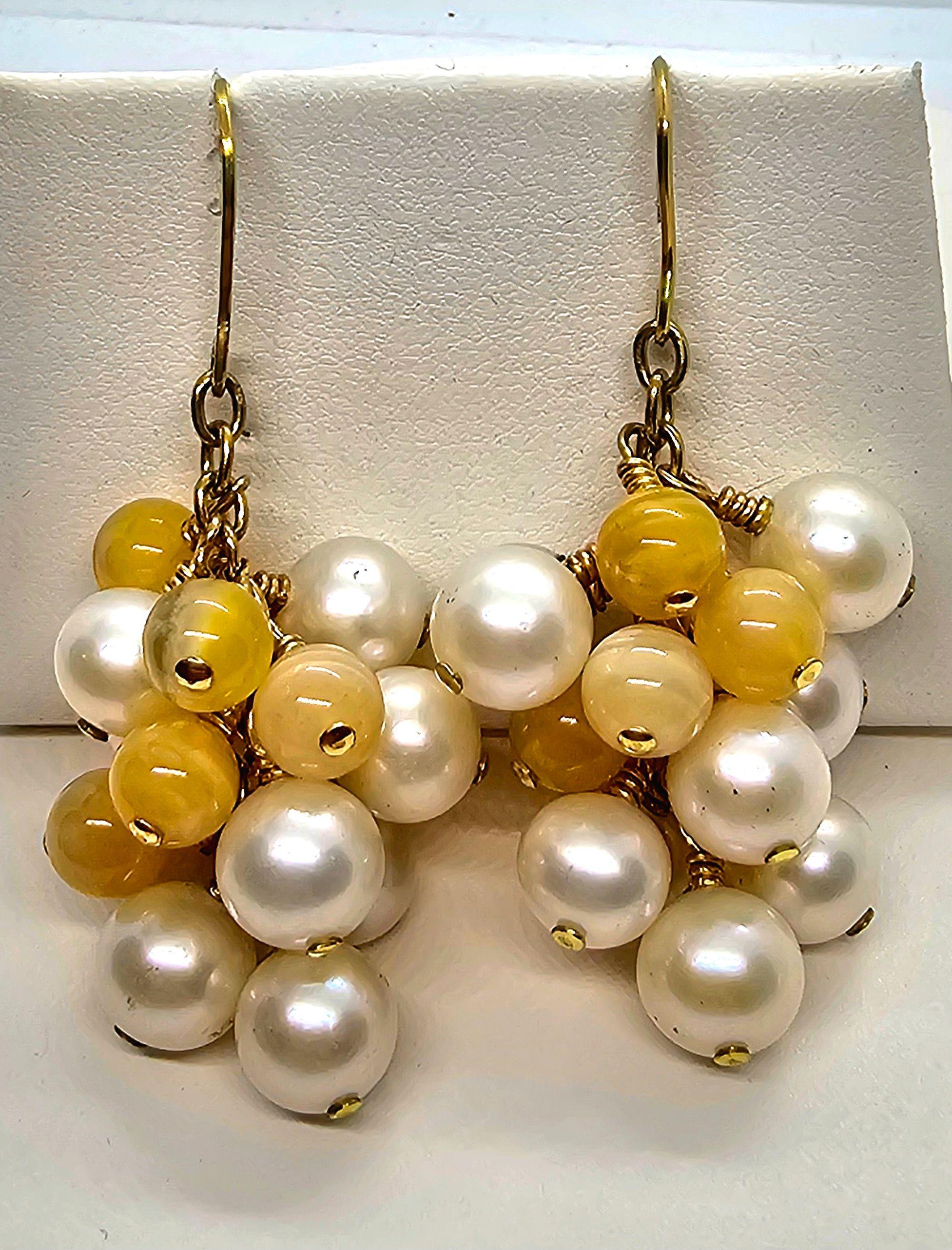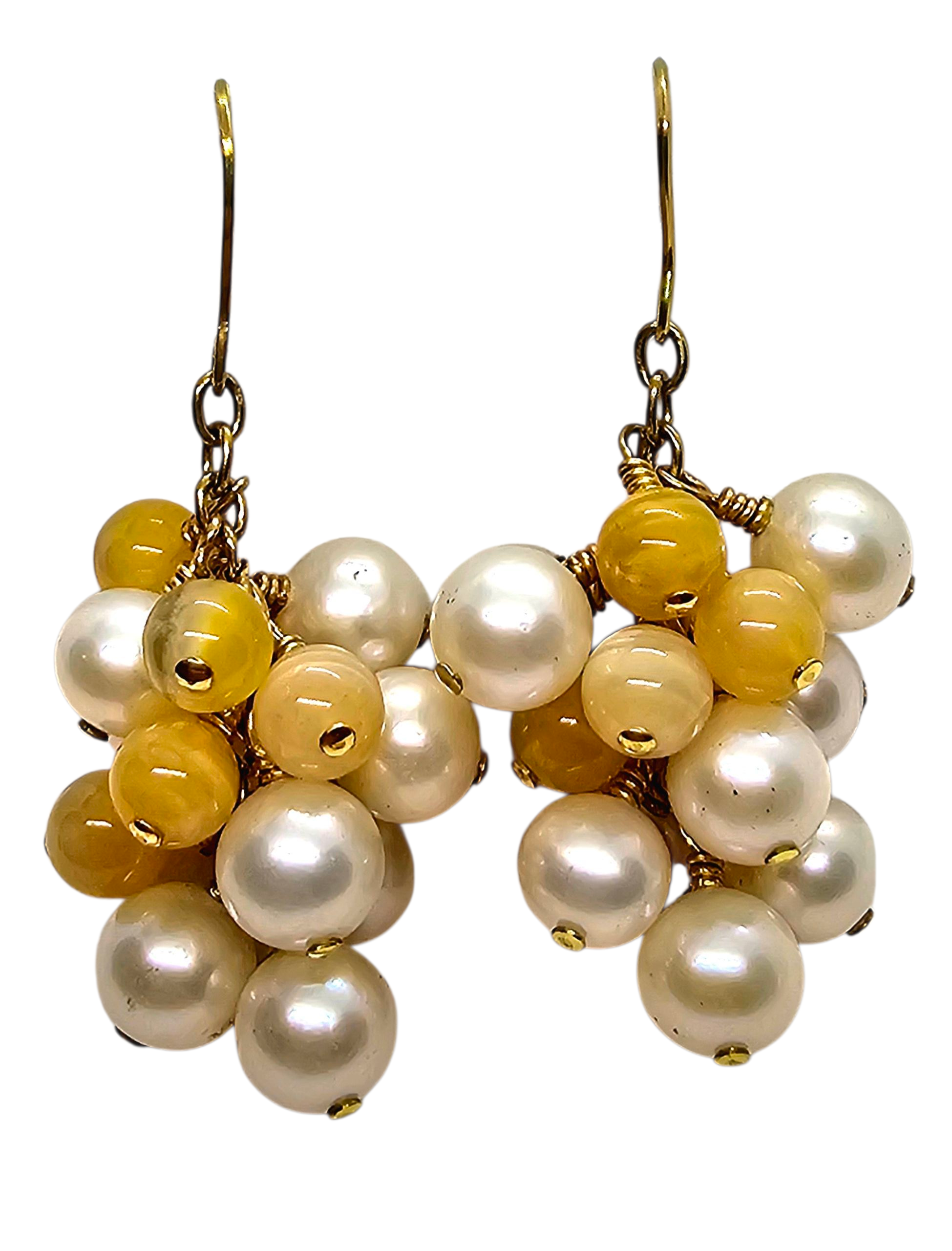 A unique pair of cultured pearl & Calcite earrings in a cluster "Grape" setting.