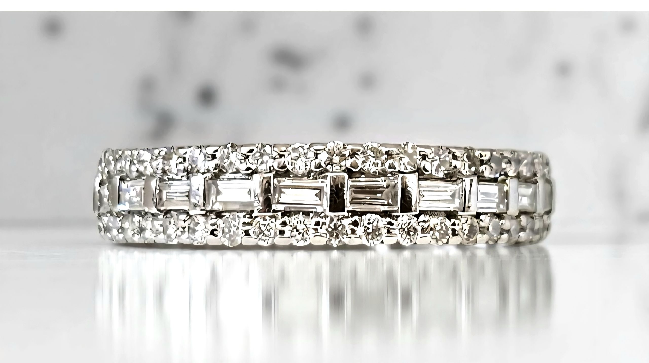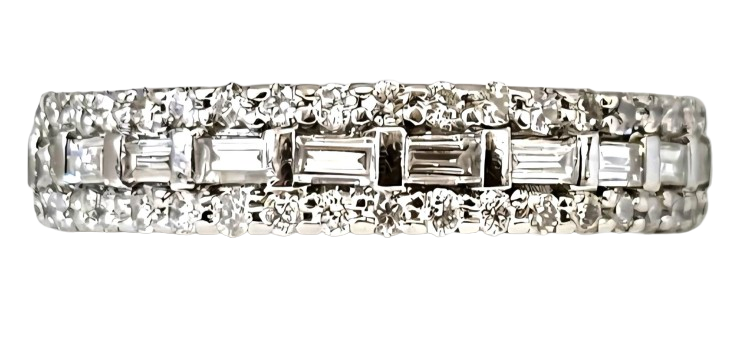 Featuring a row of 10 Baguette diamonds nestled between a border of white round brilliant cuts.