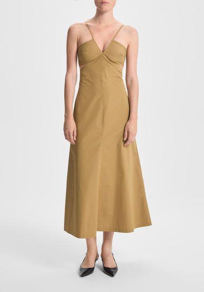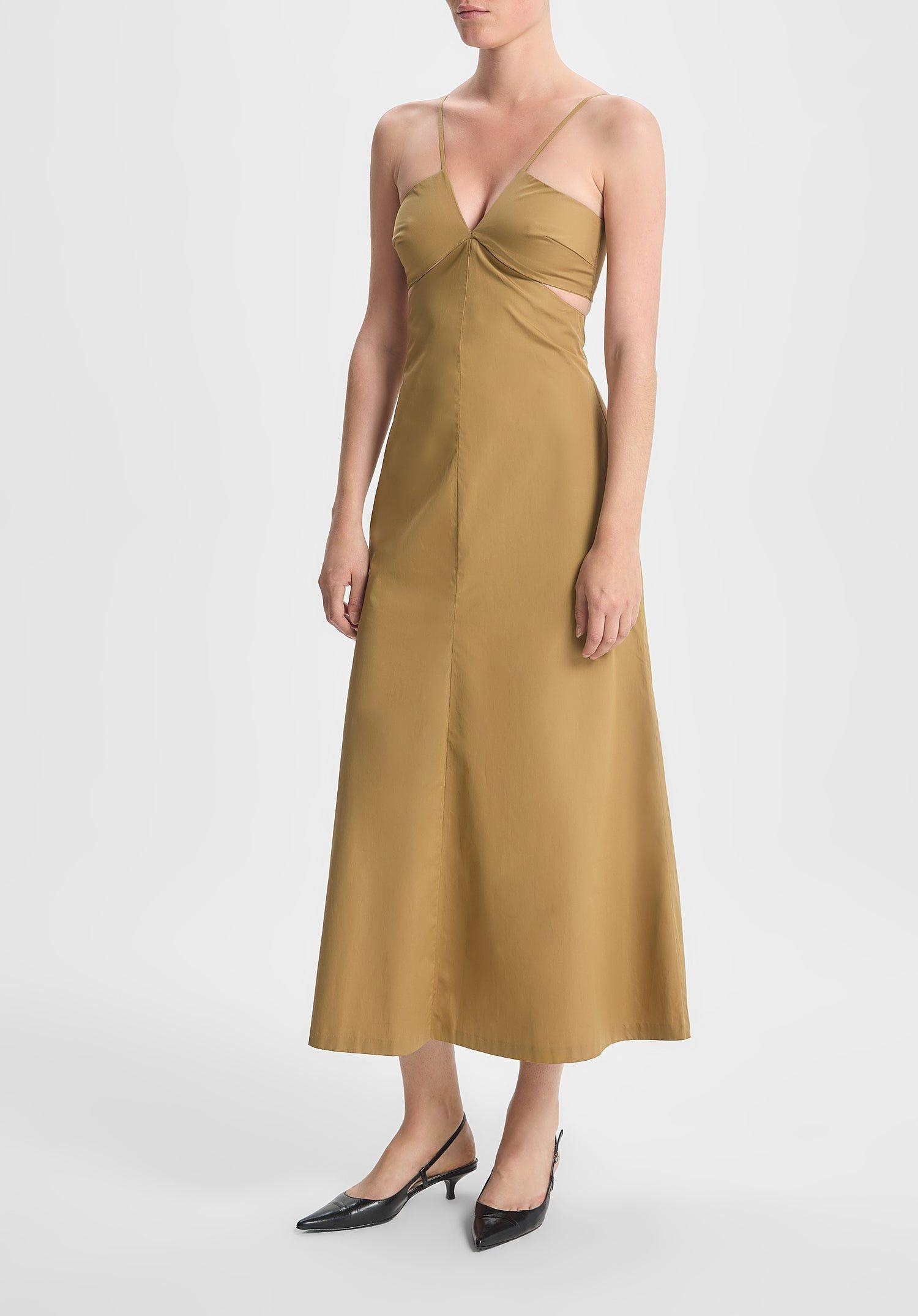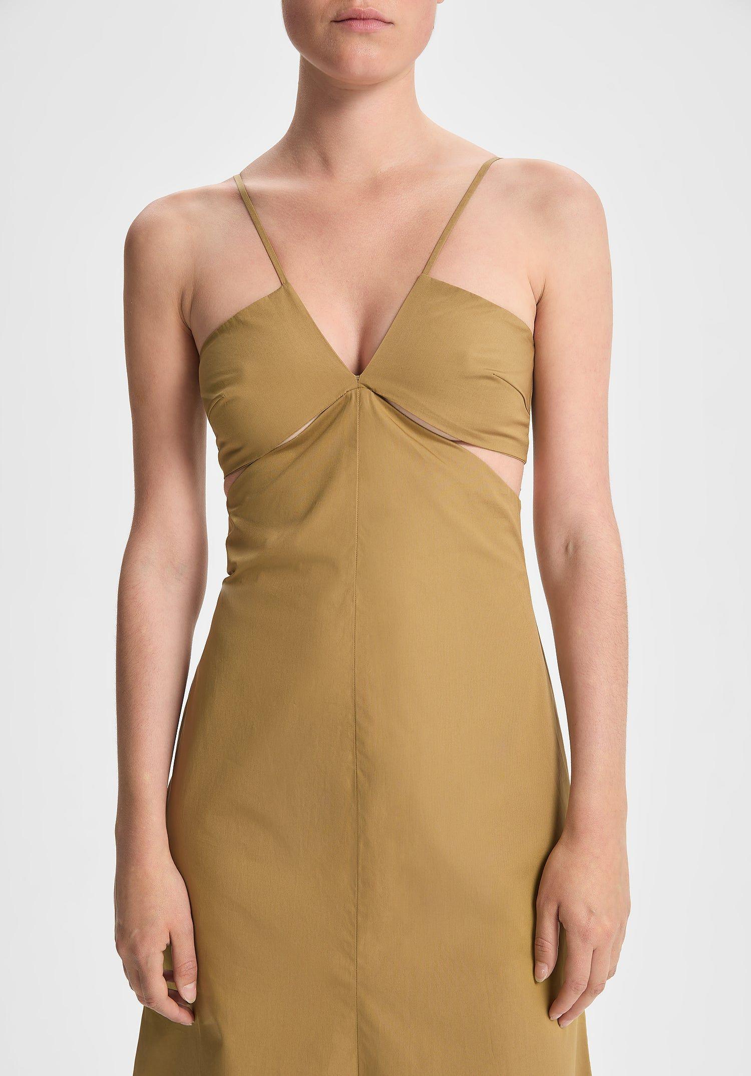 Crafted from lightweight organic cotton poplin in khaki, the Aquilone Dress features delicate V-shaped spaghetti straps and side cut-out details. The silhouette flares gently into an A-line skirt, offering an elegant and airy summer shape.
