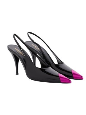 Saint Laurent Vesper slingback pumps in black patent leather with a vibrant fuchsia metallic leather tip.