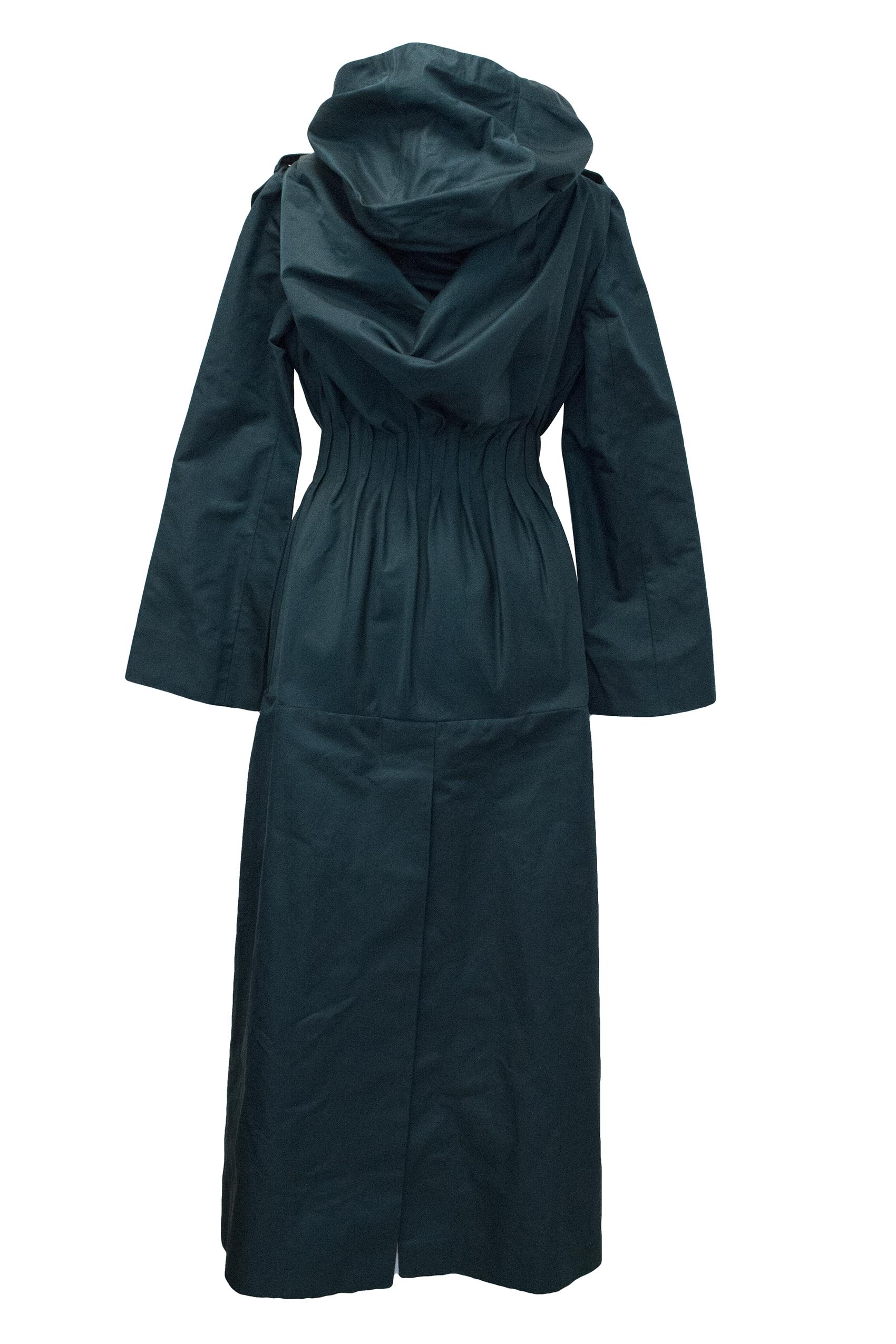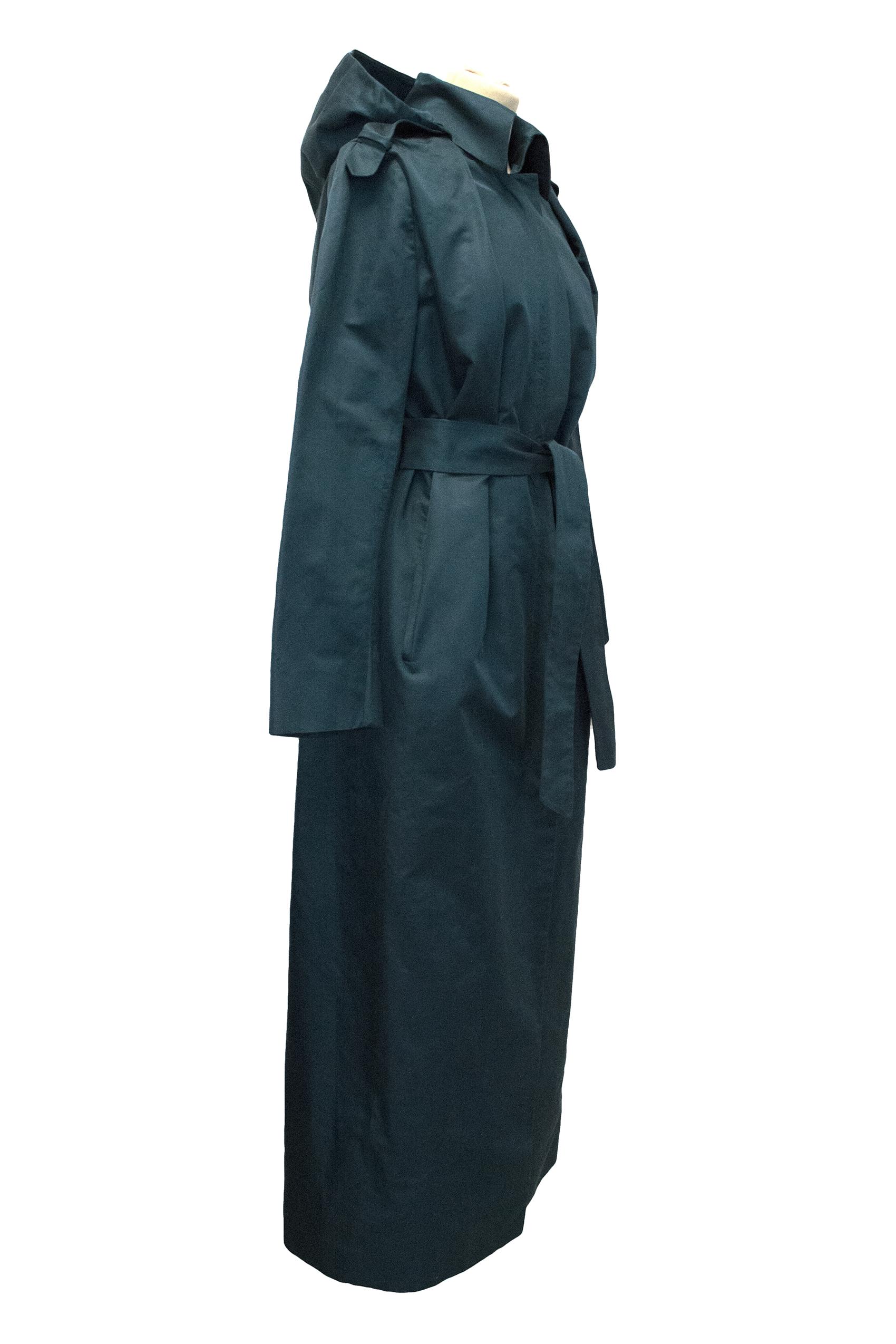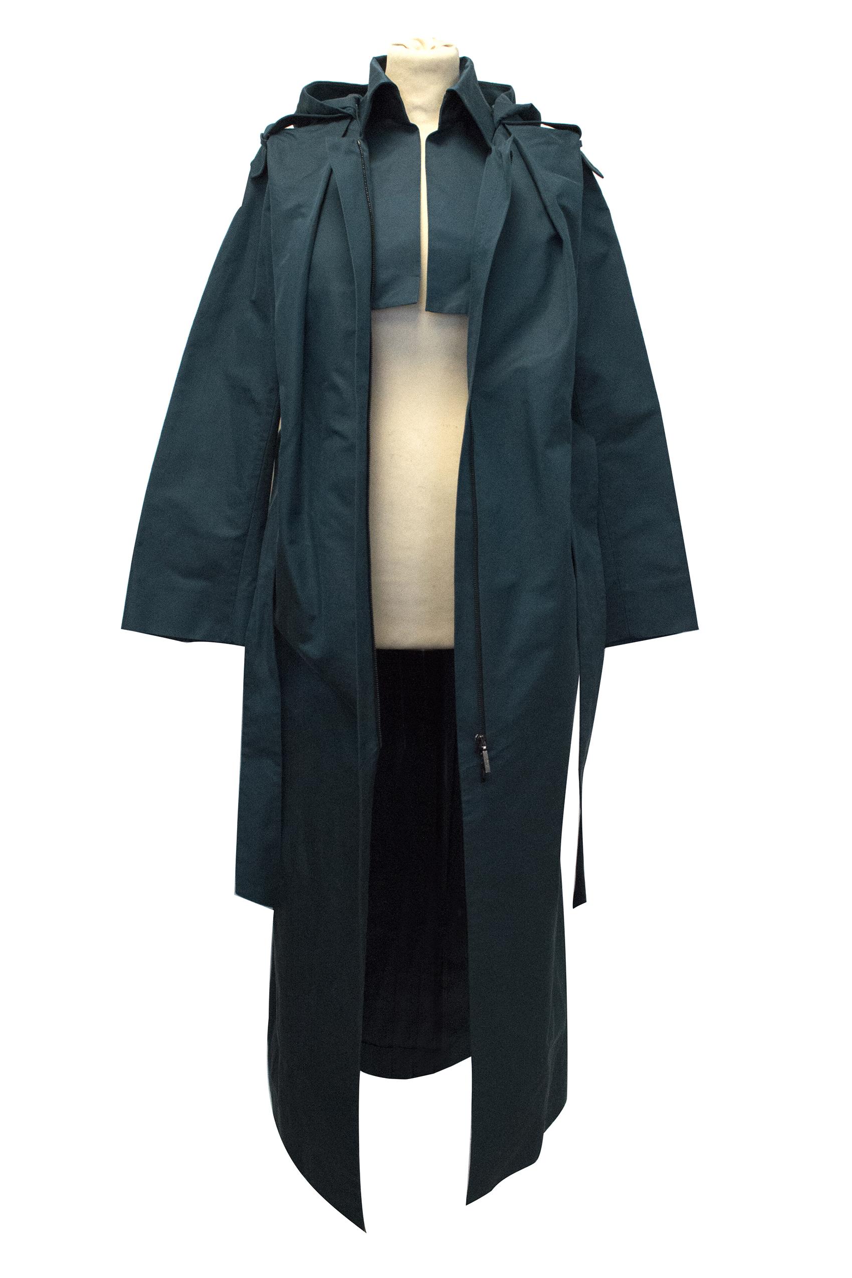 Brioni green/blue long trench coat with hood and ruched detailed waist. Matching belt to pull in at the waist.