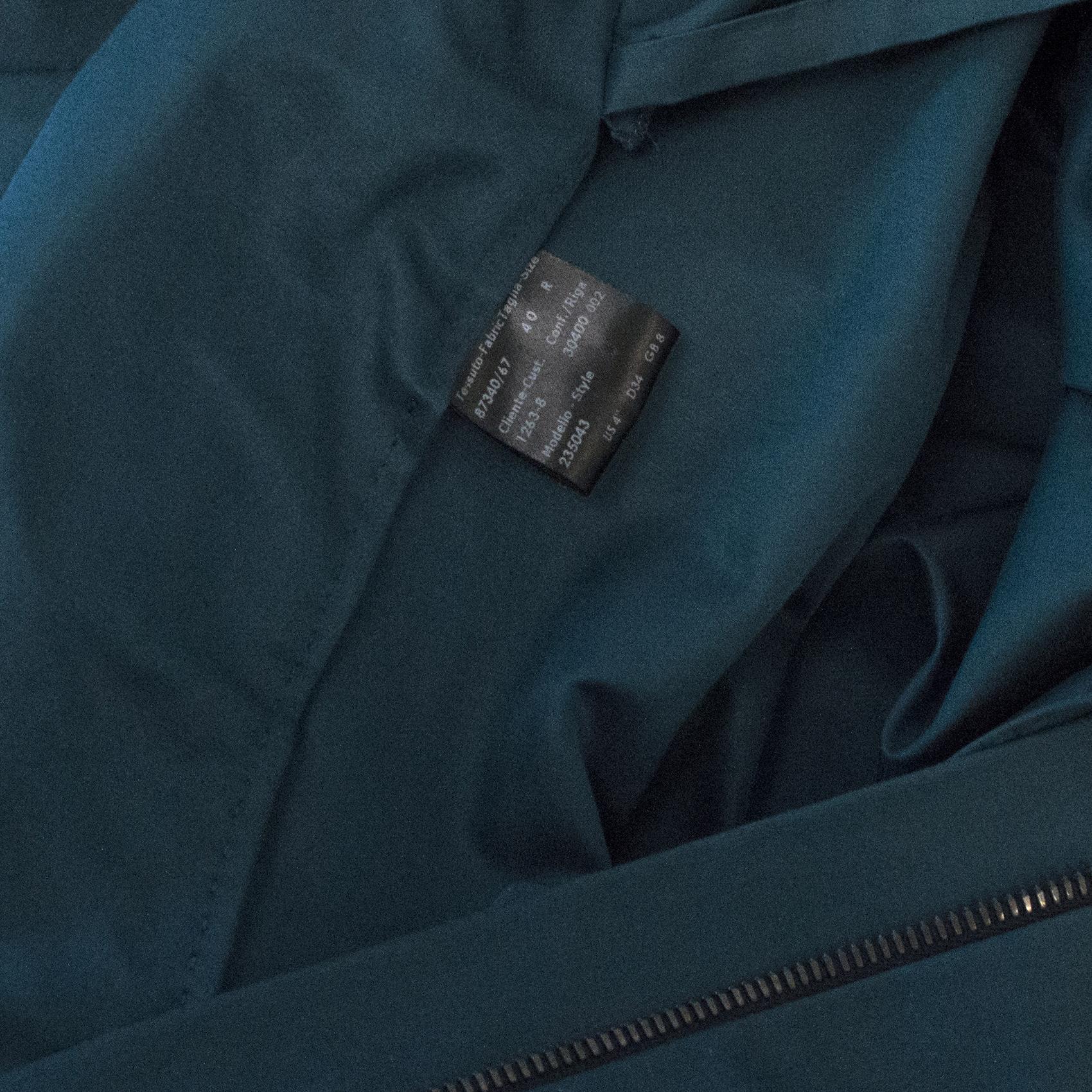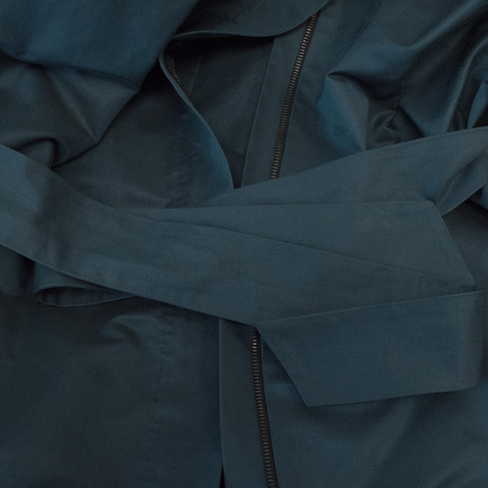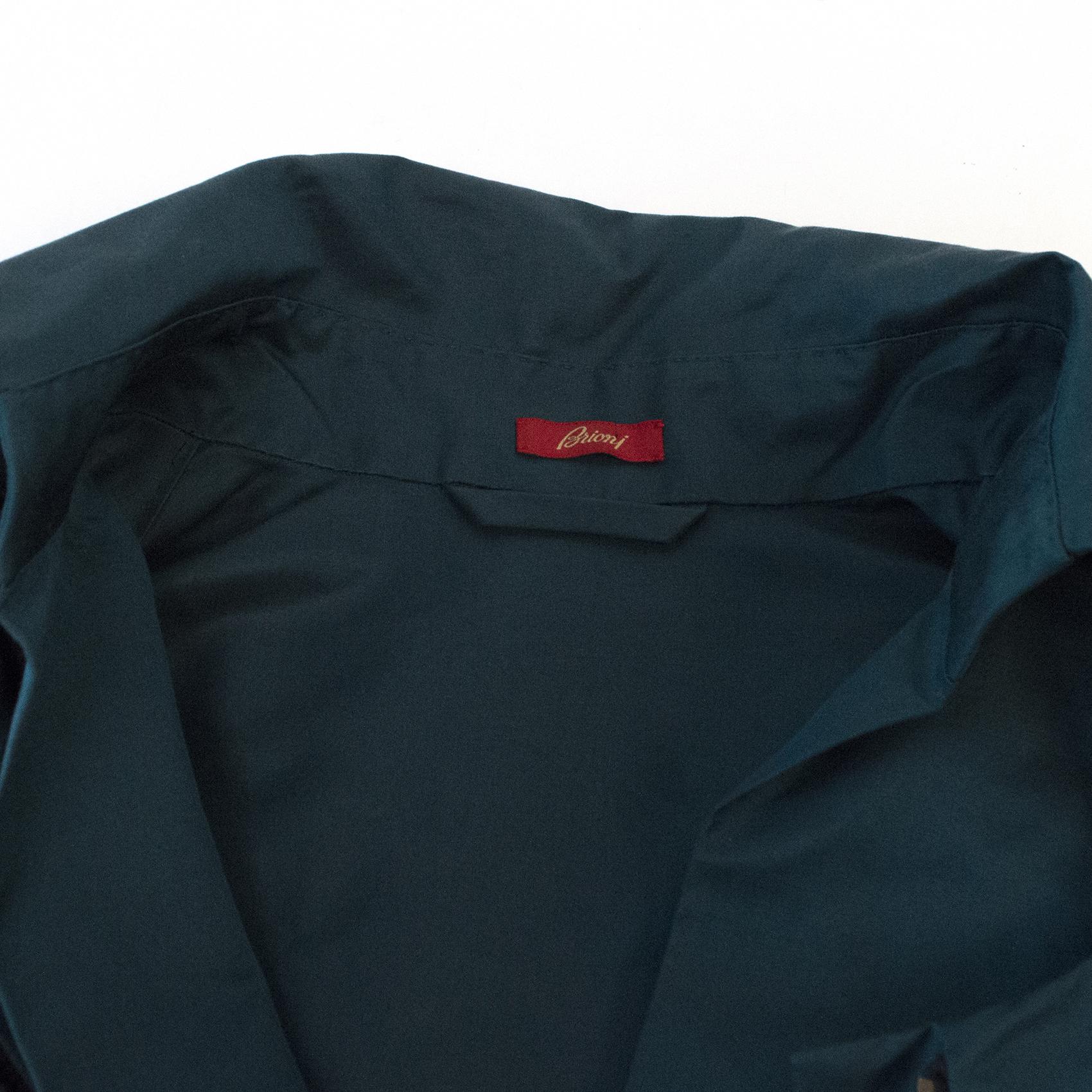 Brioni green/blue long trench coat with hood and ruched detailed waist. Matching belt to pull in at the waist.