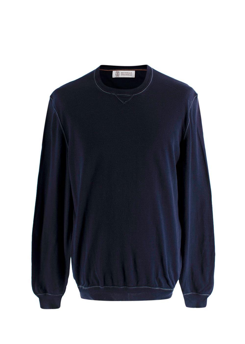 Elevate your wardrobe with this classic Brunello Cucinelli long-sleeve crewneck sweater in rich navy. Made with high-quality materials and impeccable Italian craftsmanship, this piece offers timeless style and comfortable wear. Features include a clean crew neckline, subtle stitching details, raglan-style shoulders, and a relaxed yet refined silhouette. The sweater has been gently worn and remains in excellent condition with minimal signs of use. Perfect for both casual and smart-casual looks — pair it with denim, chinos, or tailored trousers.
