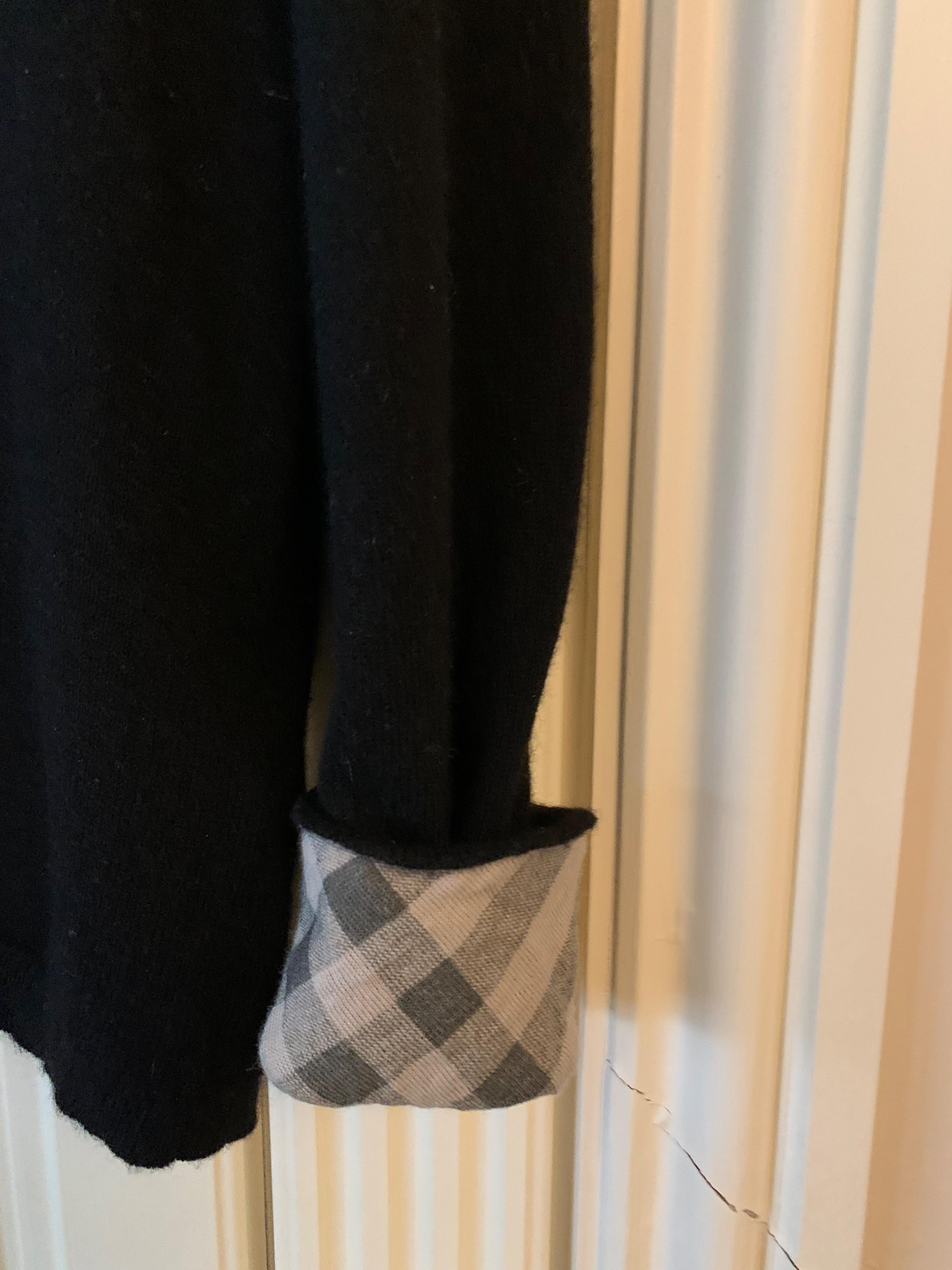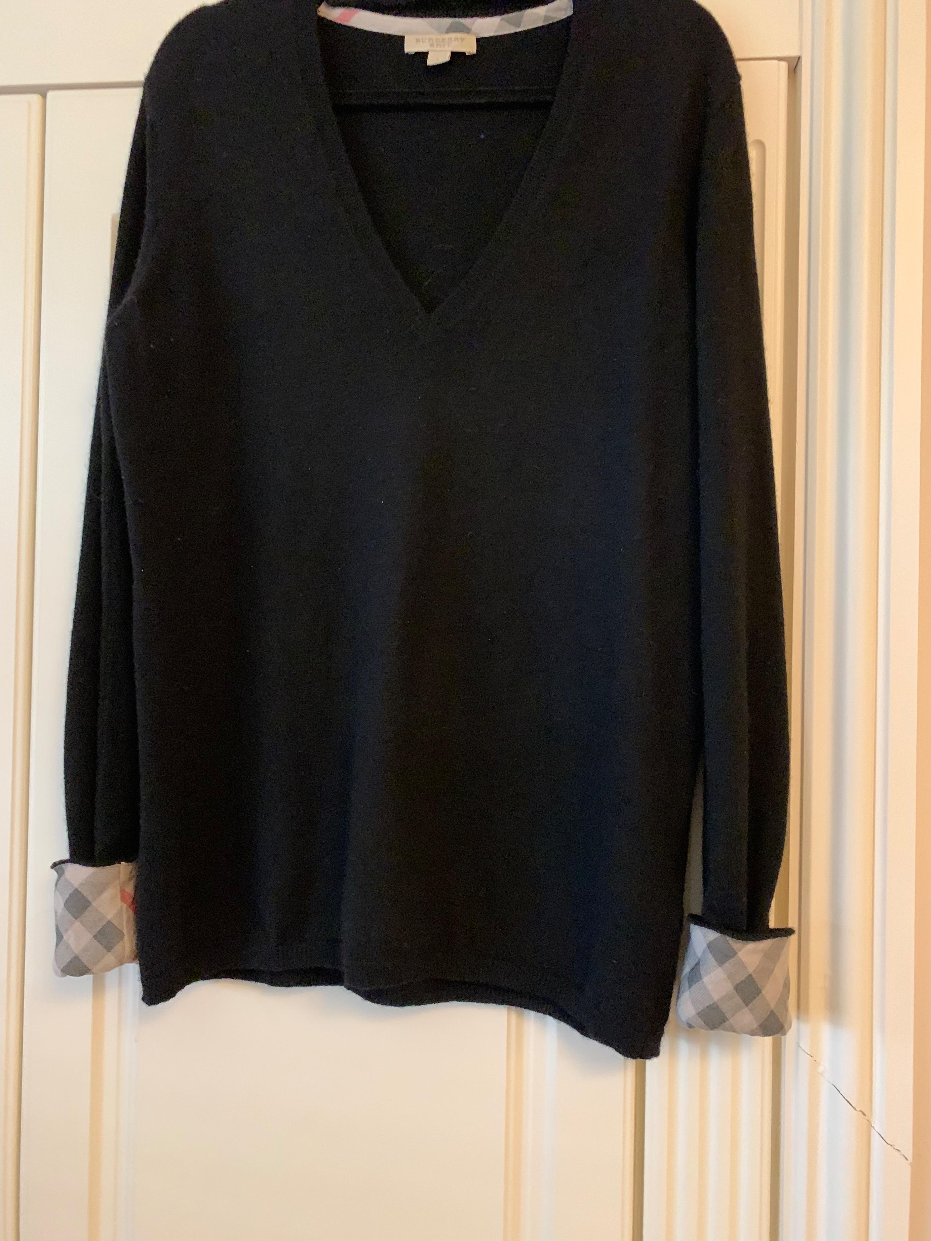 Burberry v neck 100% cashmere jumper with turn back fabric in Burberry print drops to just past waist with a slight shape