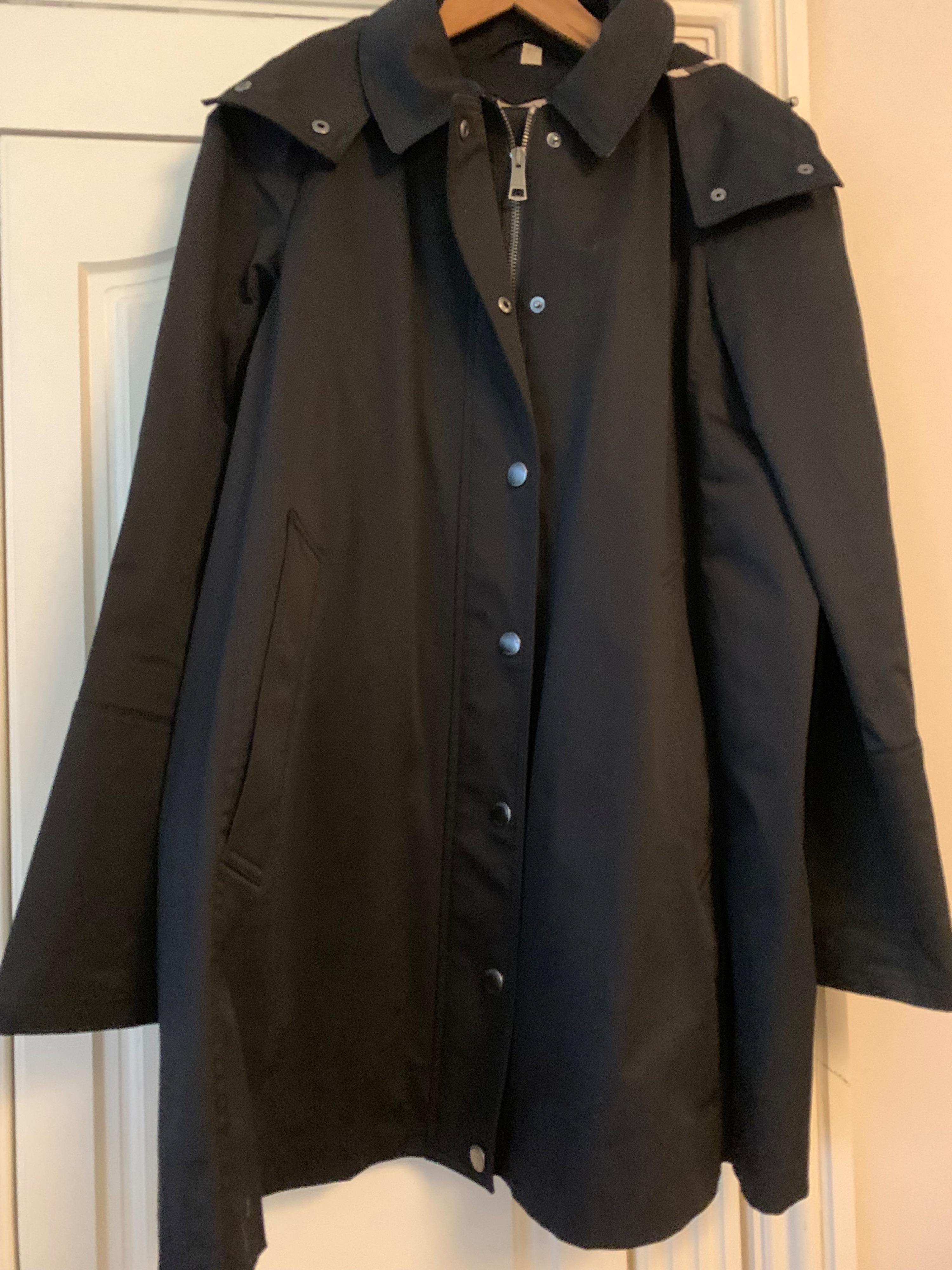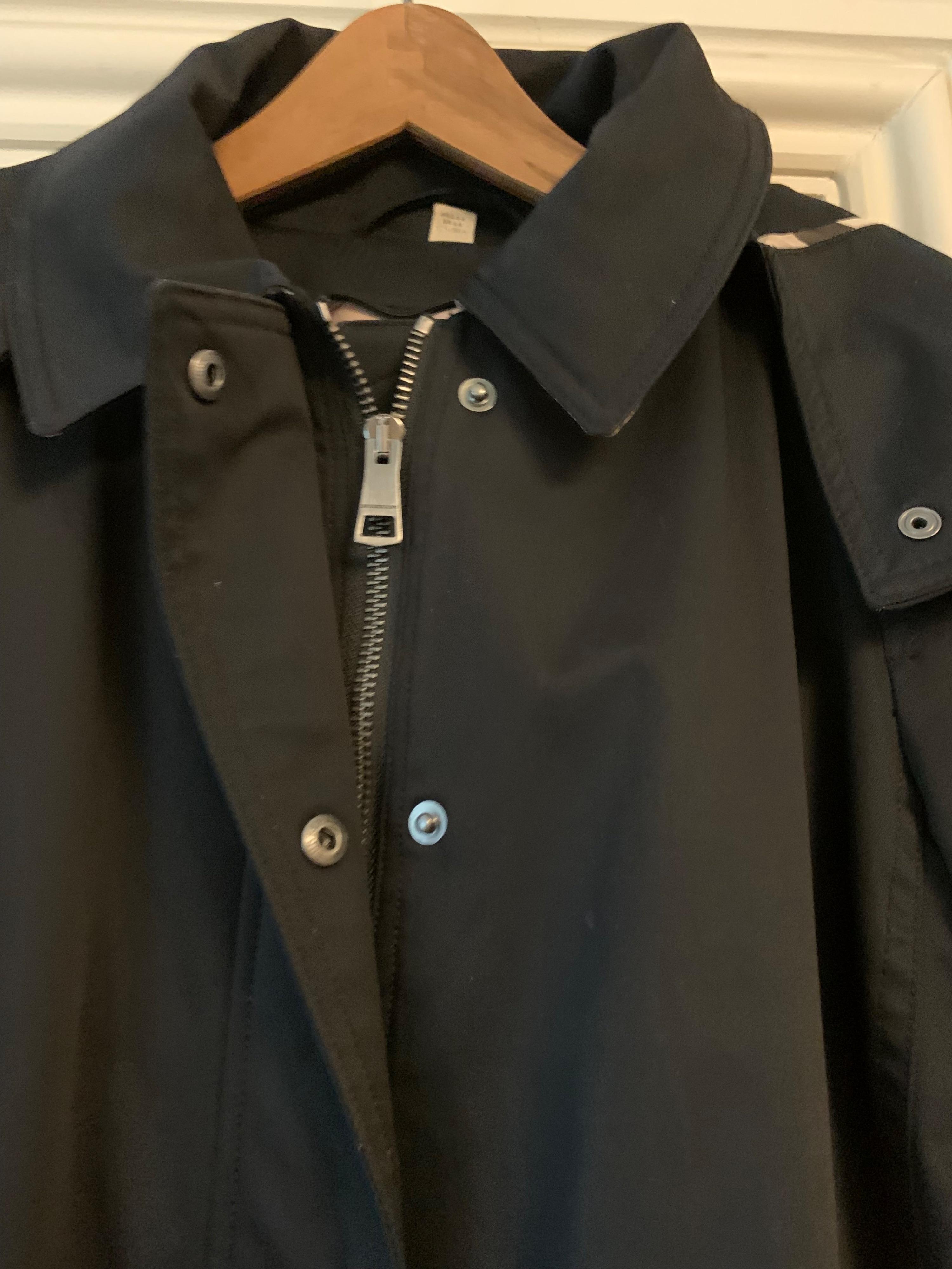 With classic Burberry fabric rain proof slightly a line. Zip fully functional both on jacket and hood. As new worn 3/4 times due to lost weight.