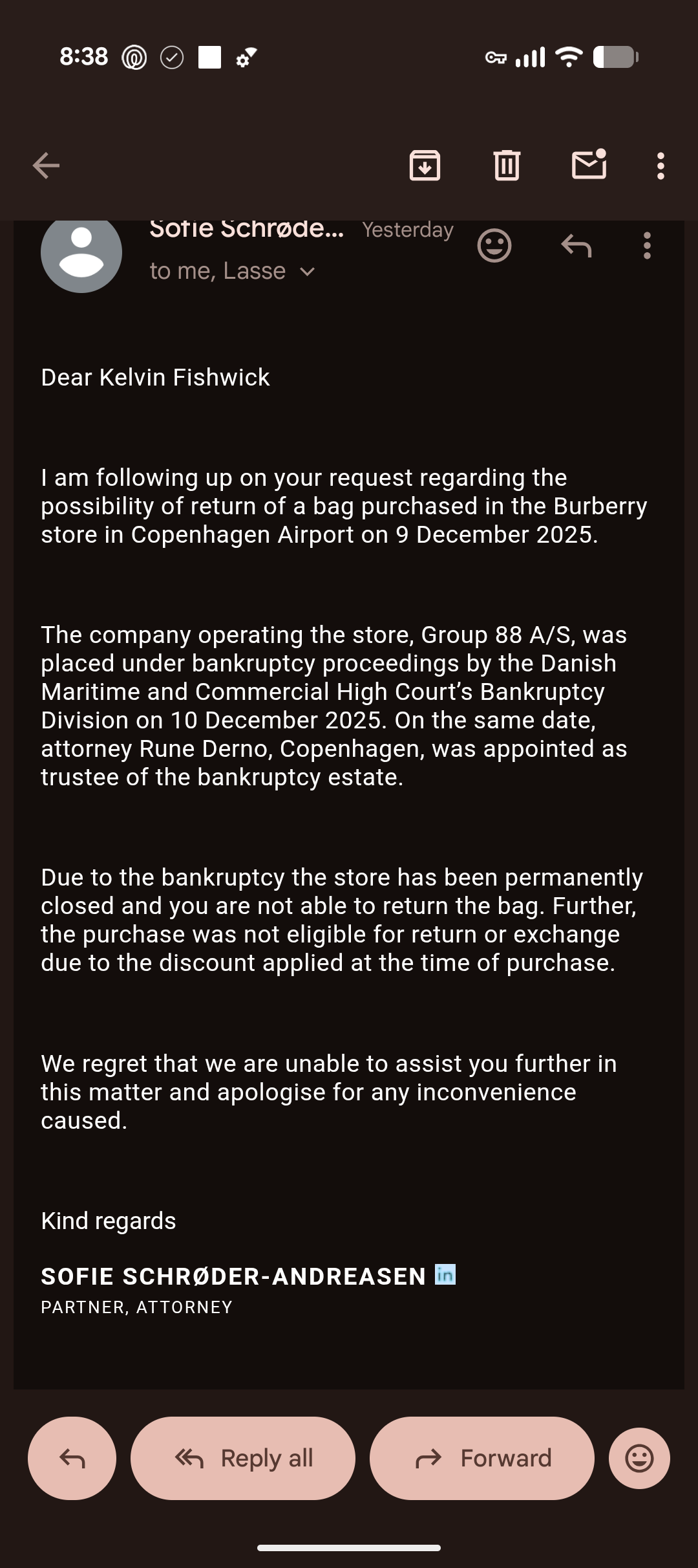 I bought this in Copenhagen Burberry 9/12/25 . The owner of the store went bankrupt so no chance to return and my wife didn't like the gift! Perfect and never worn.