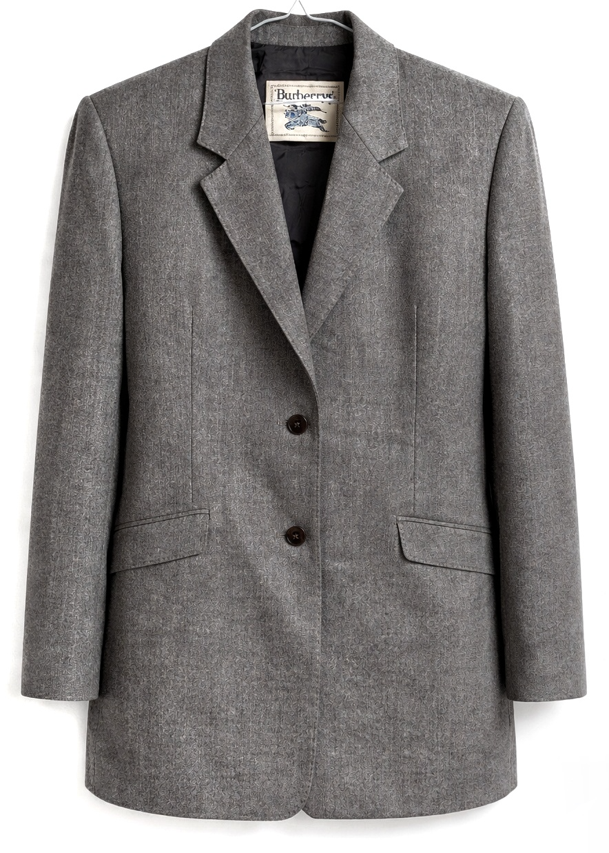 Burberrys vintage grey wool blazer with subtle pattern. Tailored fit with classic lapels and signature lining. Made in Spain. Size 42 (IT), approx. M.
