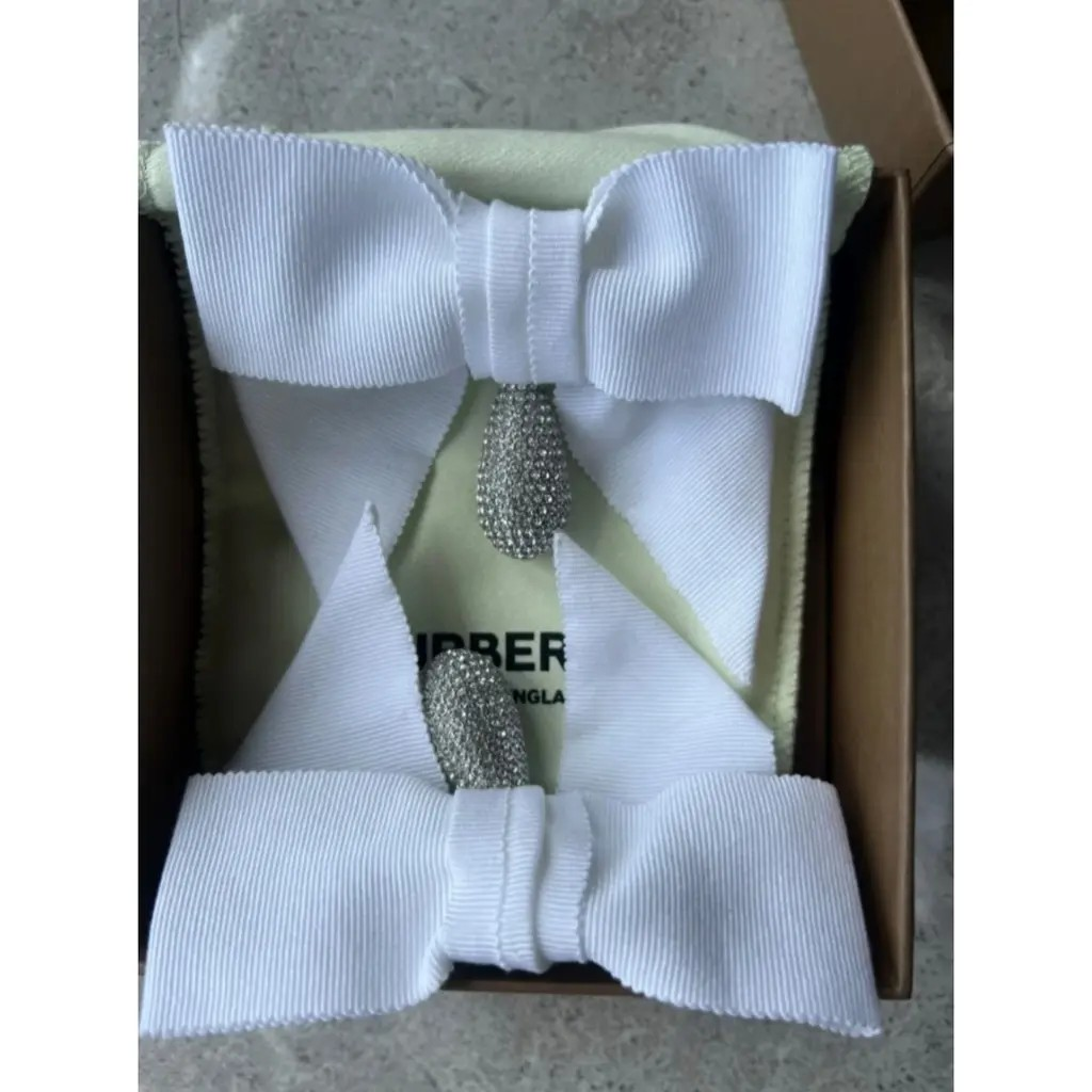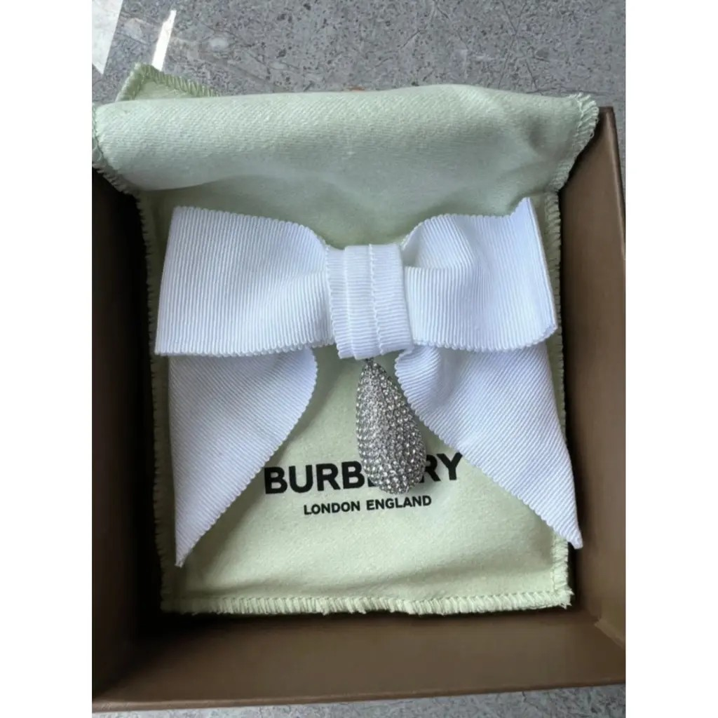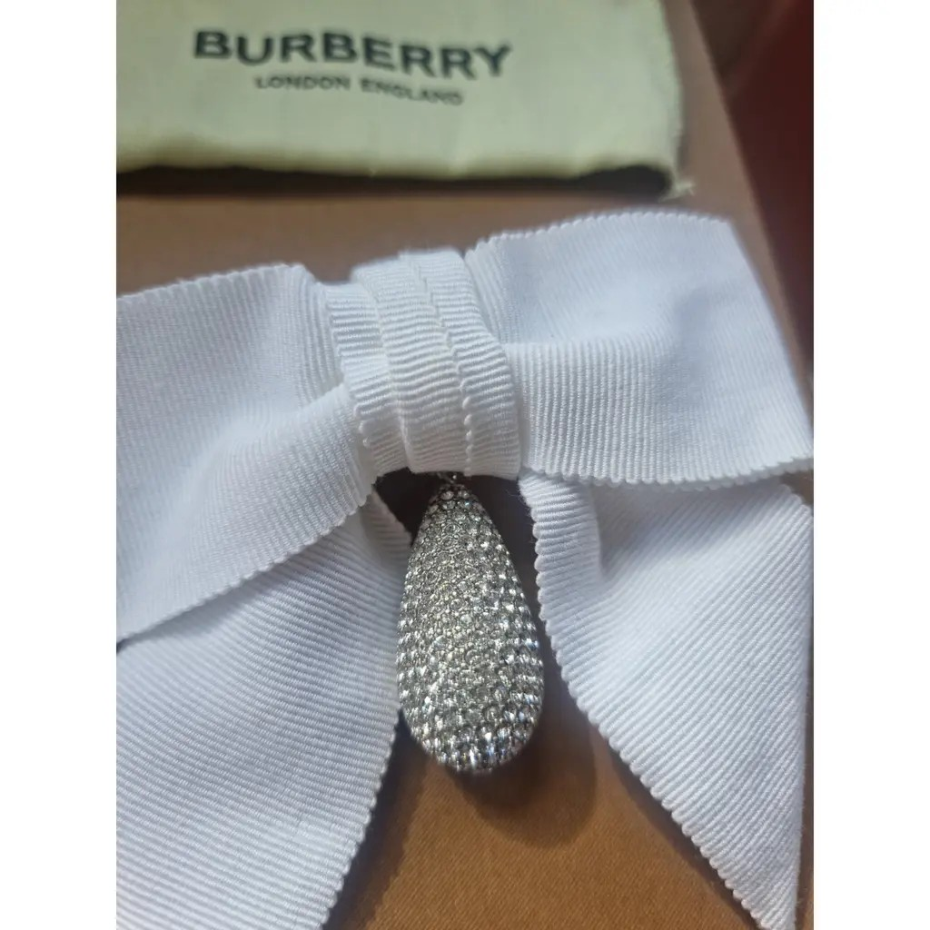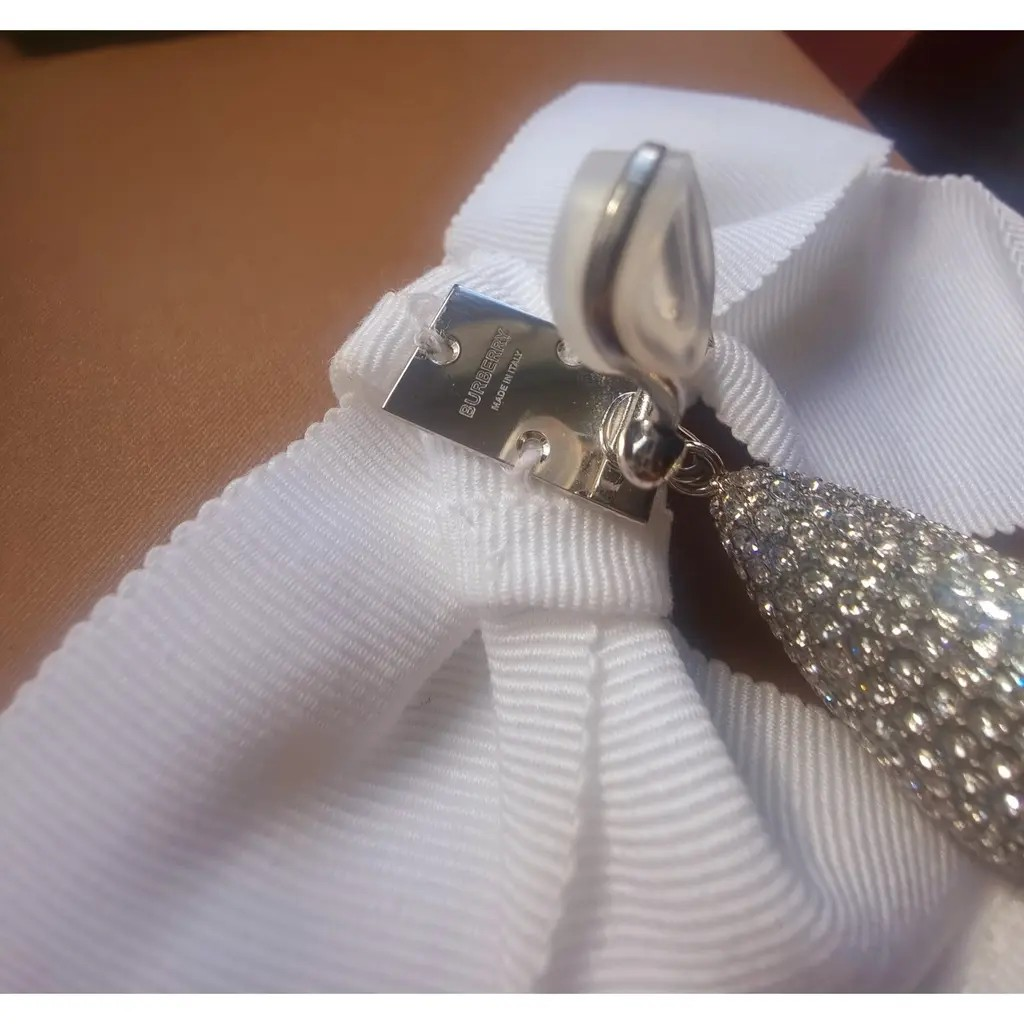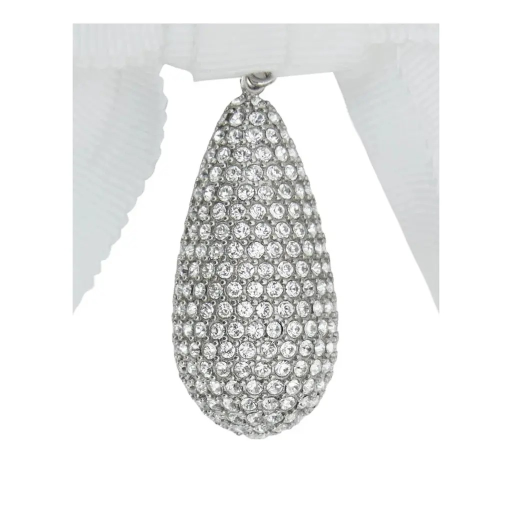 A pair of clip on Burberry oversized bow earrings in grosgrain ribbon, adorned with a palladium-plated drop pendant embellished with light-catching pavé crystals.
