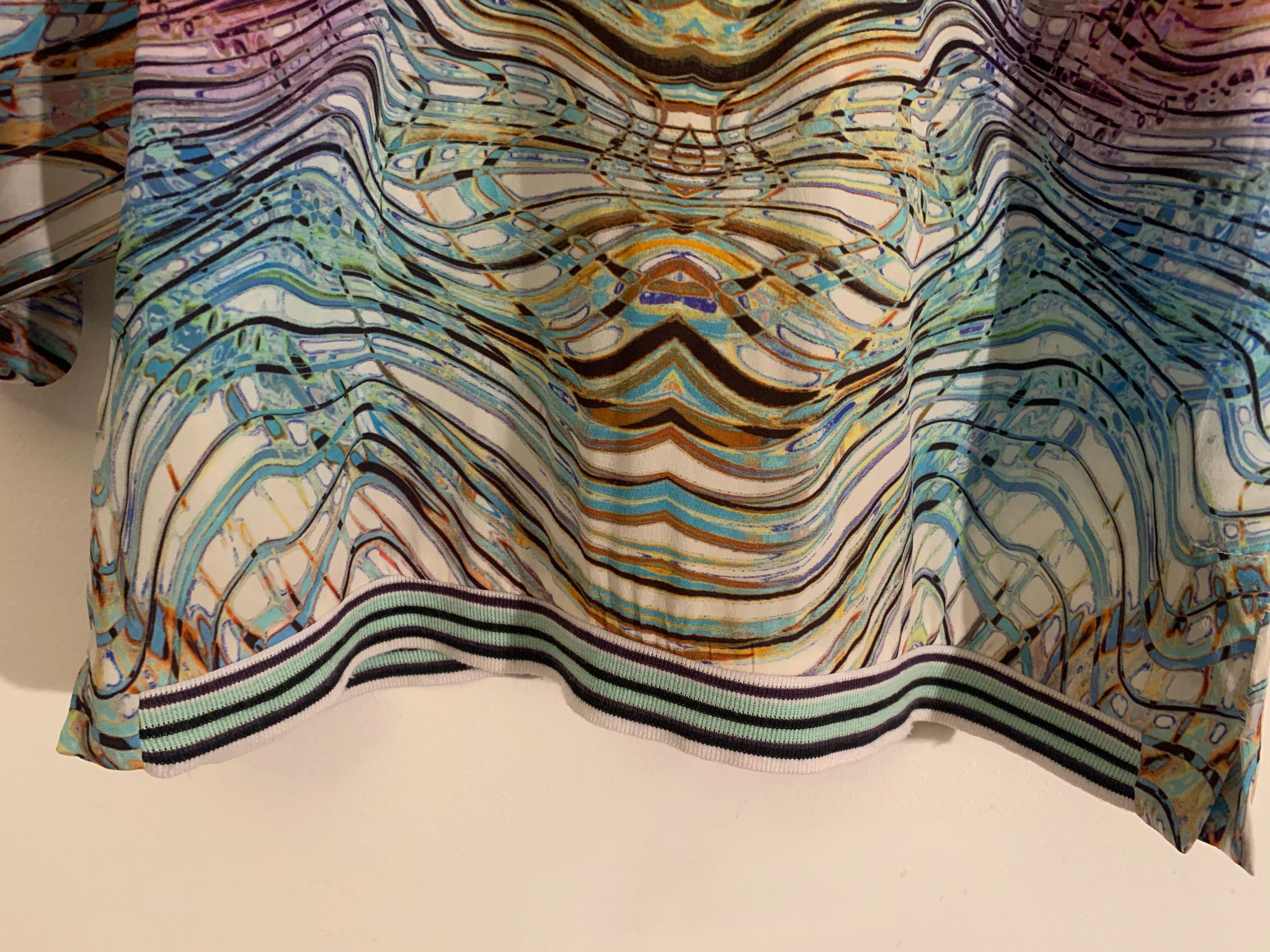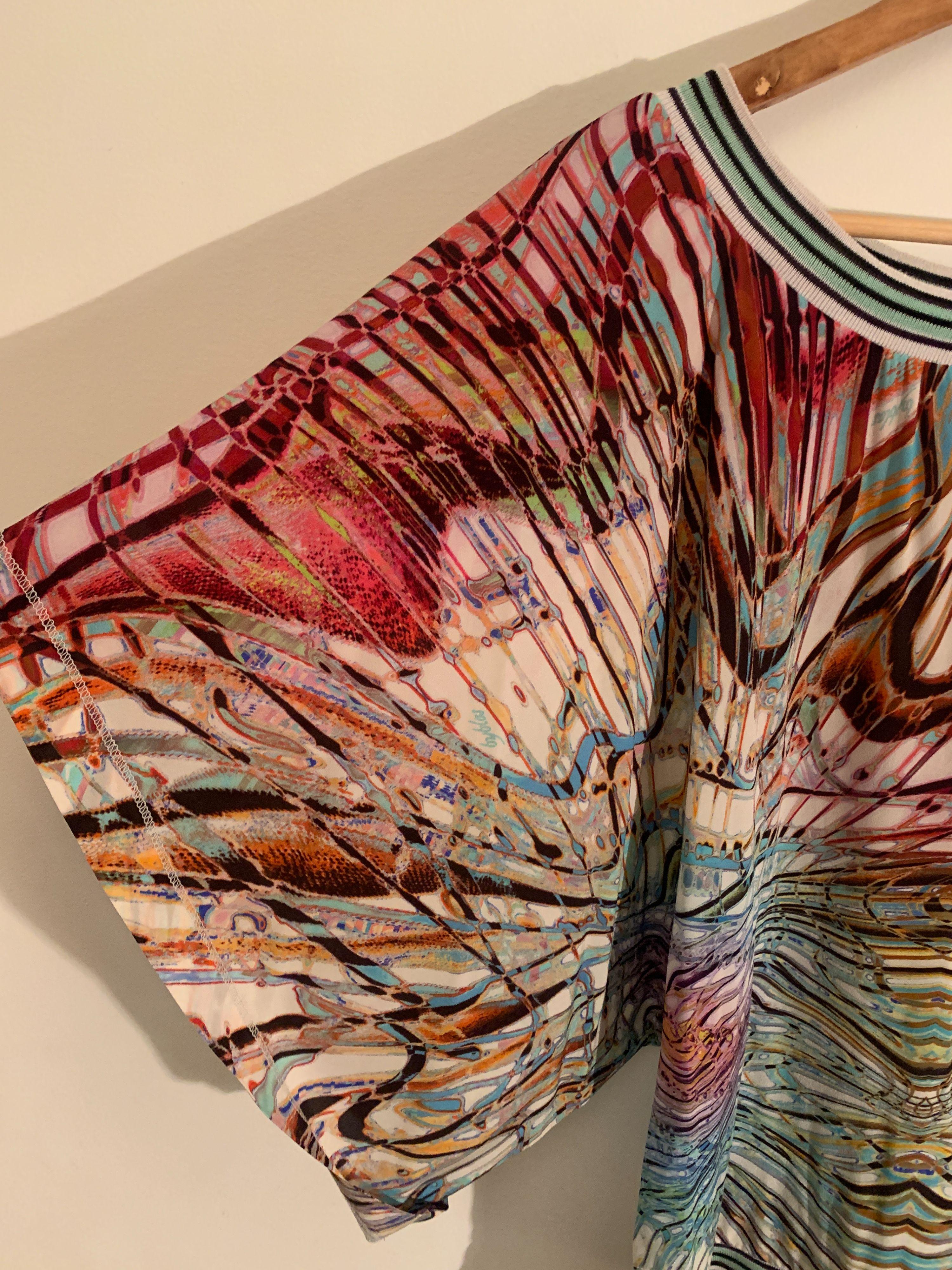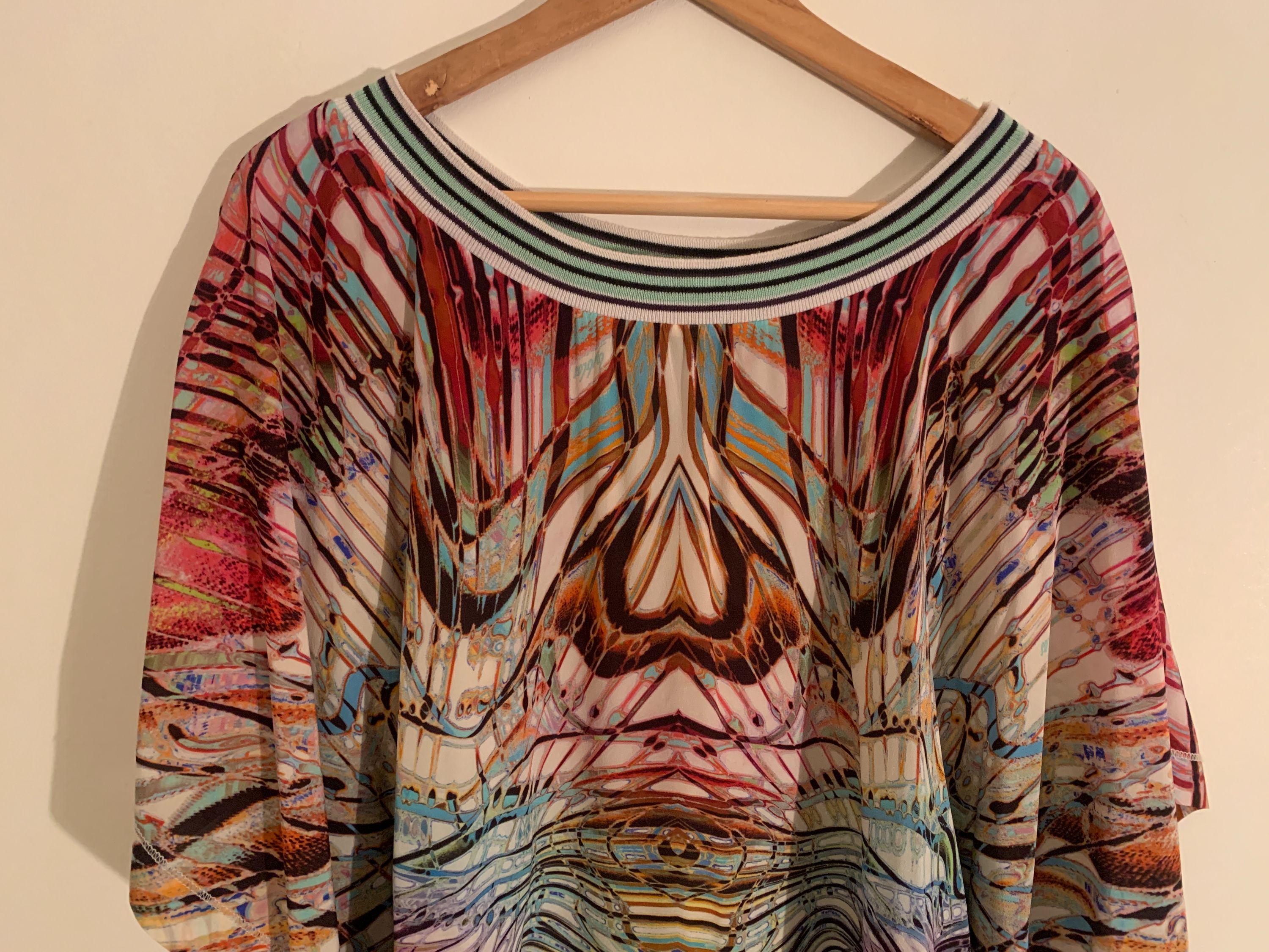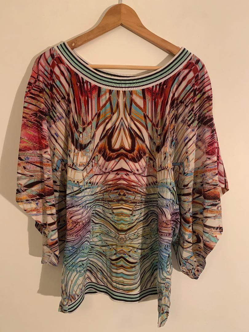 BYBLOS silk multicoloured astract print, 3/4 length wide kimono style sleeved blouse with ribbed retro style neckline & hemline trim. Fitted at the waist. The colours are stunning which I was unable to fully capture in the pictures and the blouse is like a piece of artwork. Floaty & feminine. Perfect resortwear. Made in Italy.