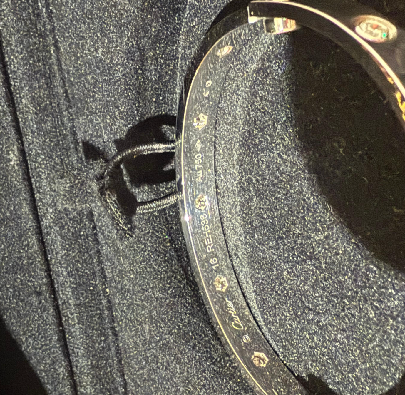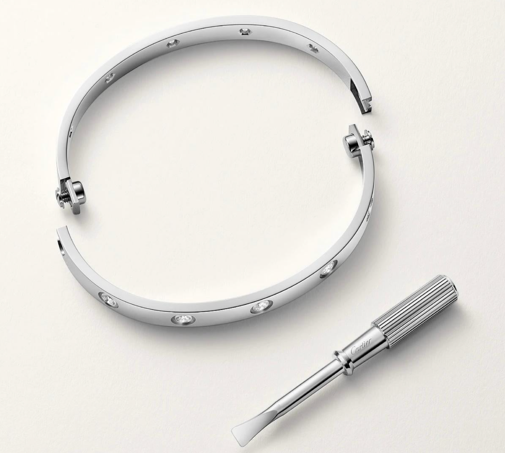 Carter love bracelet , the classic model in 18k white gold and 10 DIAMONDS. Set with 10 brilliant-cut diamonds totalling 0.96 carat, original fastening system with two functional screws. Comes with a screwdriver. Comes with box and certificate.