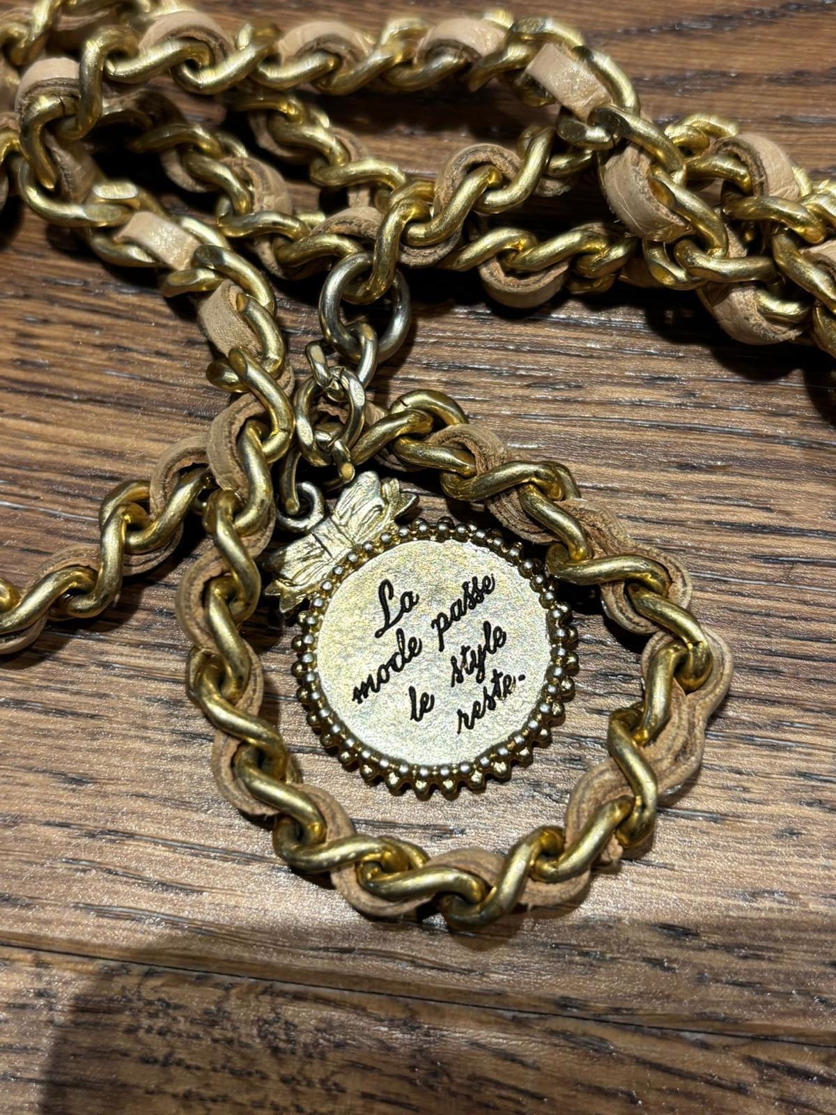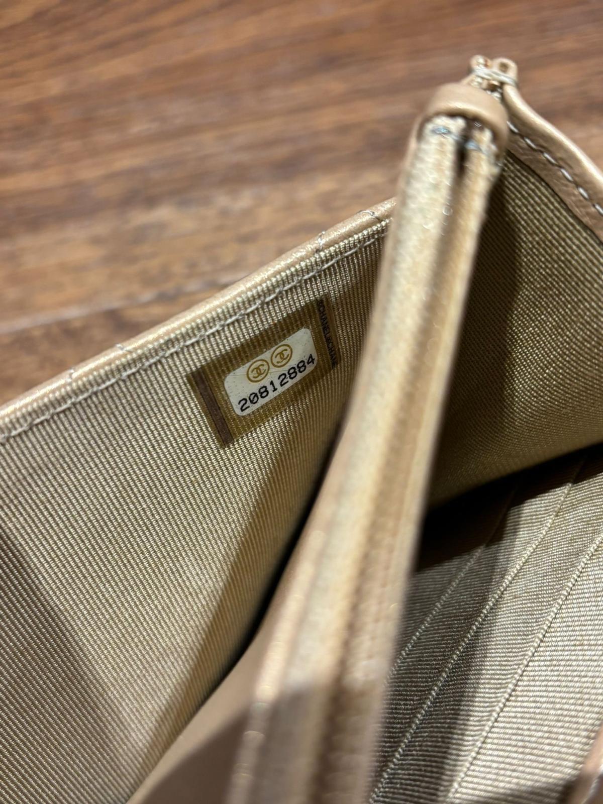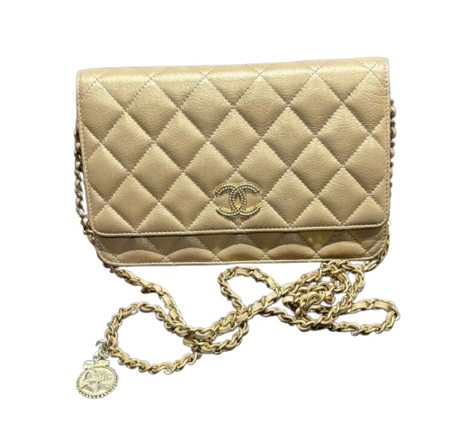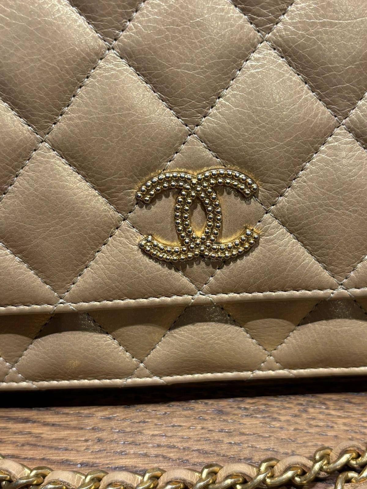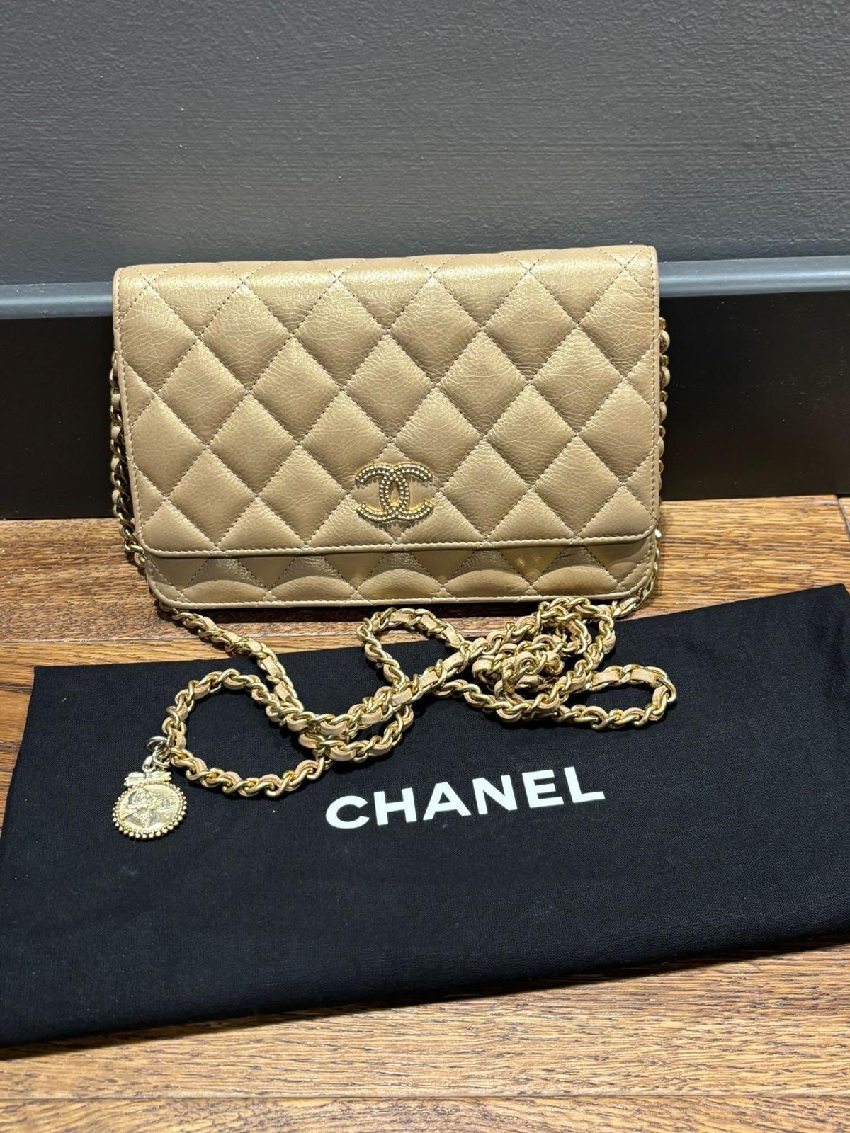 A beige lambskin Chanel Wallet on Chain with gold hardware. Features the iconic quilted pattern and a CC logo on the front flap. The chain strap is interwoven with leather. Includes a decorative charm with French text. Interior is lined with beige leather and fabric, with multiple card slots and a zippered compartment. Serial number visible inside.
