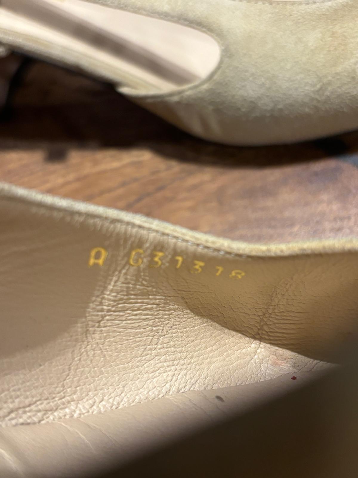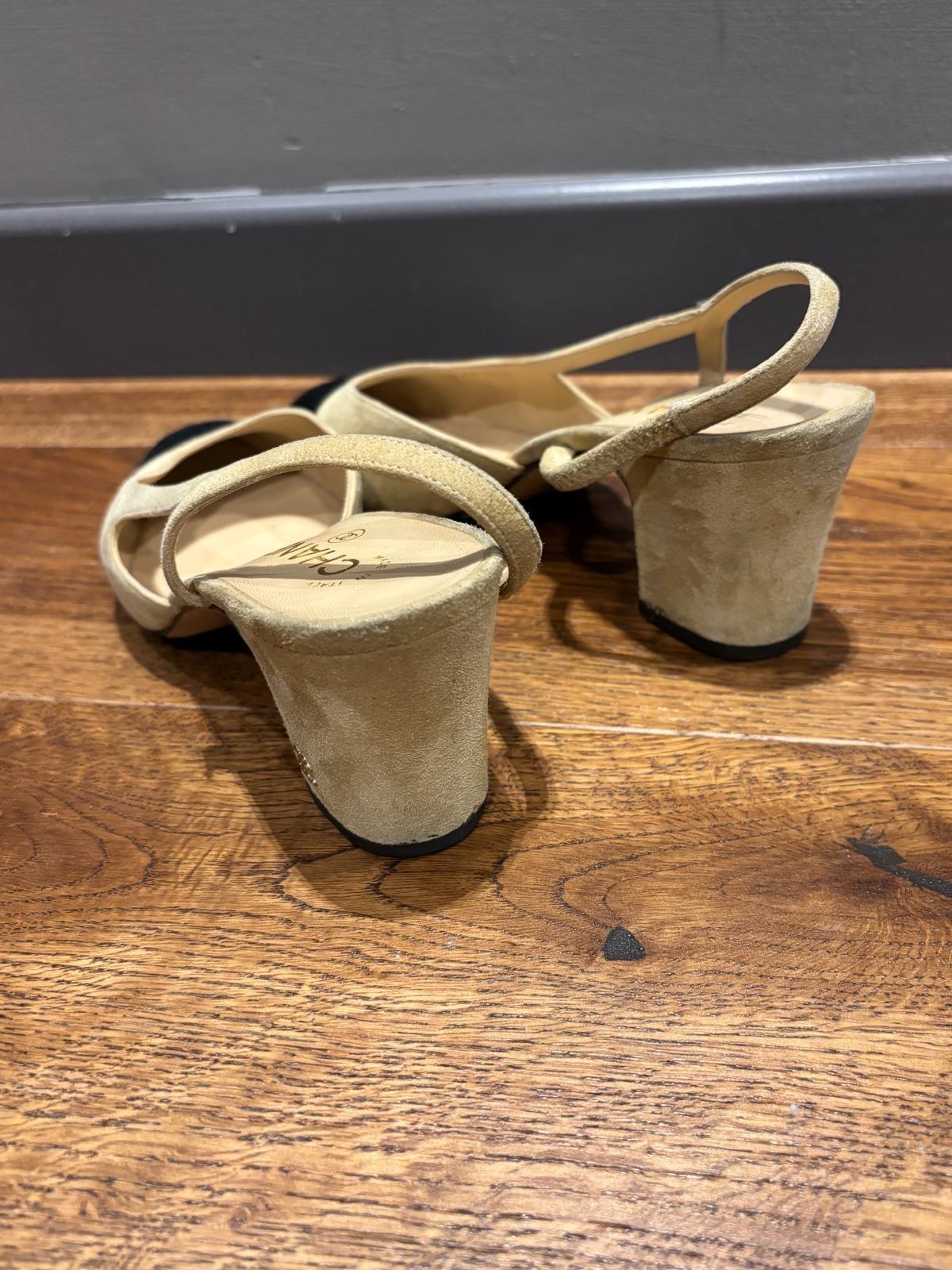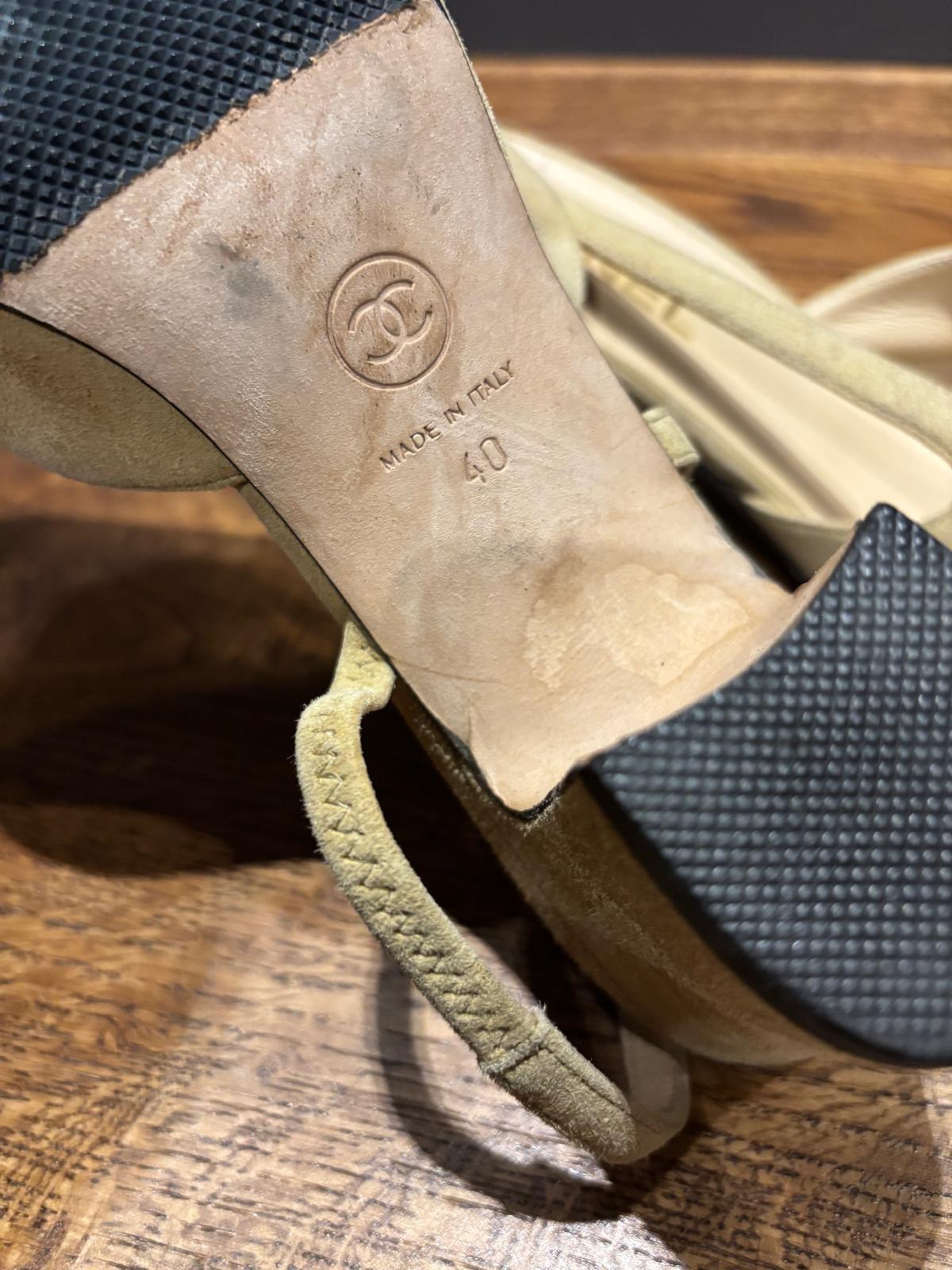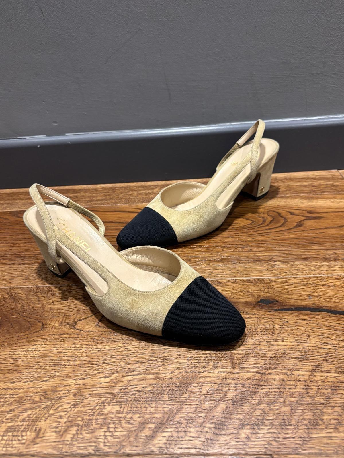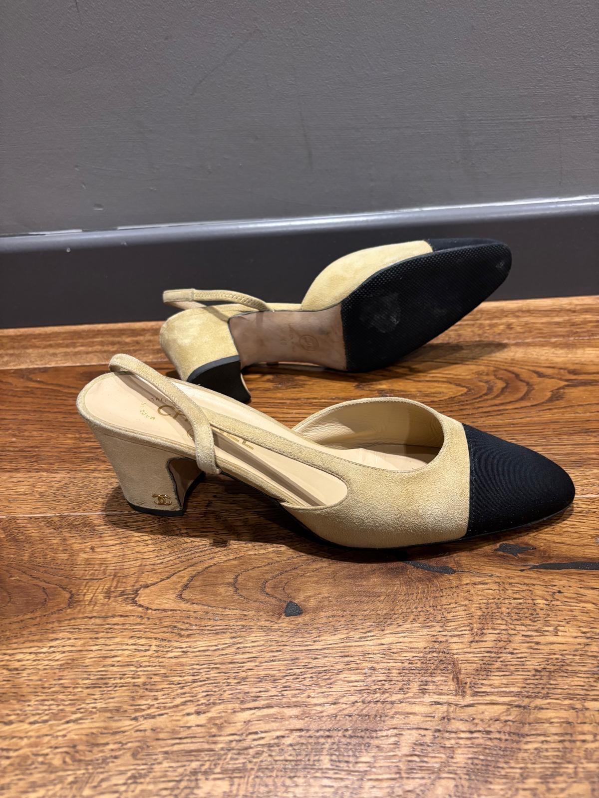 Chanel two-tone slingback heels in beige suede with a black cap toe. Features a low block heel with a subtle Chanel logo detail. Made in Italy. Visible signs of wear on the soles and insoles, and some scuffing on the suede.