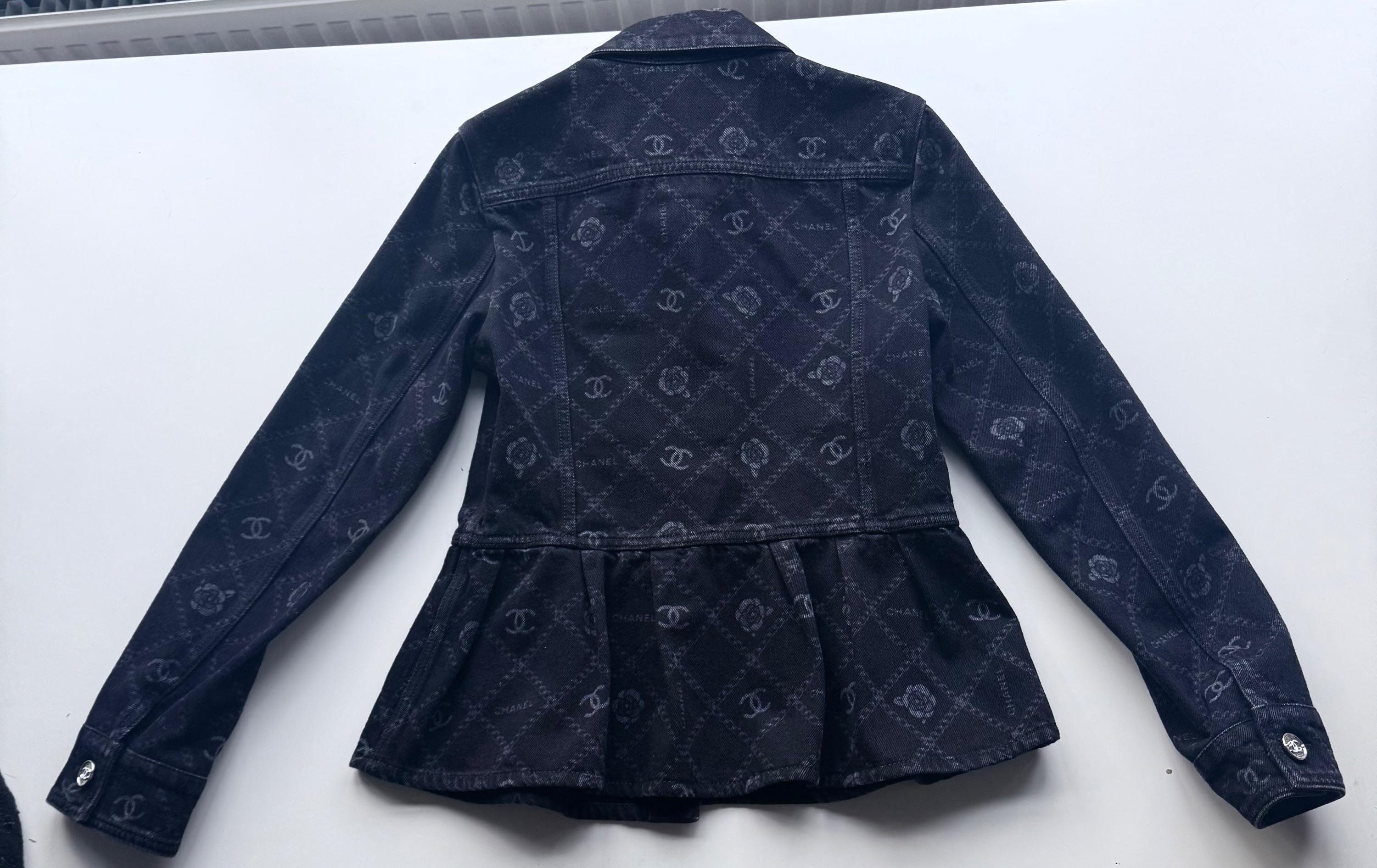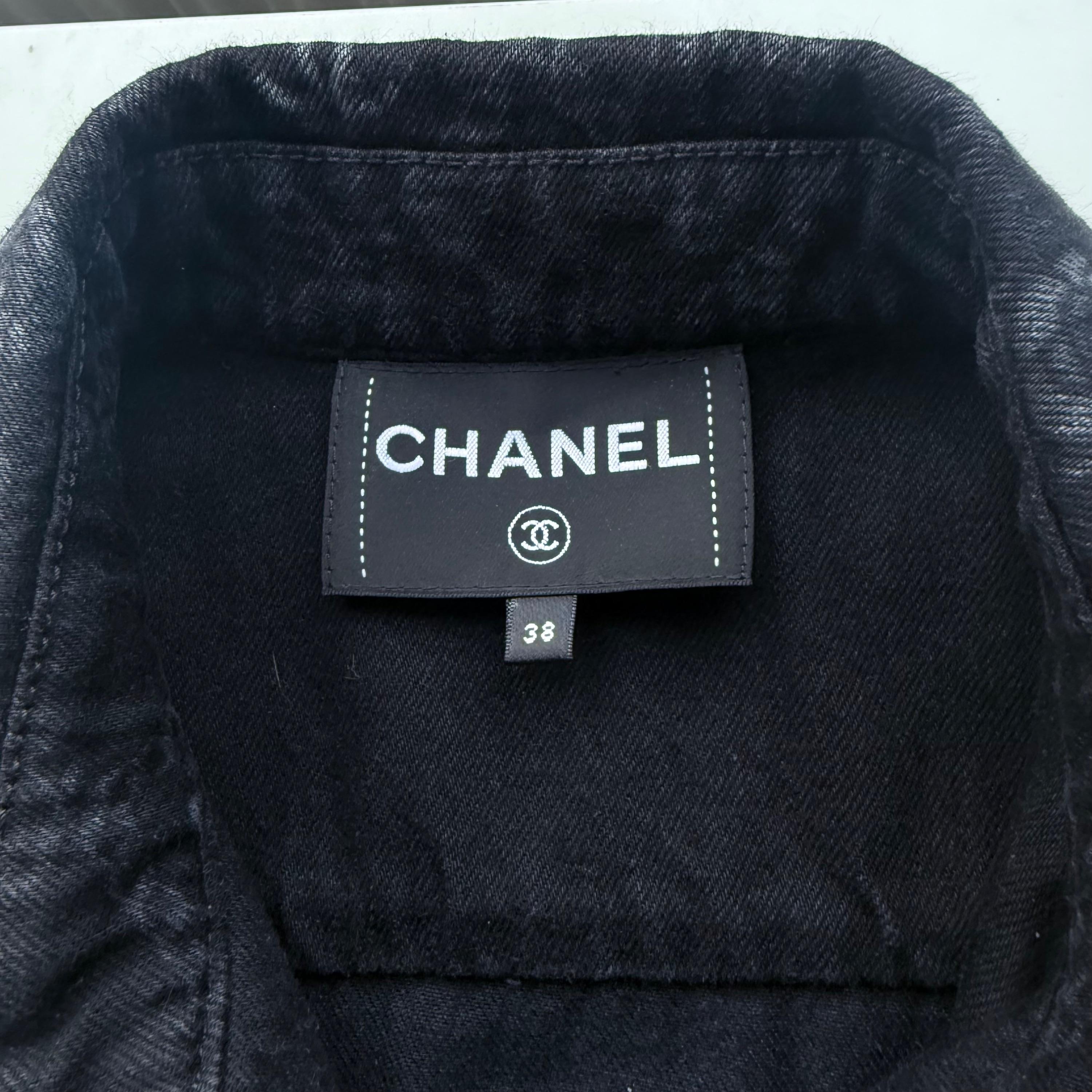 This phenomenal Chanel Paris-Dakar Evening Jacket is from the Pre Fall 2023 Métiers d'Art collection designed by Virginie Viard. The jacket is black denim with interlocking CC Logo, Camellia Accents all over. The jacket has a pointed Collar and Slit Pocket. The buttons are shiny silver metallic with CC logo. It is truely an amazing jacket, sold out, impossible to find a true collector's item!
