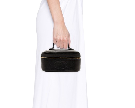 This vanity bag features a caviar leather body, a flat top handle, a top zip-around closure, and an interior slip pocket. pls use zoom