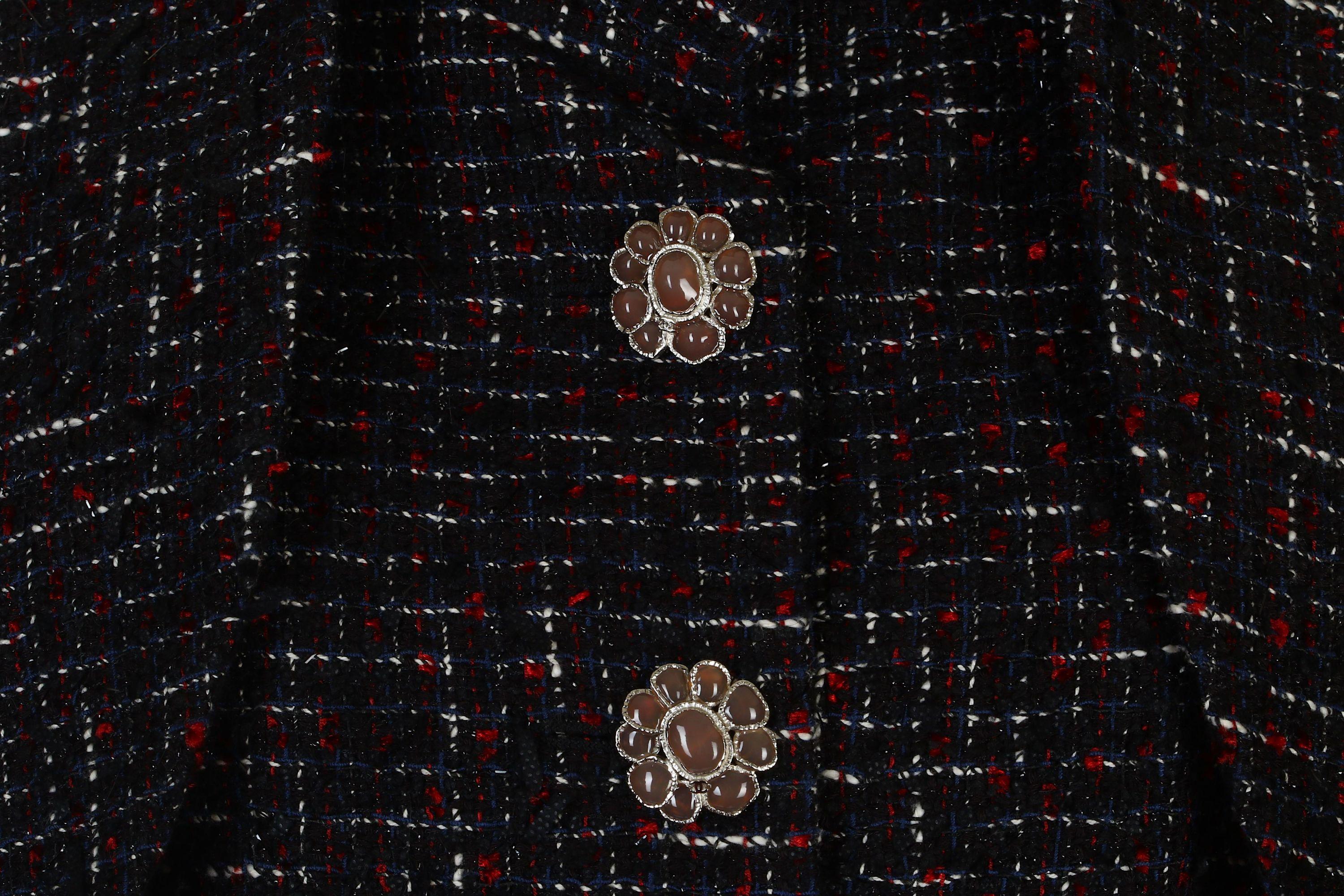 In Excellent condition- This Magnificent Chanel Tweed Jacket in Black Blue Red & White checkered tweed has fabulous CC logo Gripoix jewel buttons, and is silk lined.