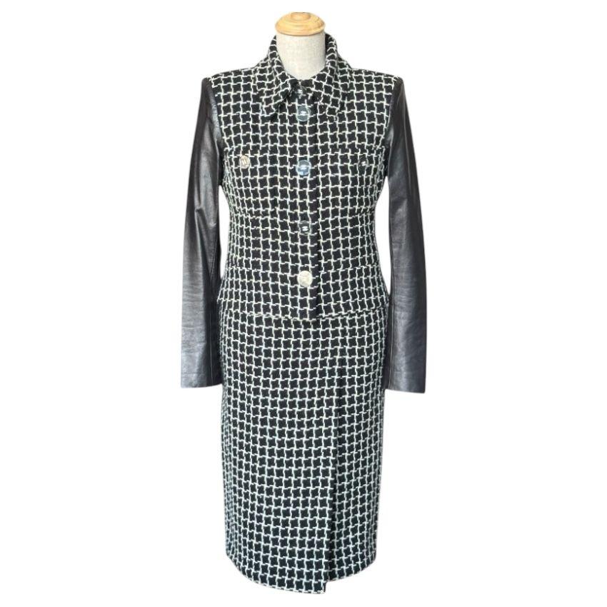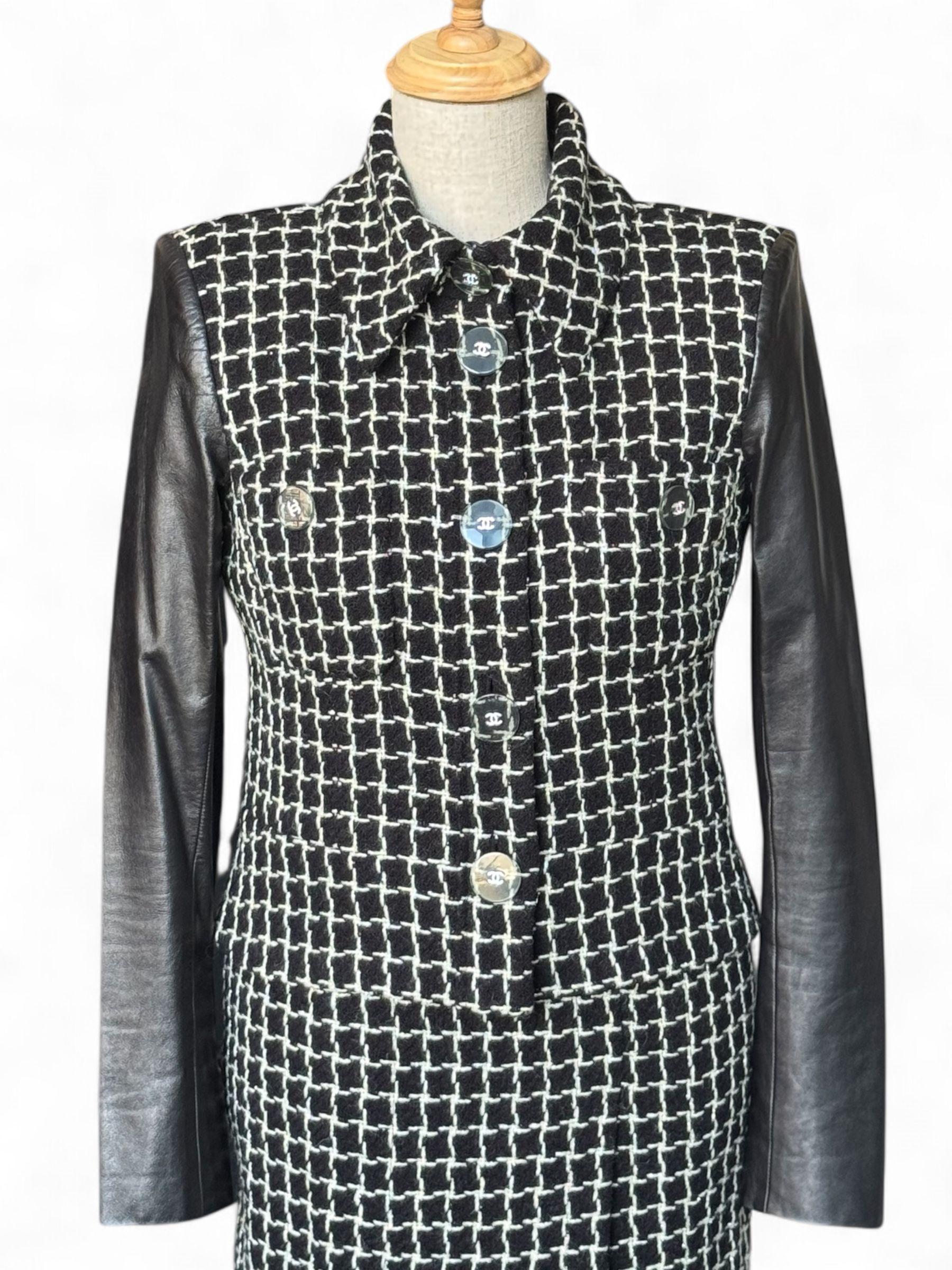 Iconic Chanel black and white check with silver threads ensemble, jacket with leather sleeves with zips at the cuffs and matching skirt.