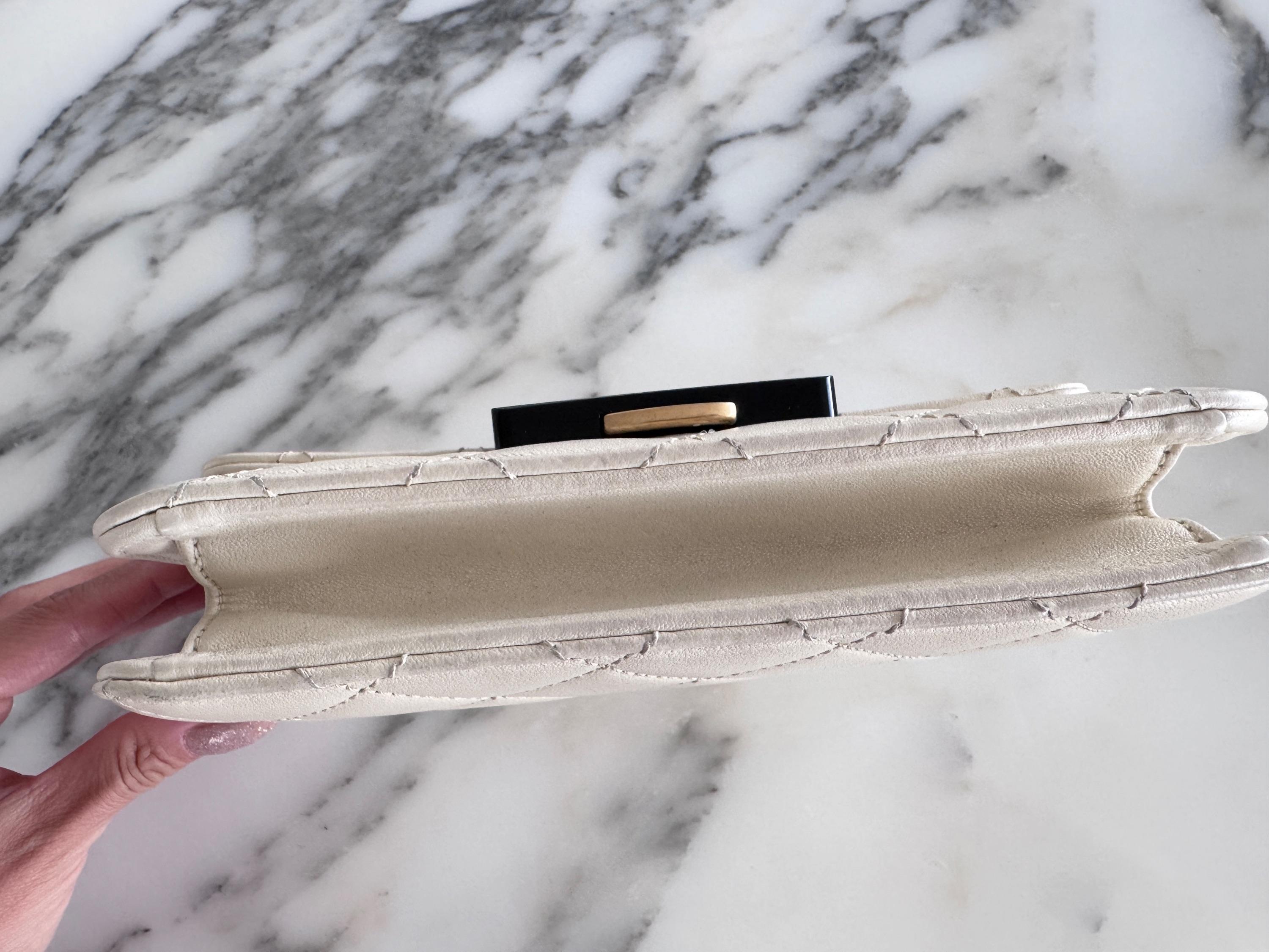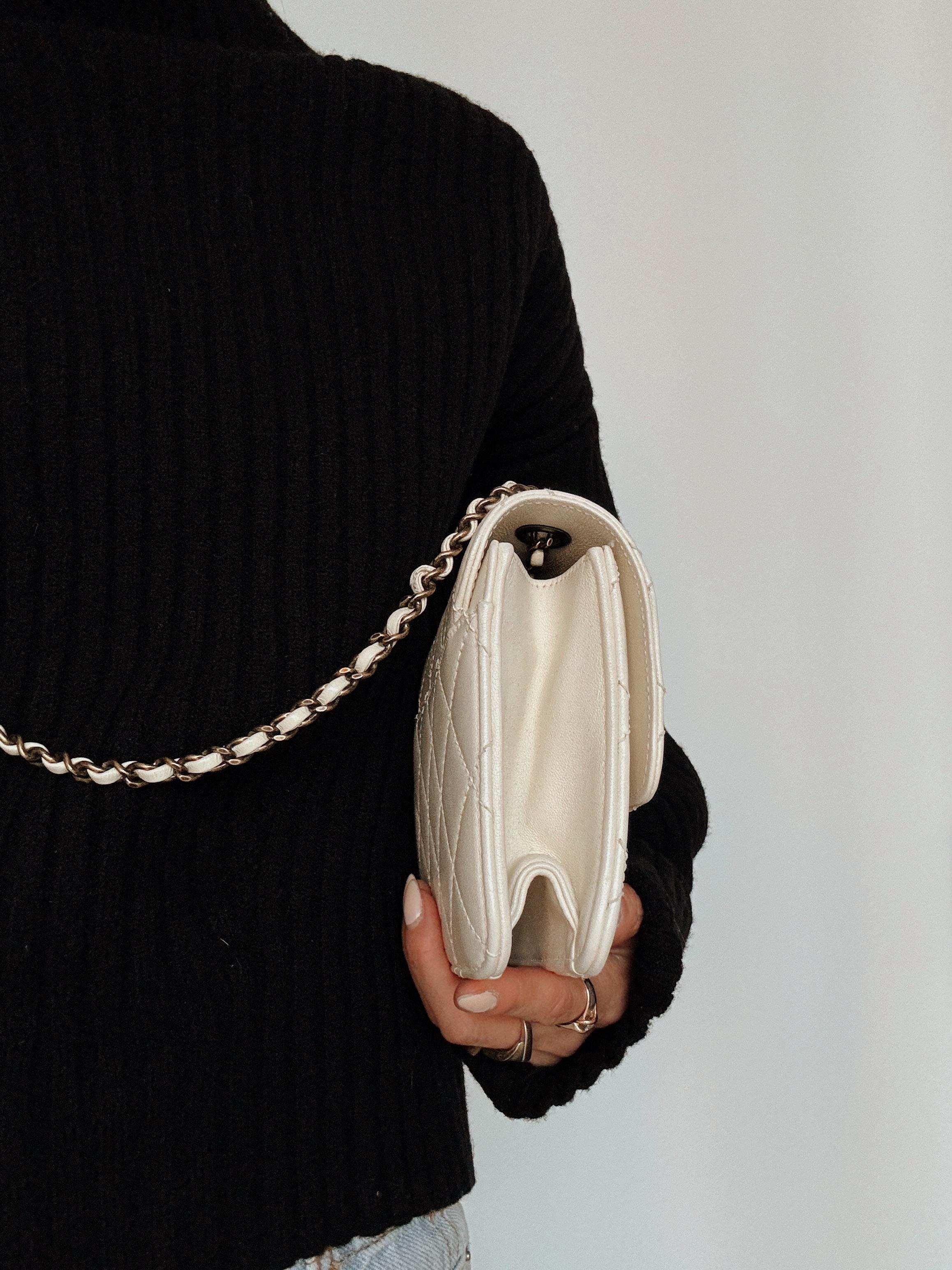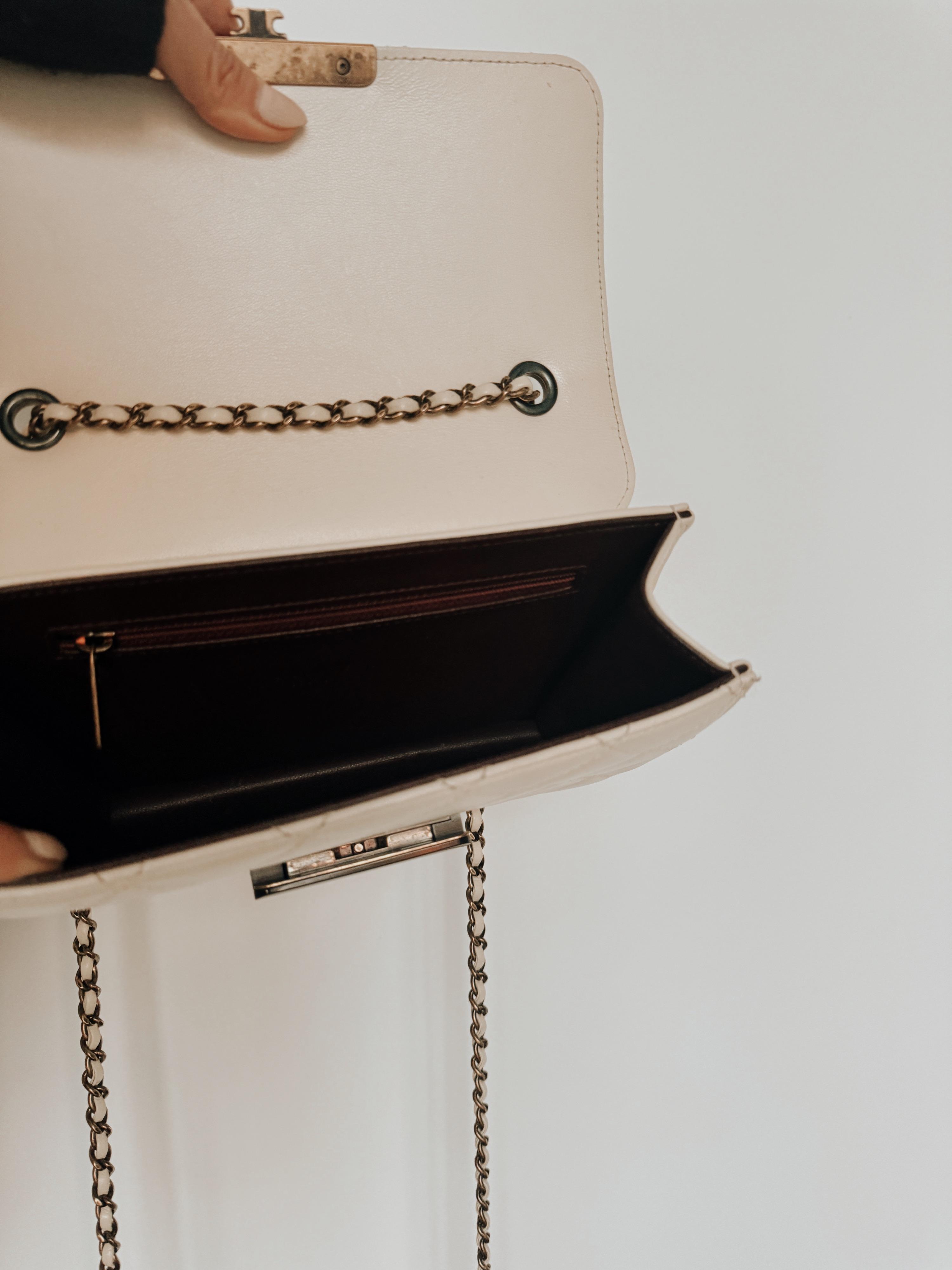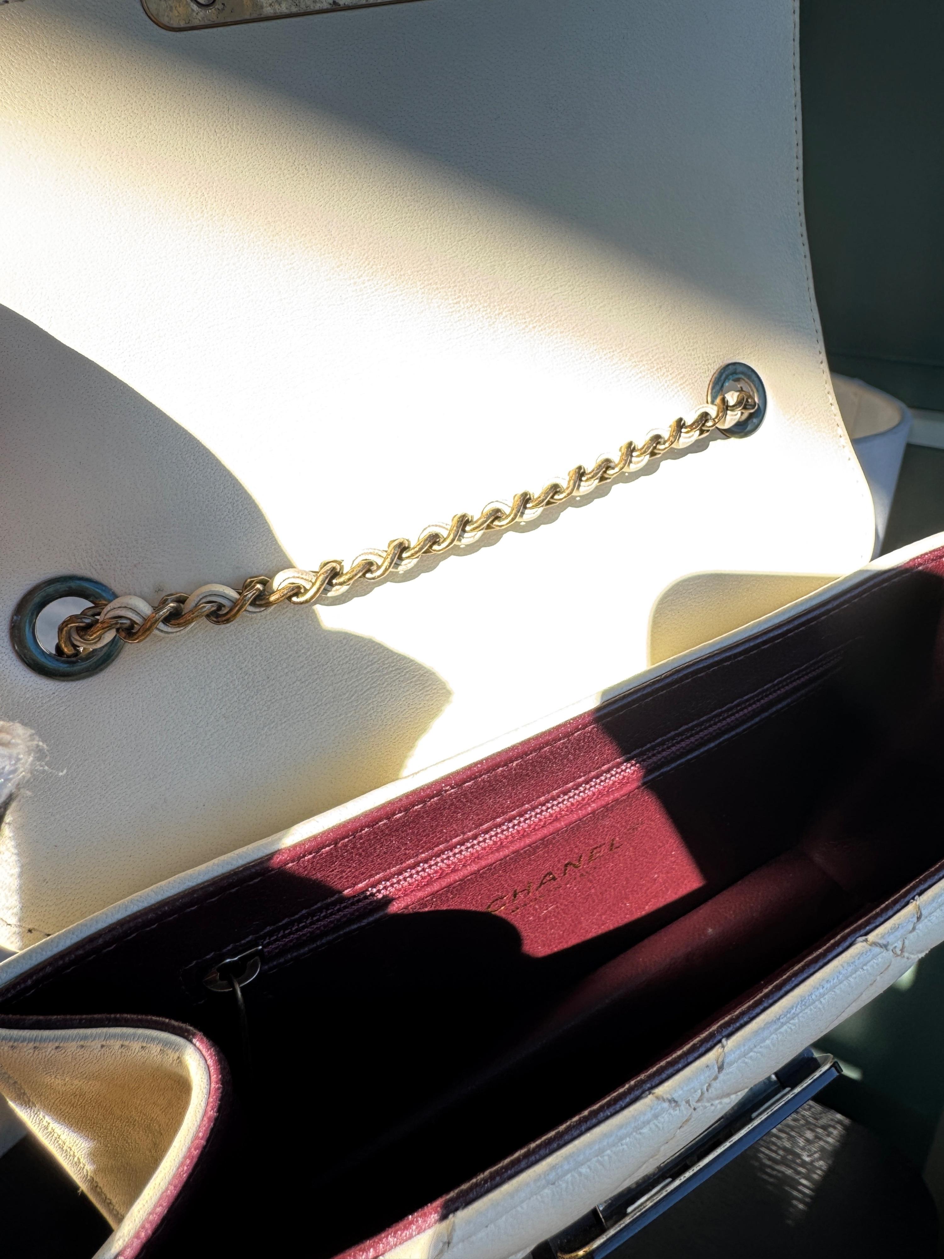 Gold-tone chain link shoulder strap with a cream leather shoulder pad