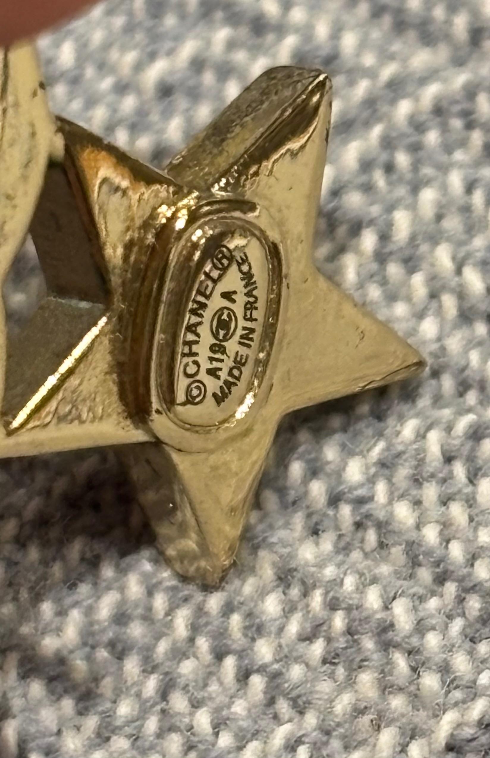 A pair of Chanel earrings featuring the iconic CC logo adorned with crystals, with one earring shaped as a star and the other as a heart, both accented with a pearl. Made in France.