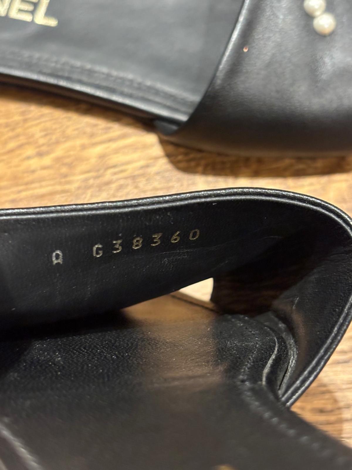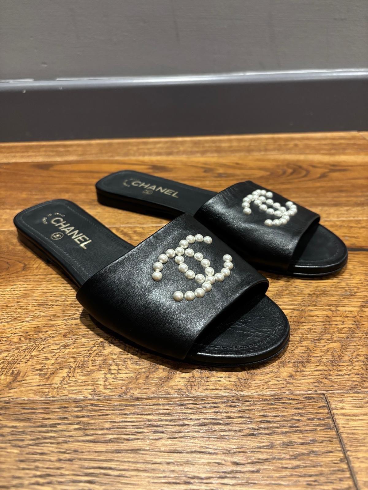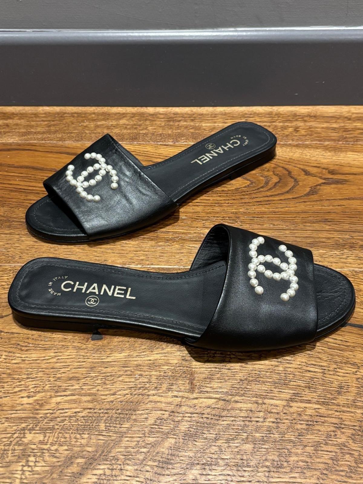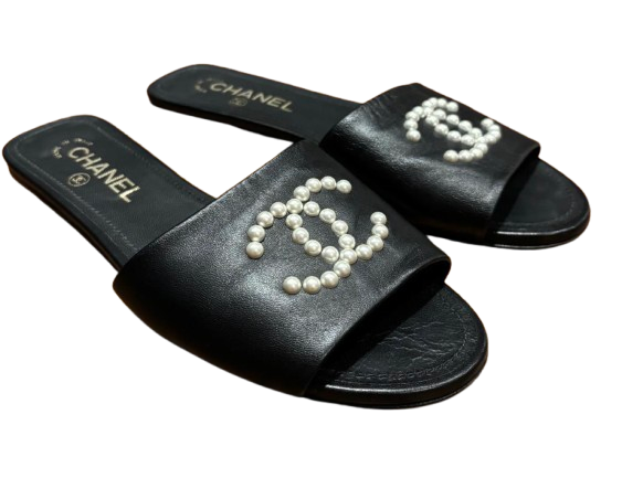 Chanel black leather slide sandals with pearl CC logo embellishment. Made in Italy. Size 38.5. Shows signs of wear on the soles.