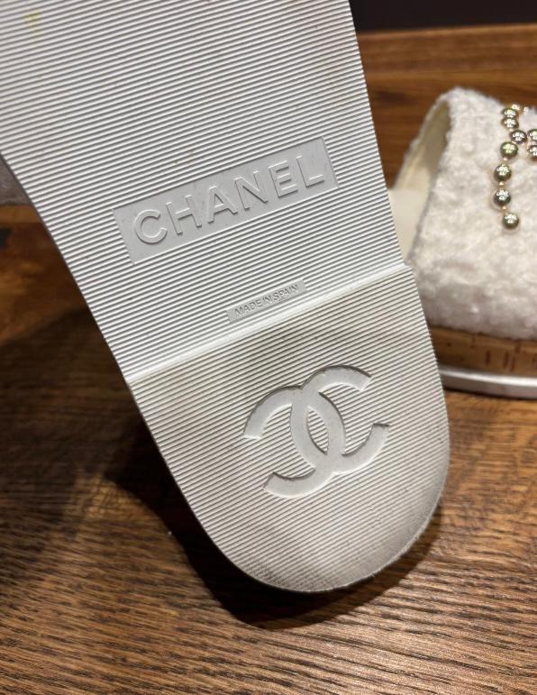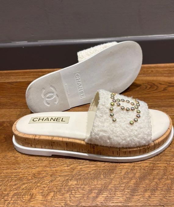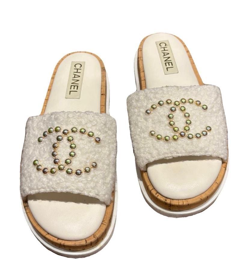 Chanel white terrycloth slides with CC logo embellished with pearls and studs. Cork platform sole. Size 39 FR.