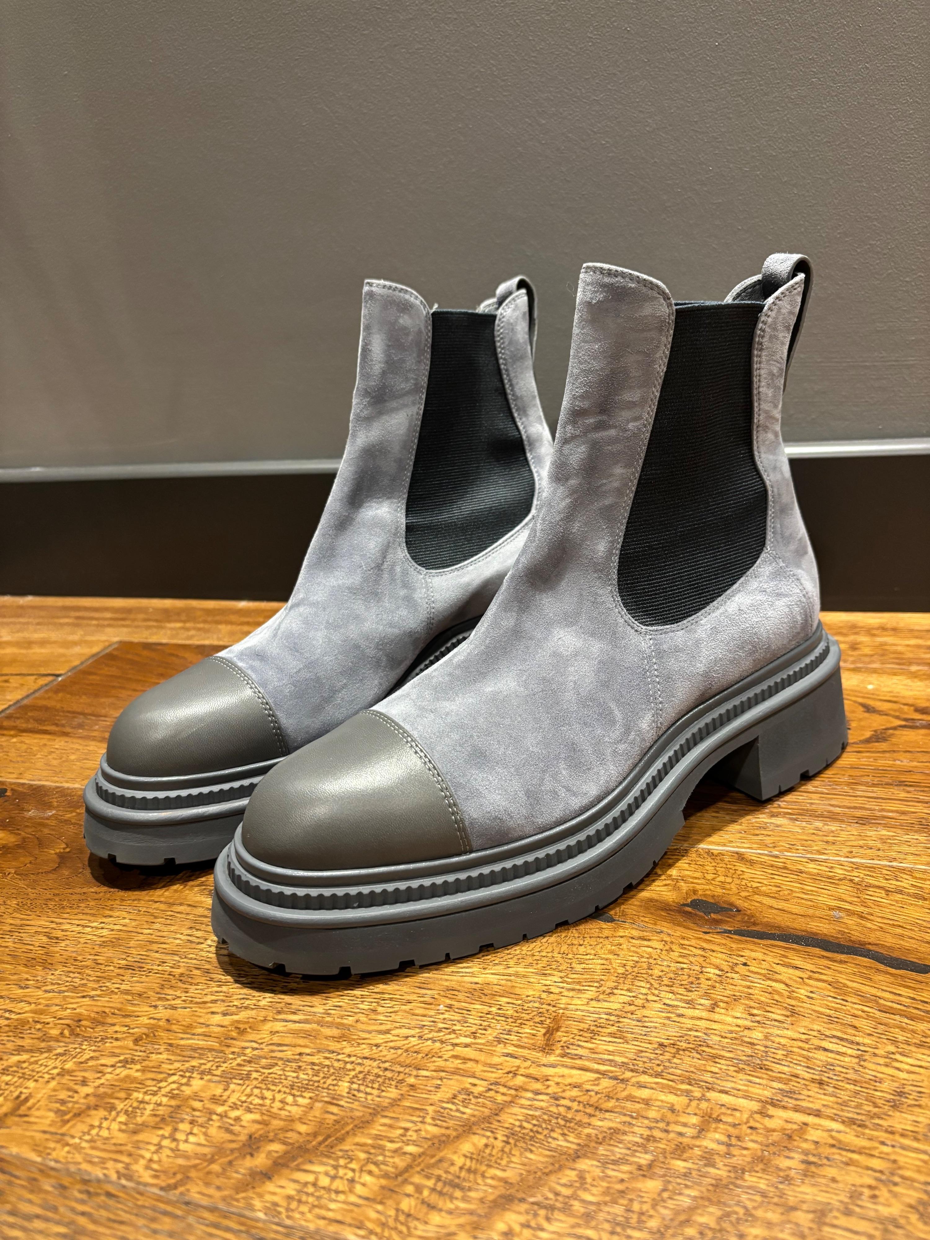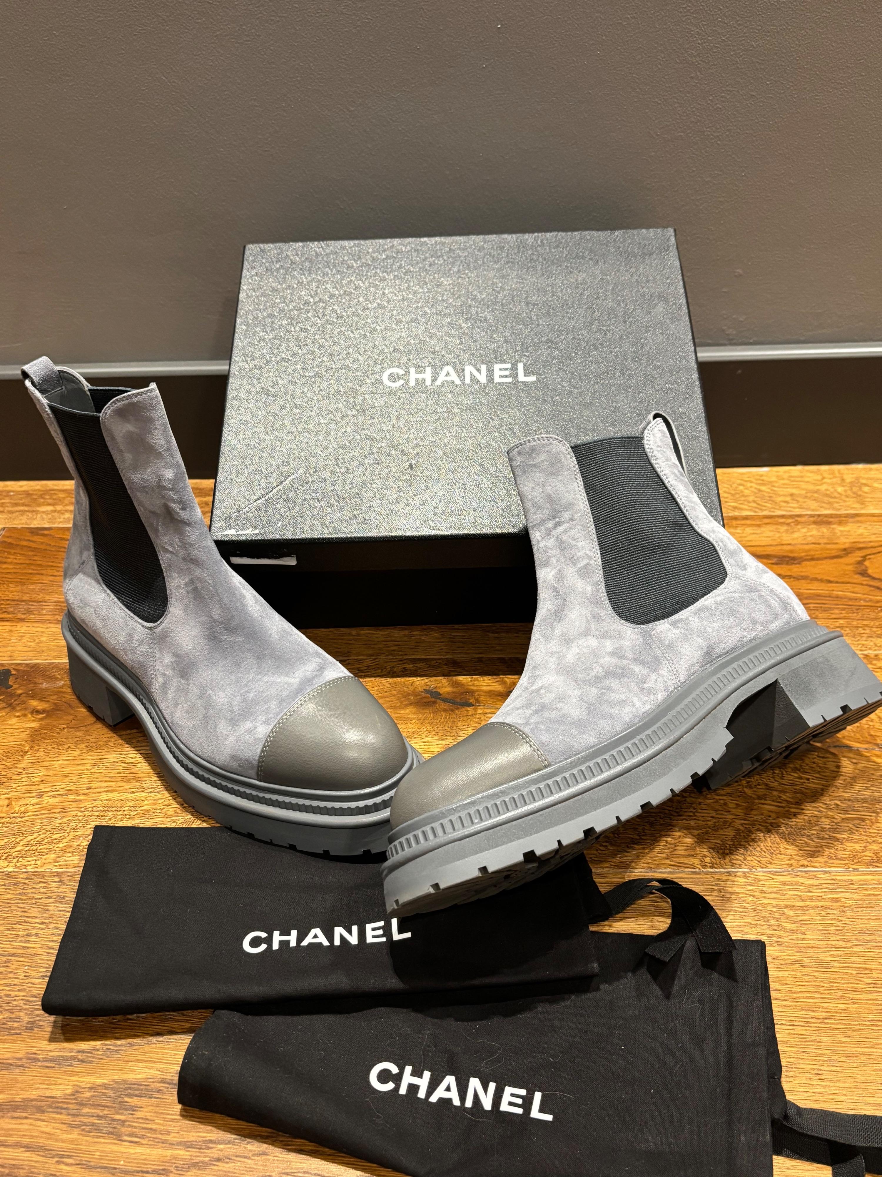 Chanel grey suede and leather cap toe Chelsea boots with elastic side panels and a chunky lug sole. Includes original box and dust bags. Made in Italy.