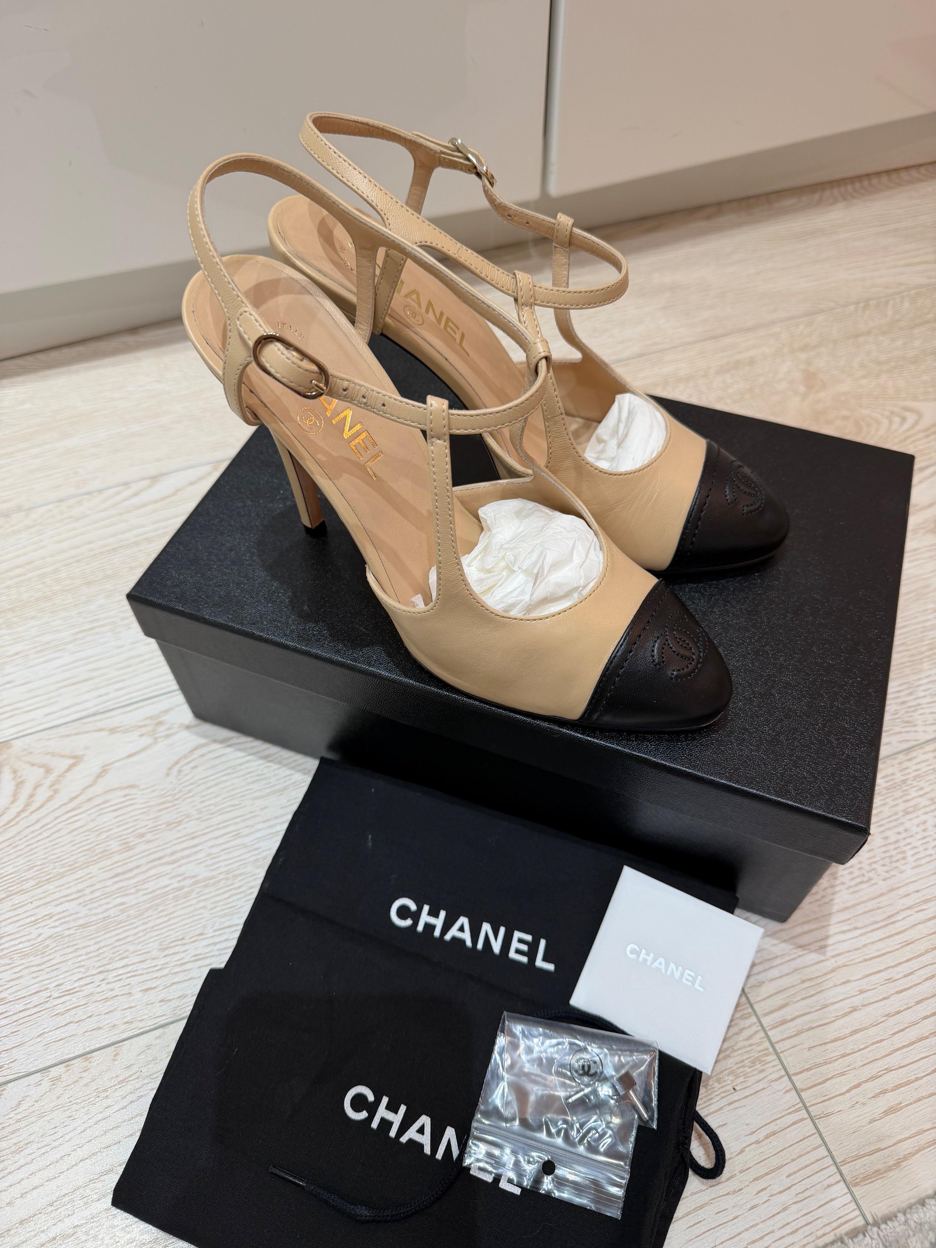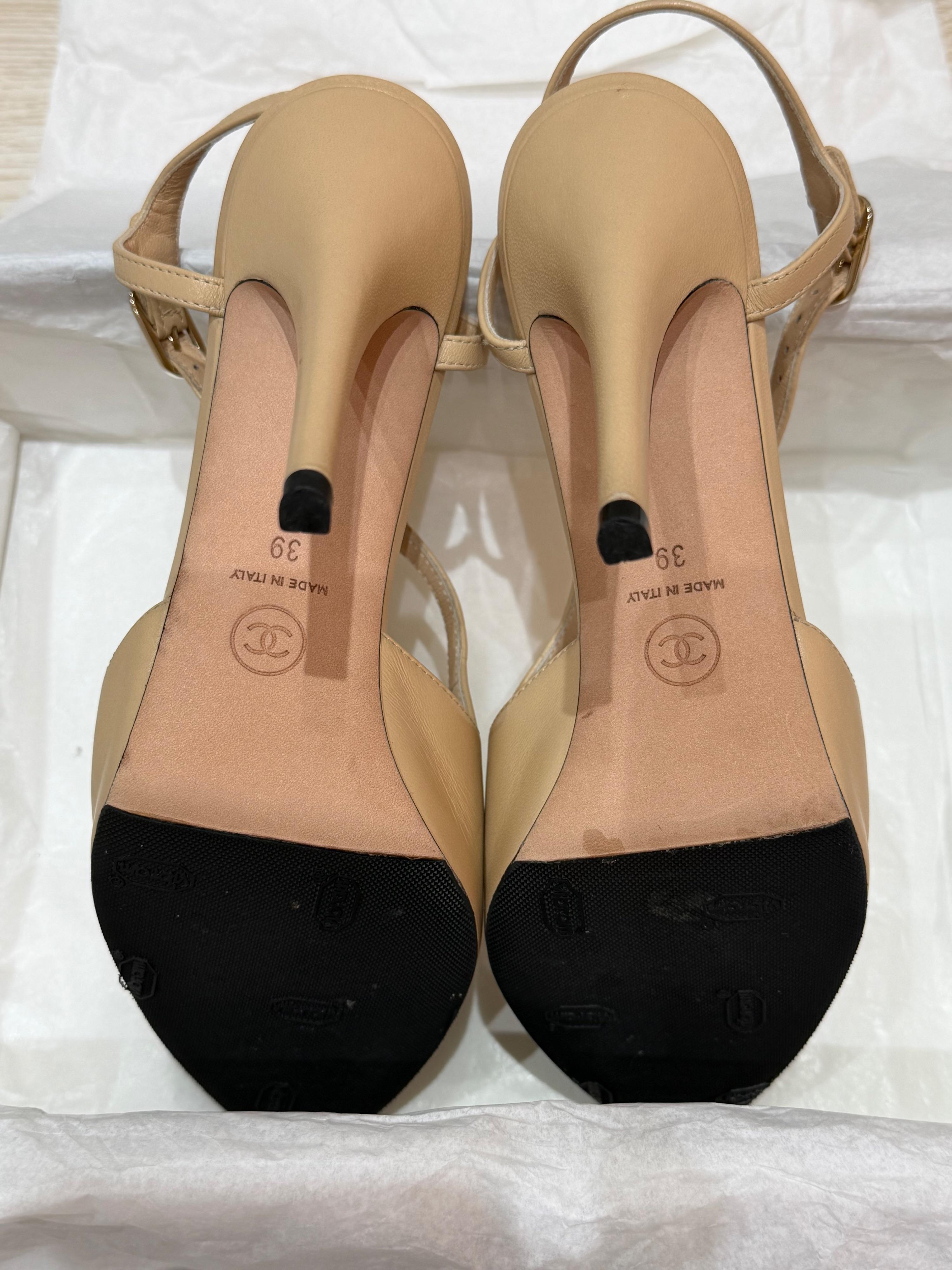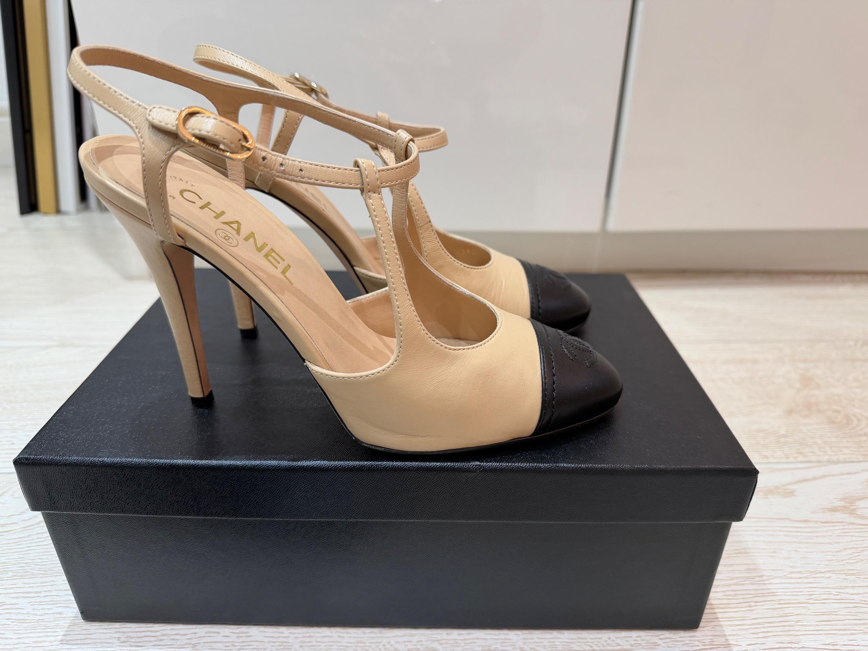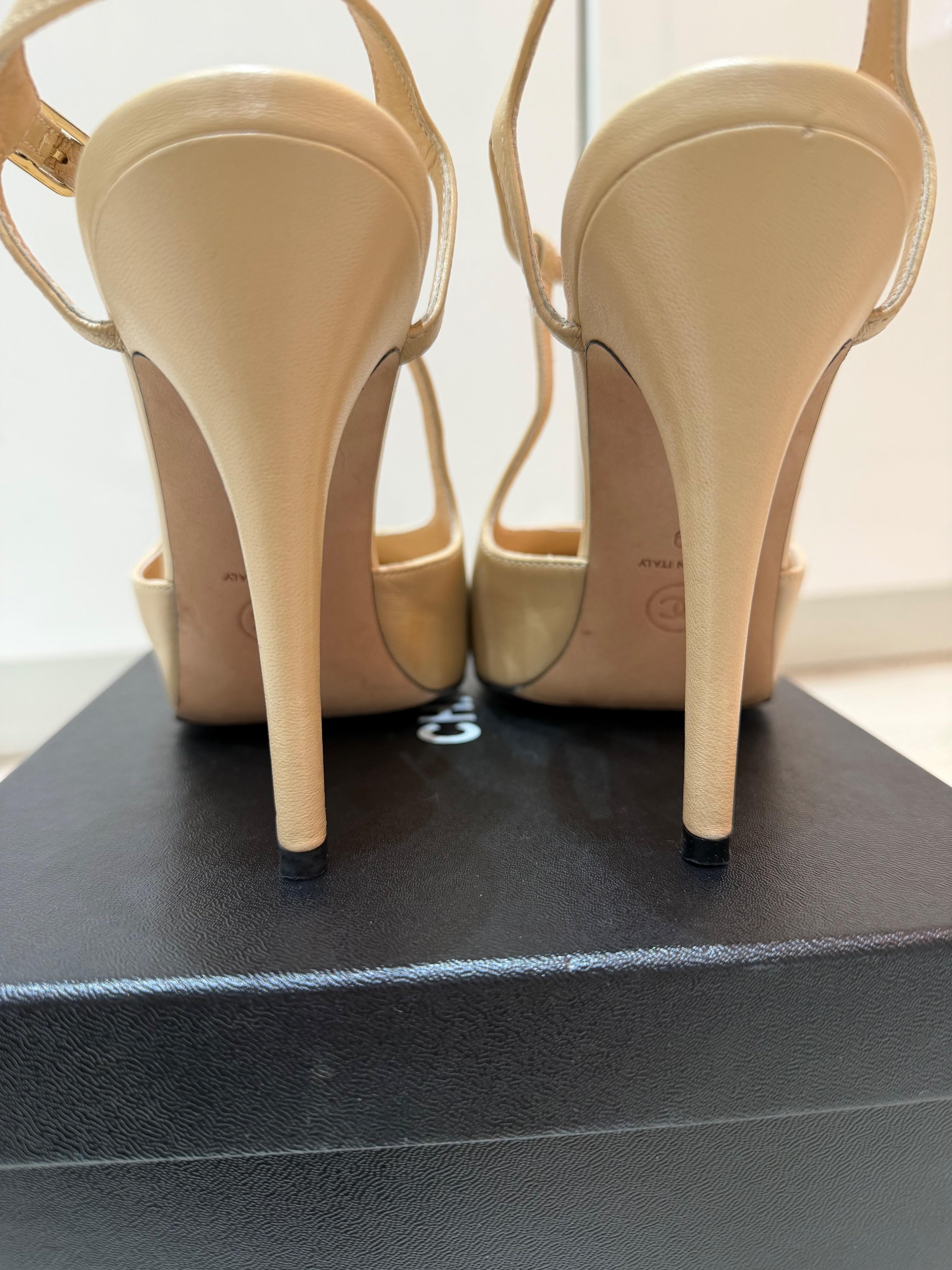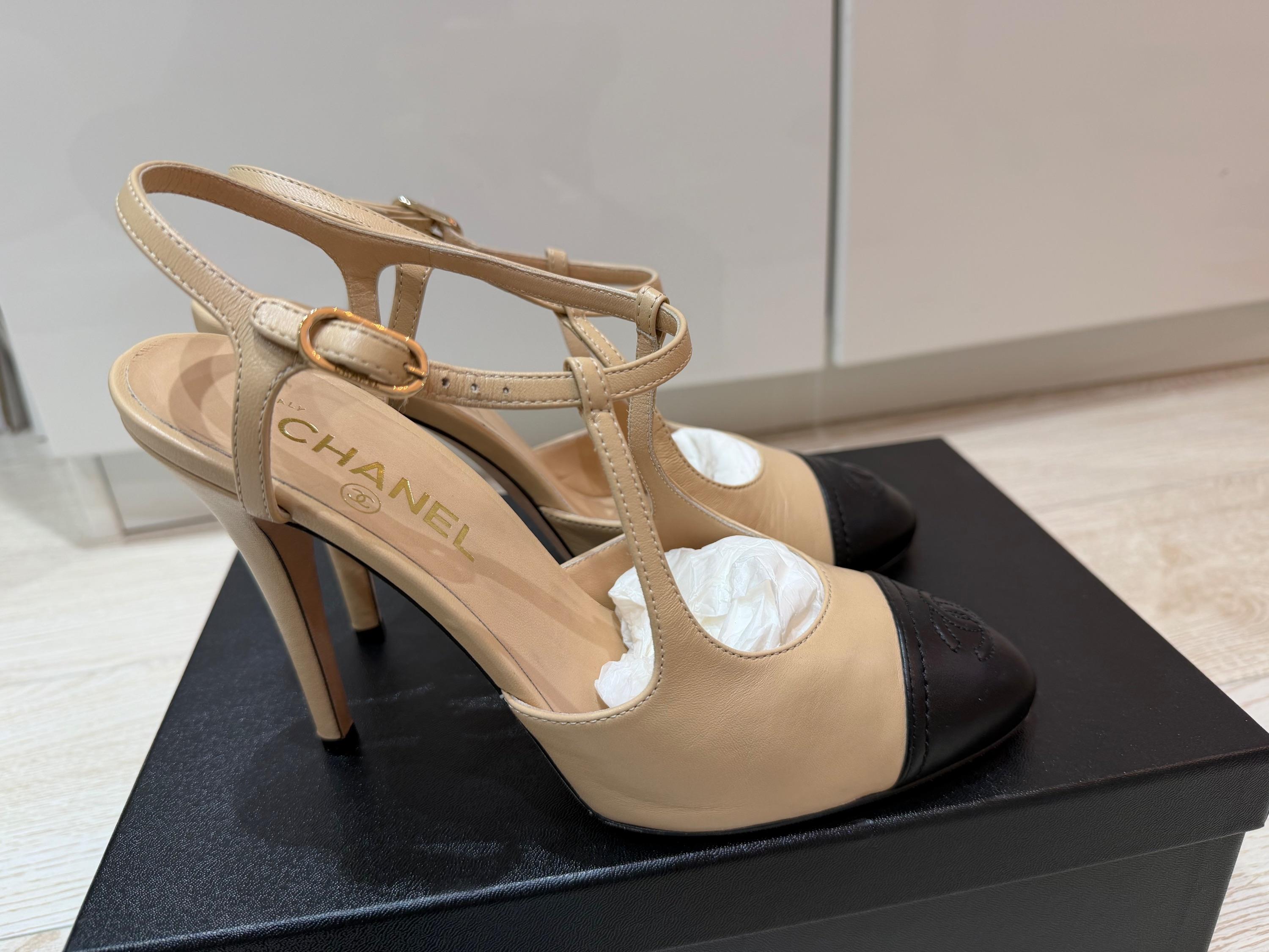 Beautiful leather Chanel pumps. Hardly used. Come with box, dust bag, authenticity card and extra Chanel heals. The heal had an extra rubber layer added by Harrods cobblers at purchase to make it more comfortable to walk in. Really comfortable pumps. 12cm high heals. Beautiful shoes.