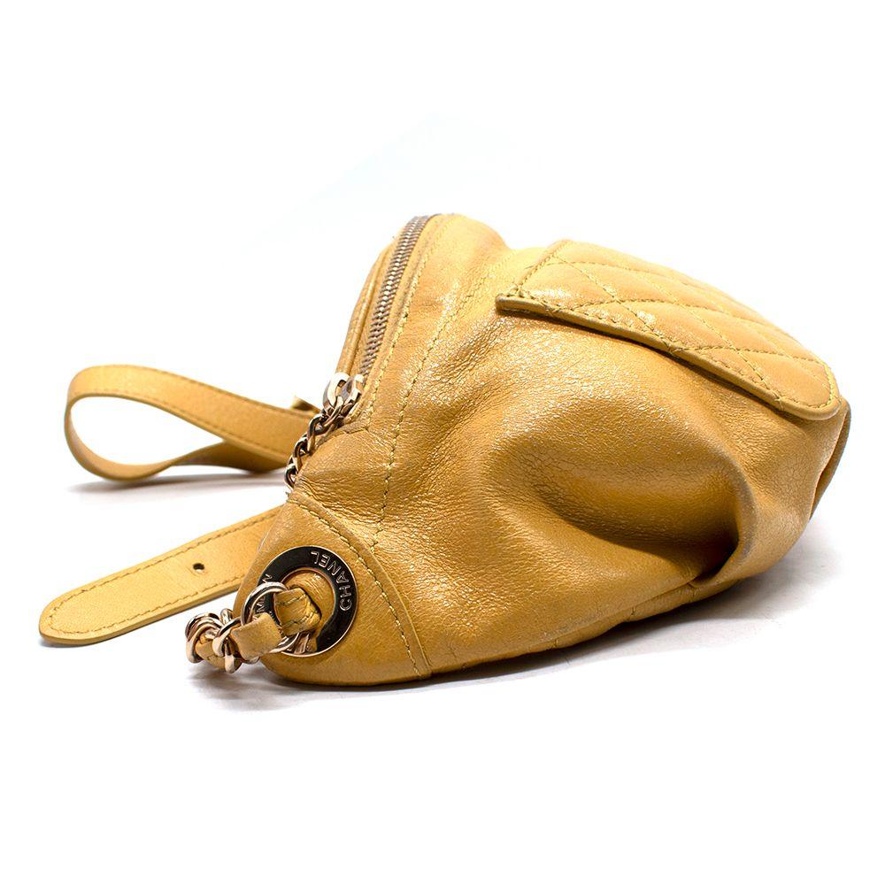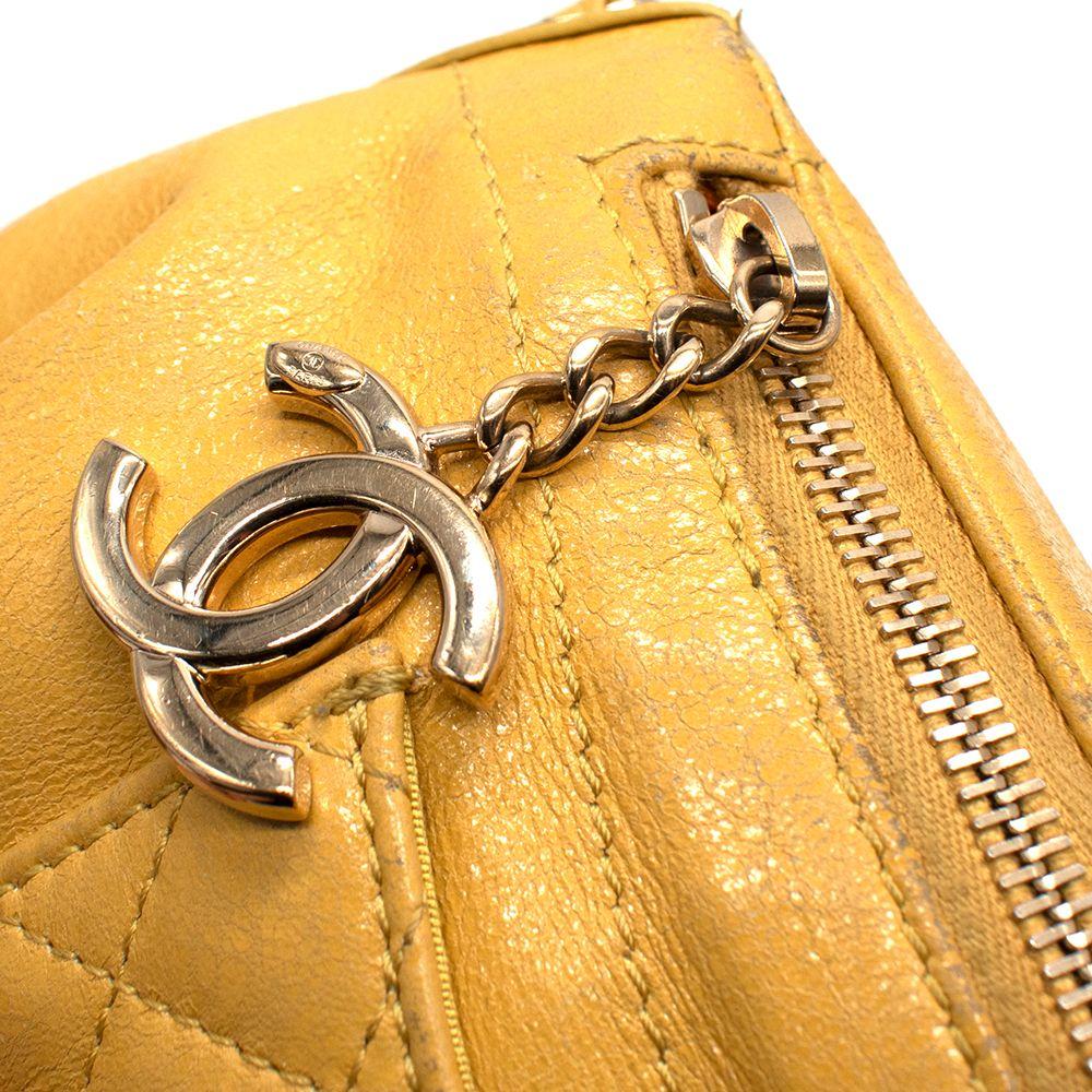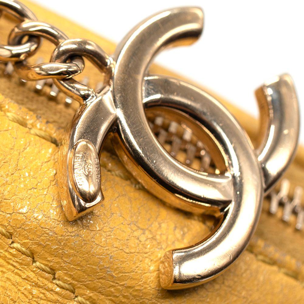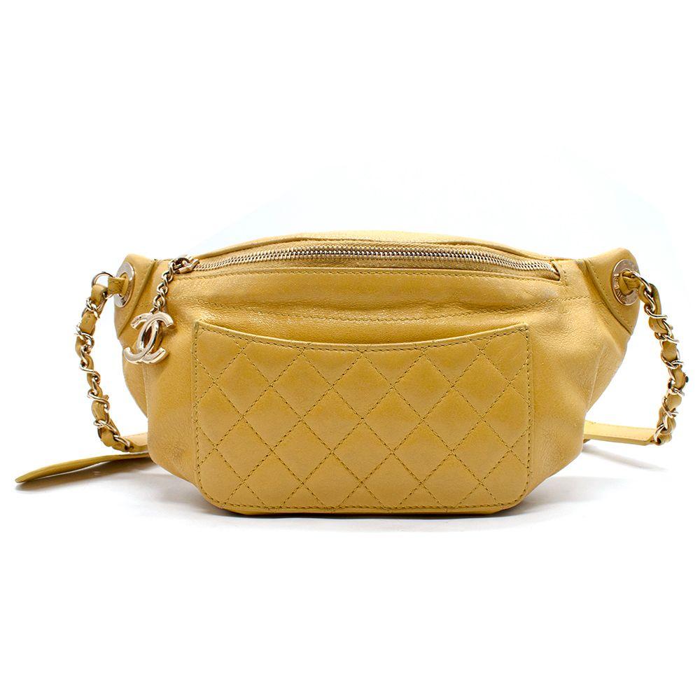Features an adjustable chain and leather waist strap, exterior back wall zipper pocket and front wall patch pocket, zipper closure with CC charm, and one interior patch pocket