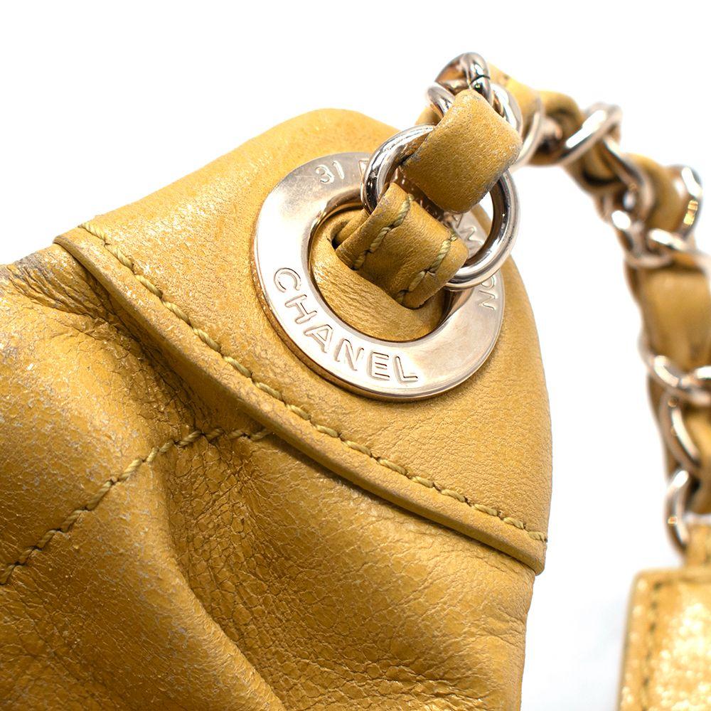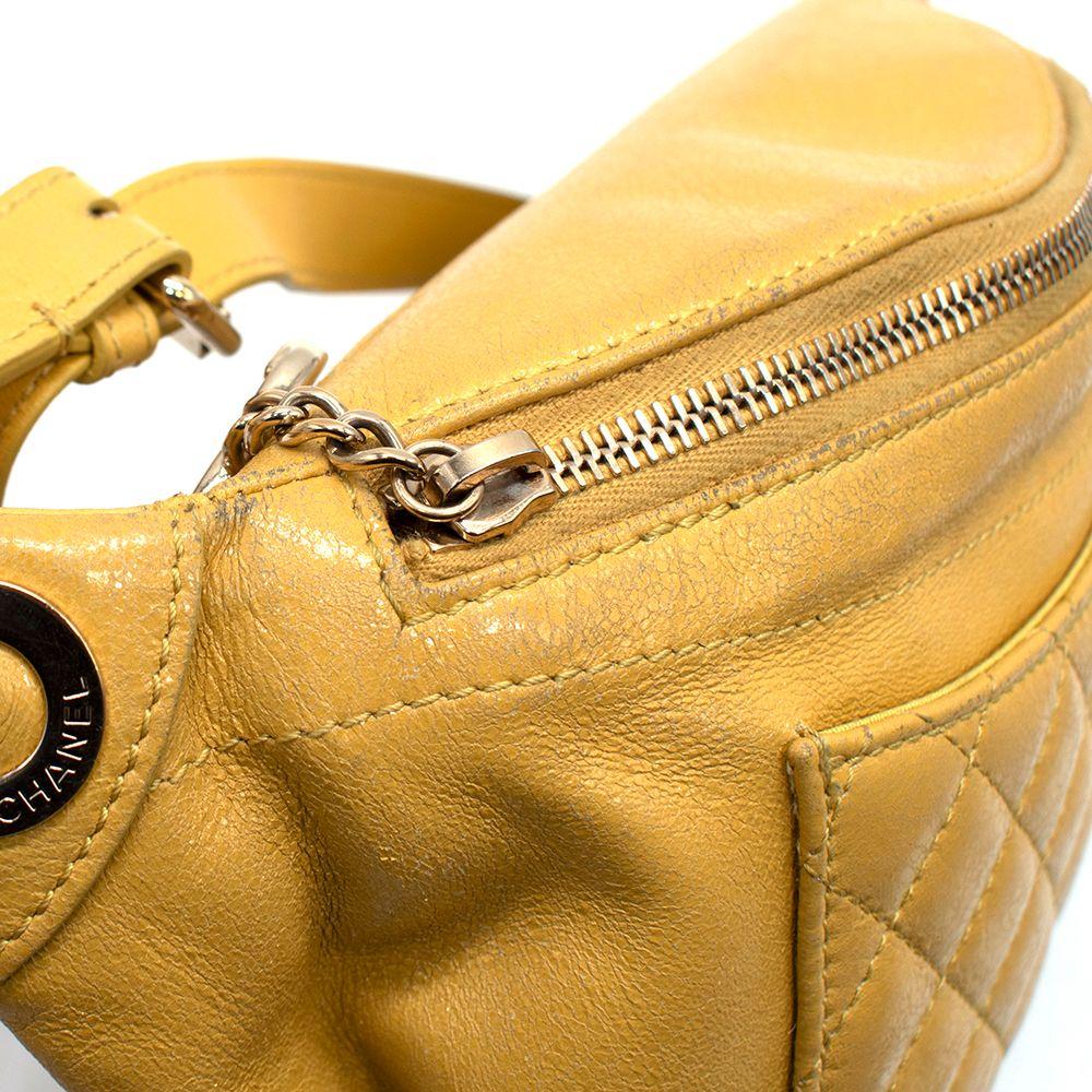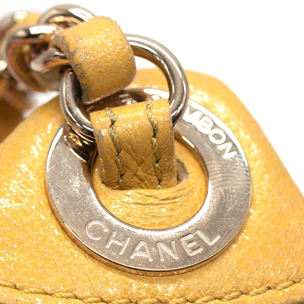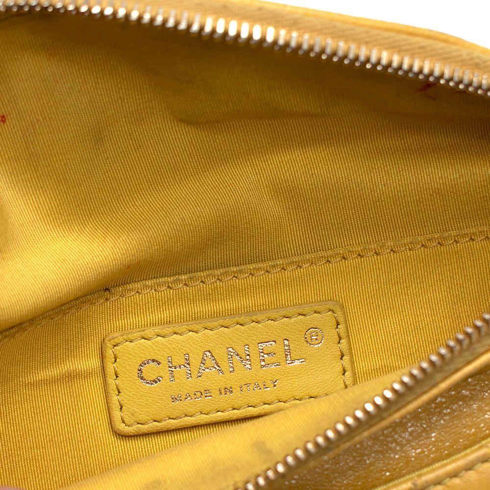 Features an adjustable chain and leather waist strap, exterior back wall zipper pocket and front wall patch pocket, zipper closure with CC charm, and one interior patch pocket
