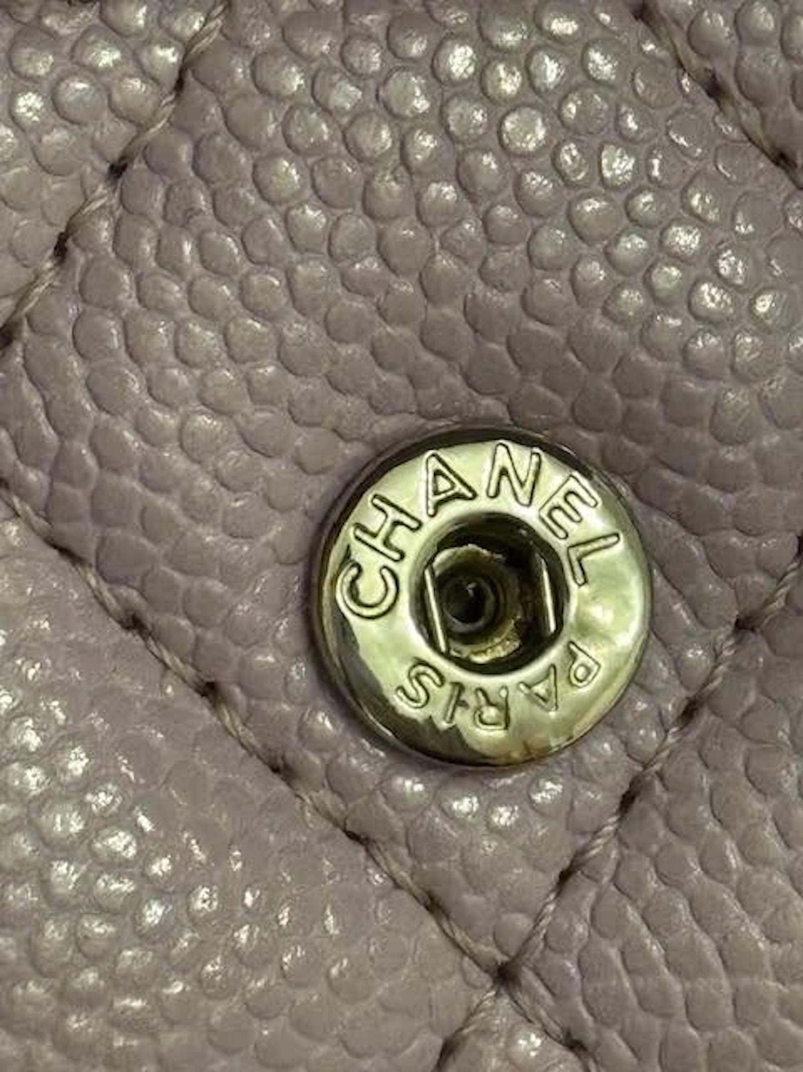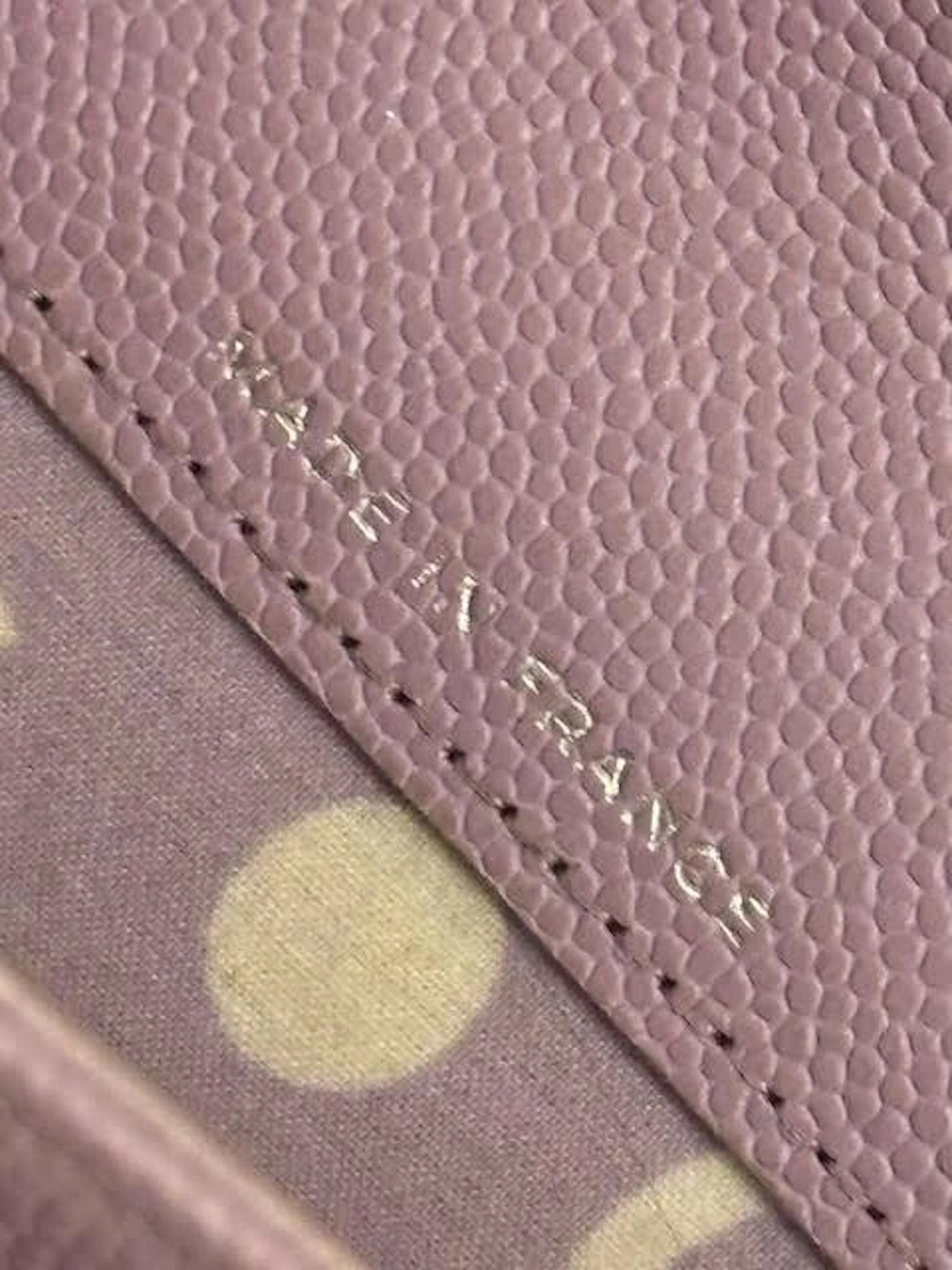 Chanel 24P purple Lilac caviar snap opening card holder wallet in large CC silver logo. It has the classic engraving Coco Chanel on the CC logo . This is so chic and can go with your essential stuff. When opening it has beautiful abstract lining inside and does make you smile.