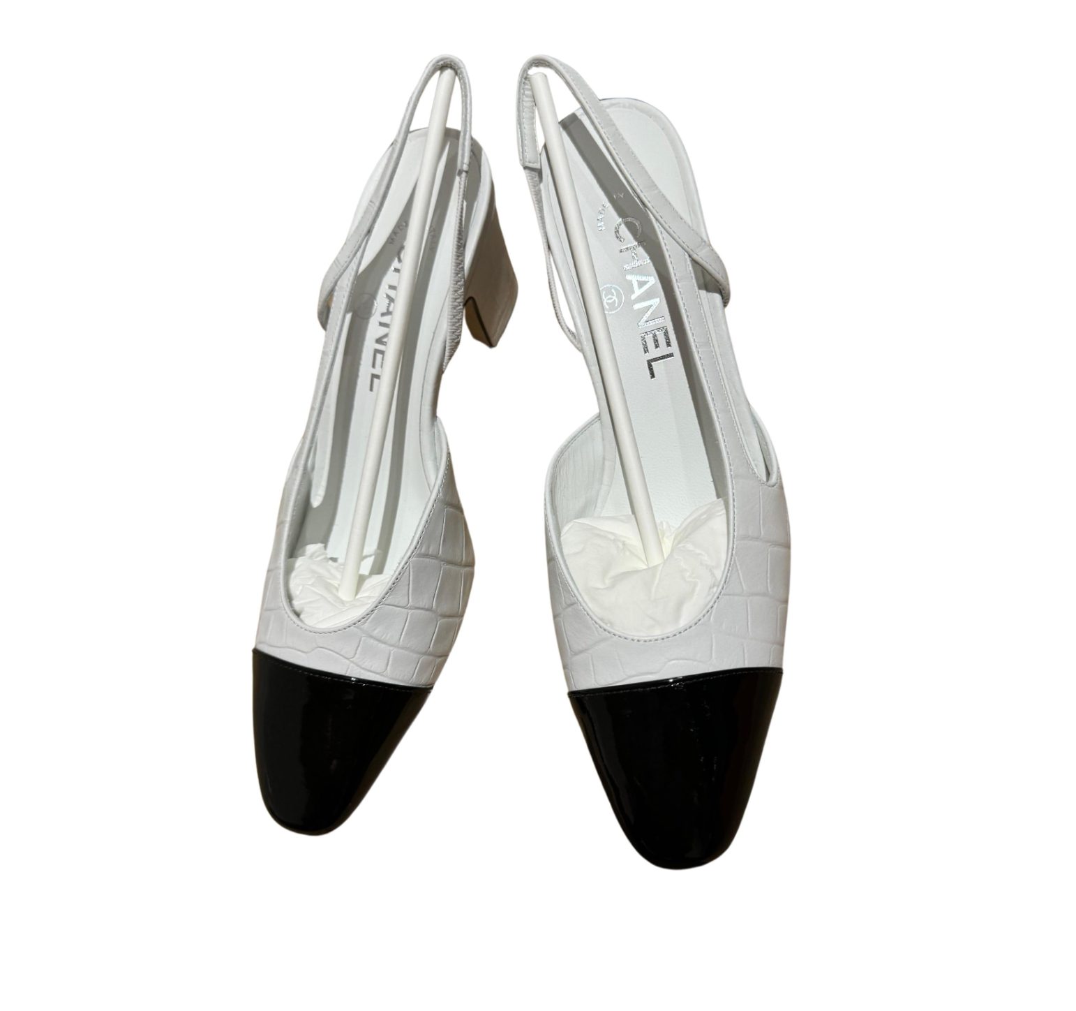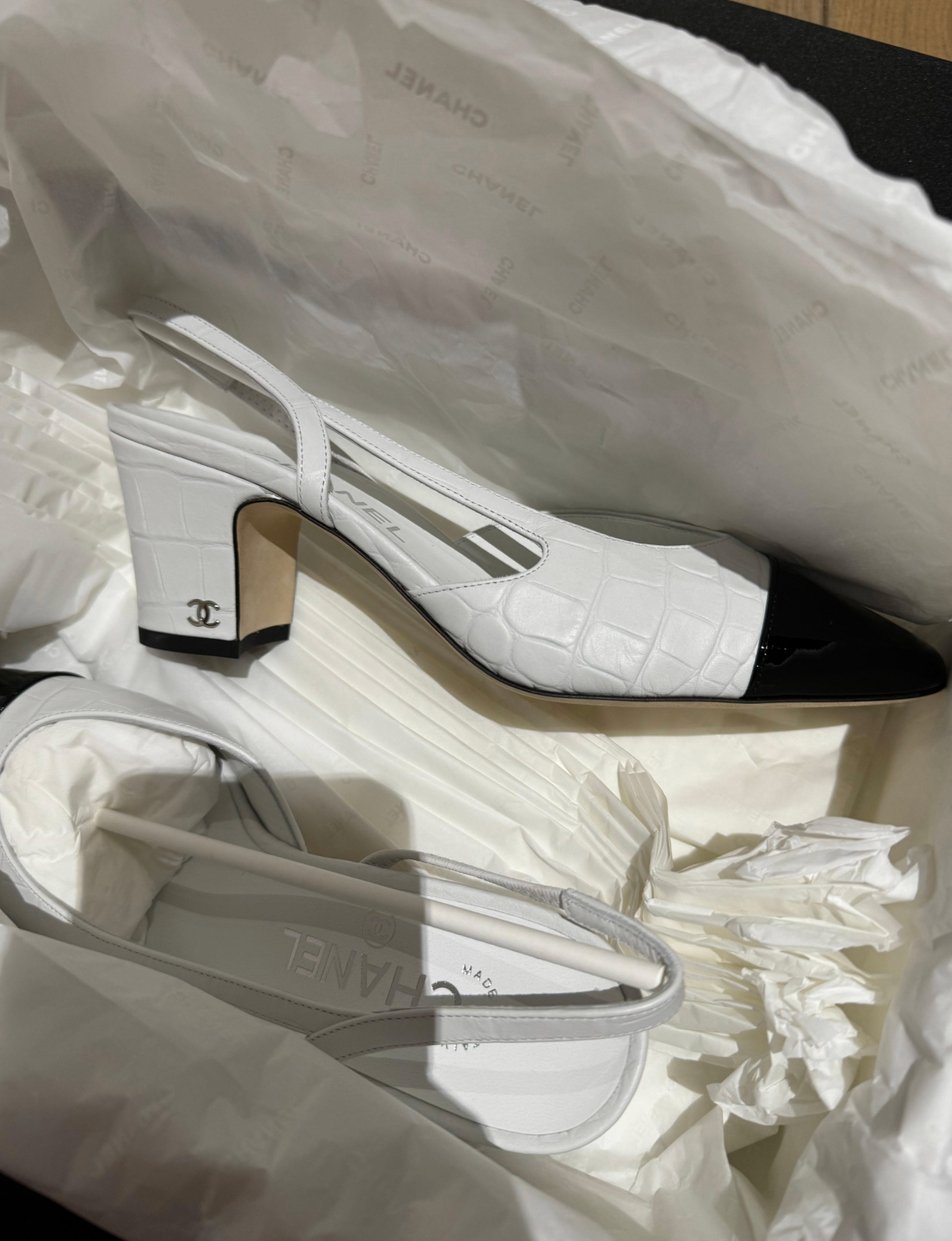 Chanel slingback sandals in white ( crocodile pattern) and black. Sold out very limited. Size 38.5c new in box and dustbags.