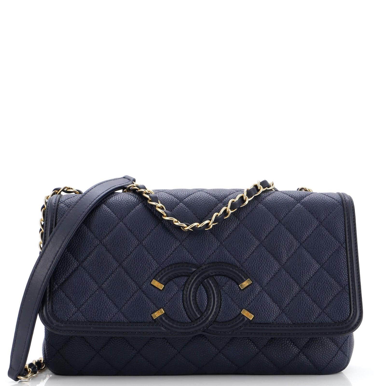 CHANEL 2016 Filigree Medium Flap Quilted Caviar Bag is a timeless and sophisticated bag crafted from luxurious caviar leather in a deep navy blue shade. This elegant piece features a filigree design with vintage gold-tone hardware, offering both functionality and style. The rich red leather interior adds a touch of contrast to its refined exterior.