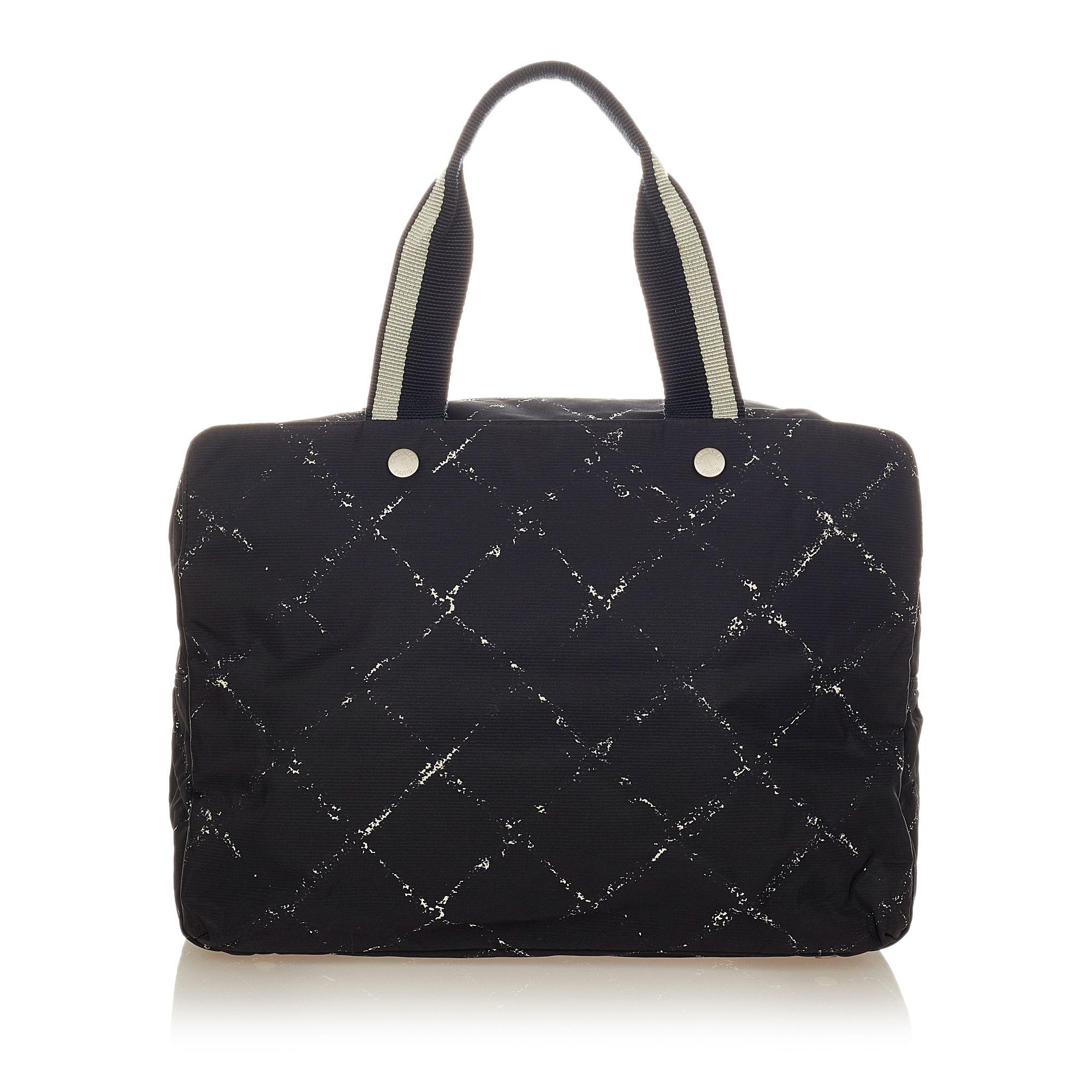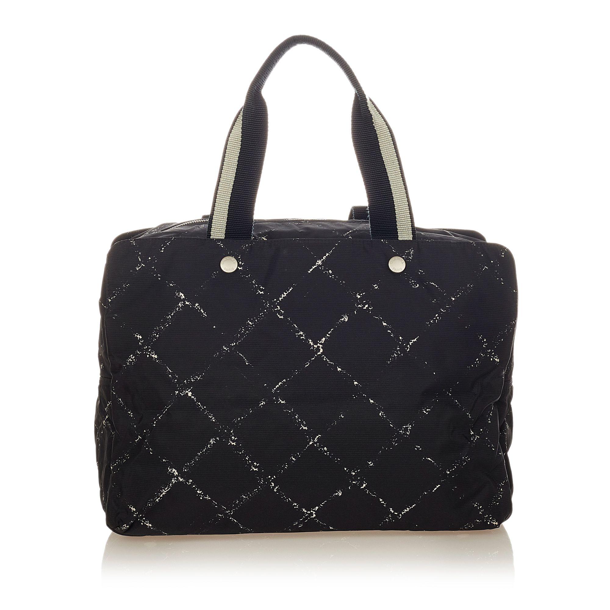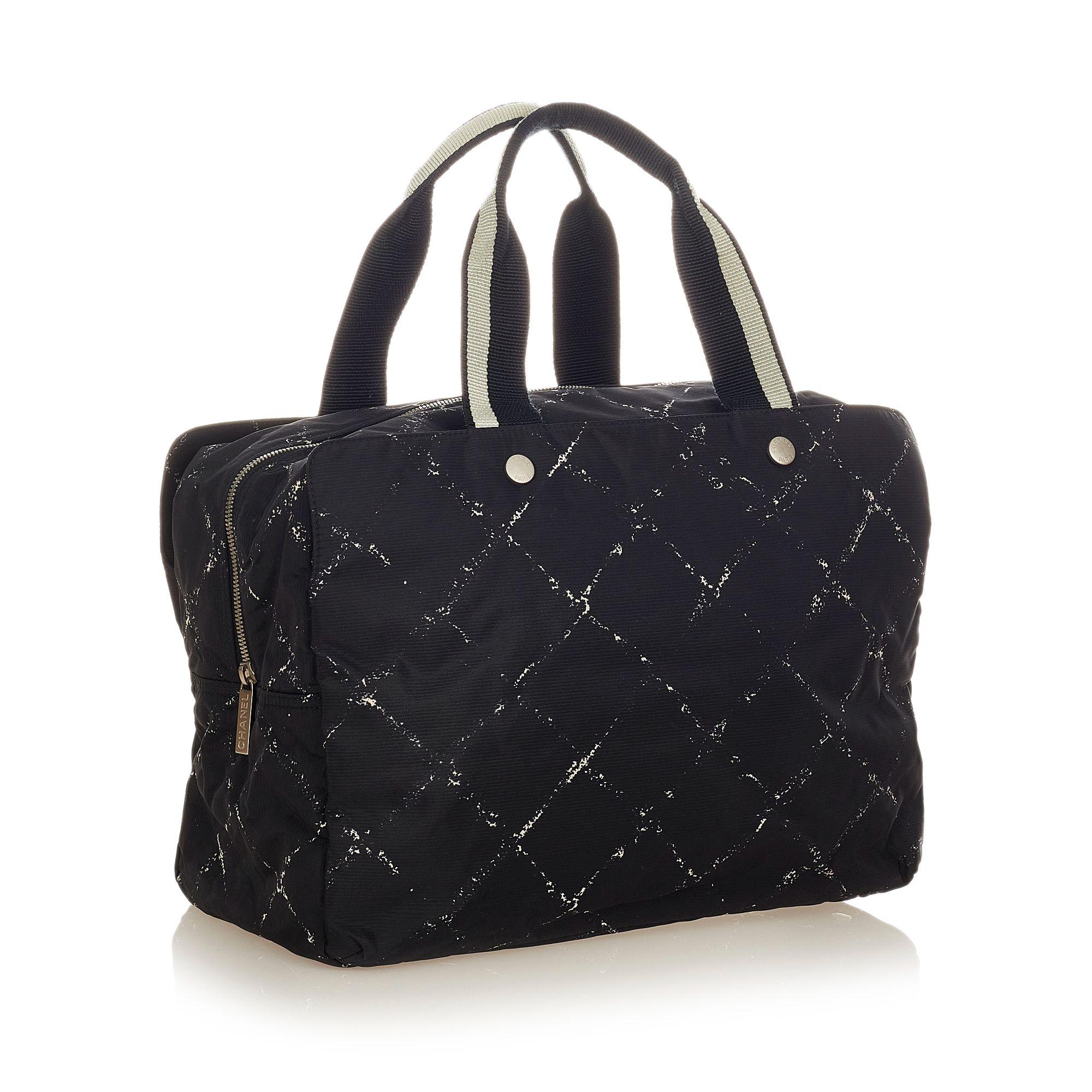 The Old Travel Line handbag features a nylon body, flat straps, a top zip closure, and interior zip pockets.